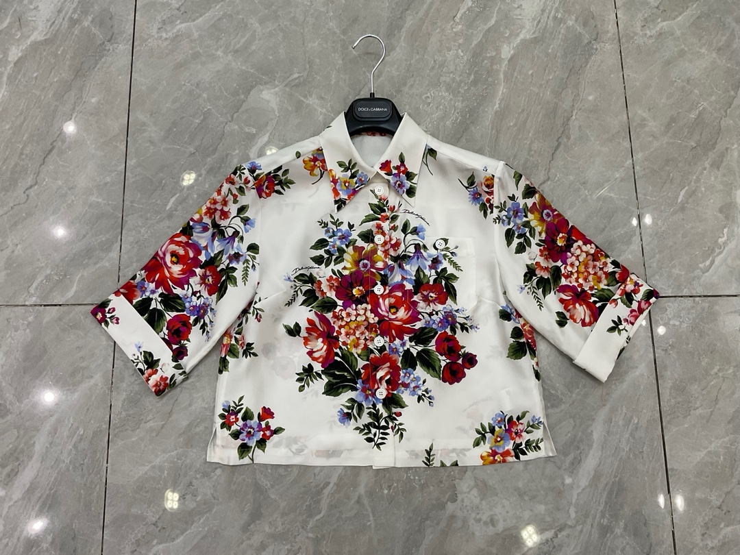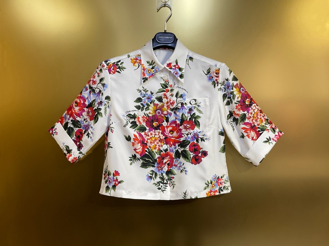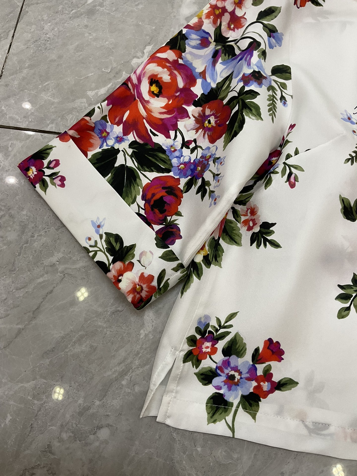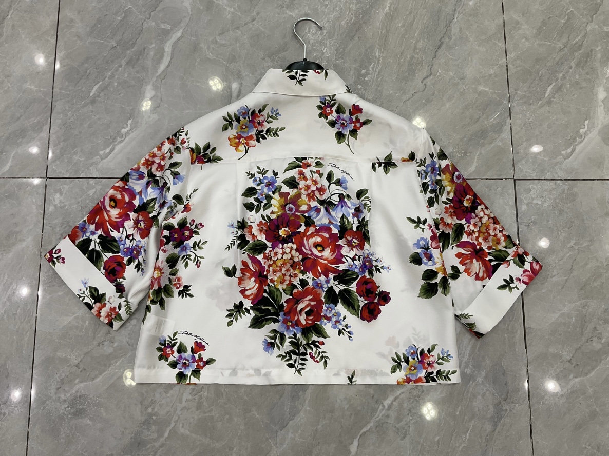 Details: 16 momme real silk twill short-sleeved fashion shirt with white background and large flowers, multiple sizes.