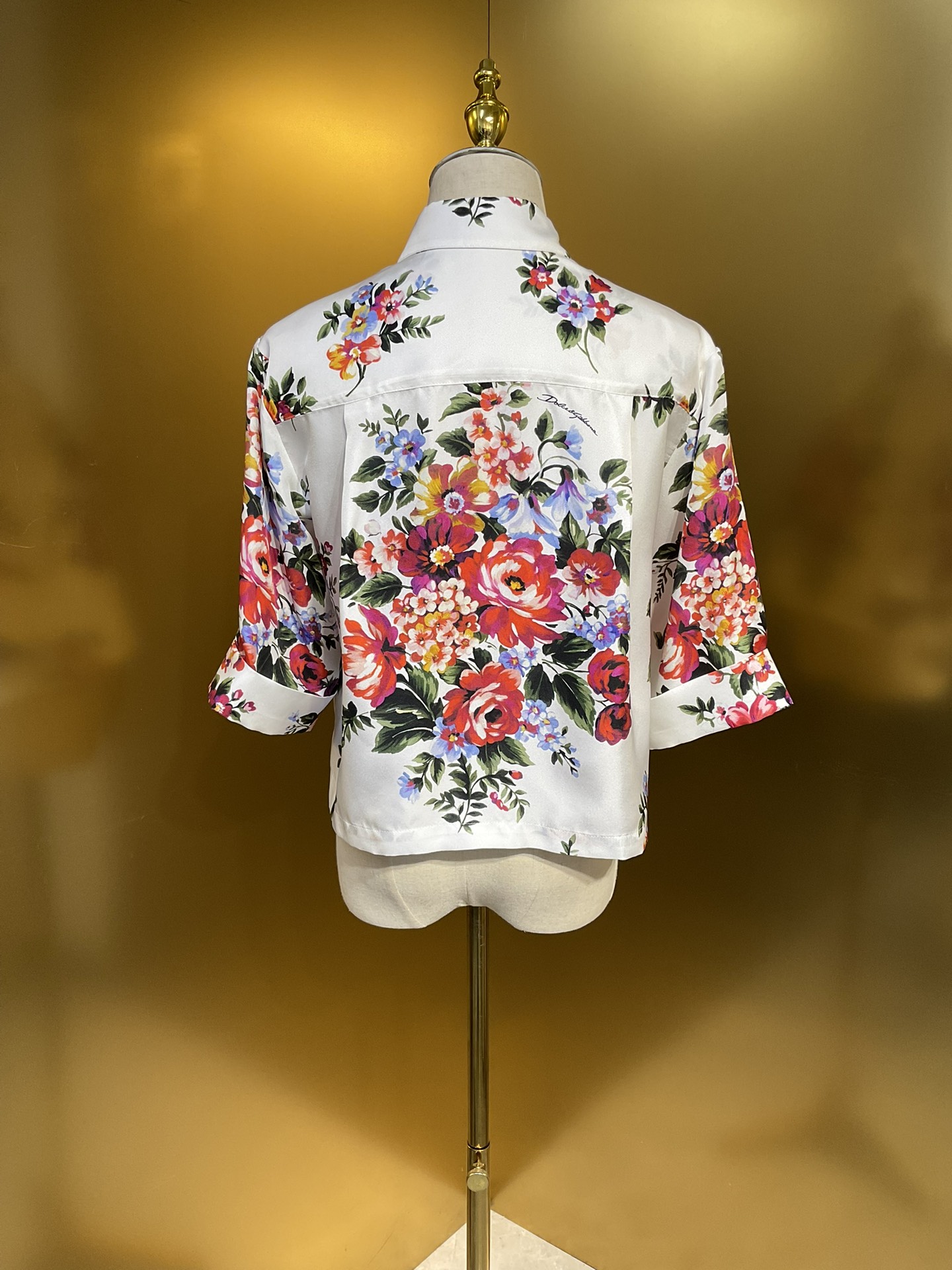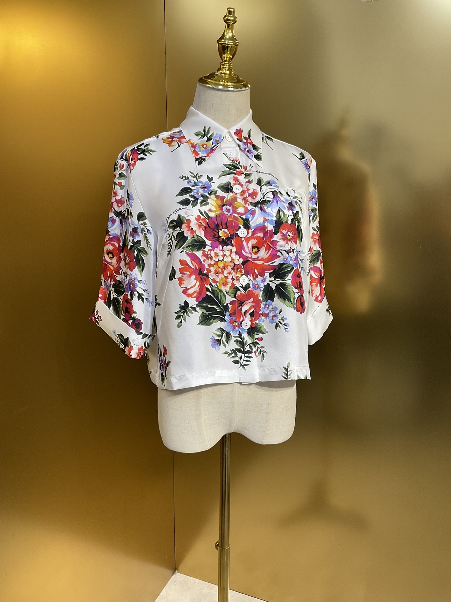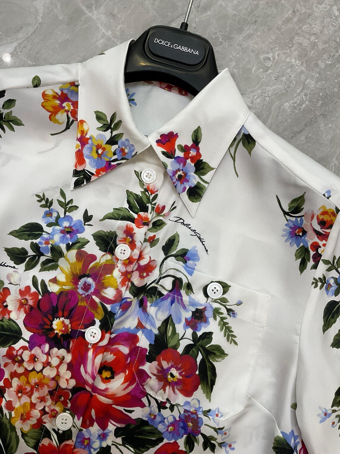 Details: 16 momme real silk twill short-sleeved fashion shirt with white background and large flowers, multiple sizes.