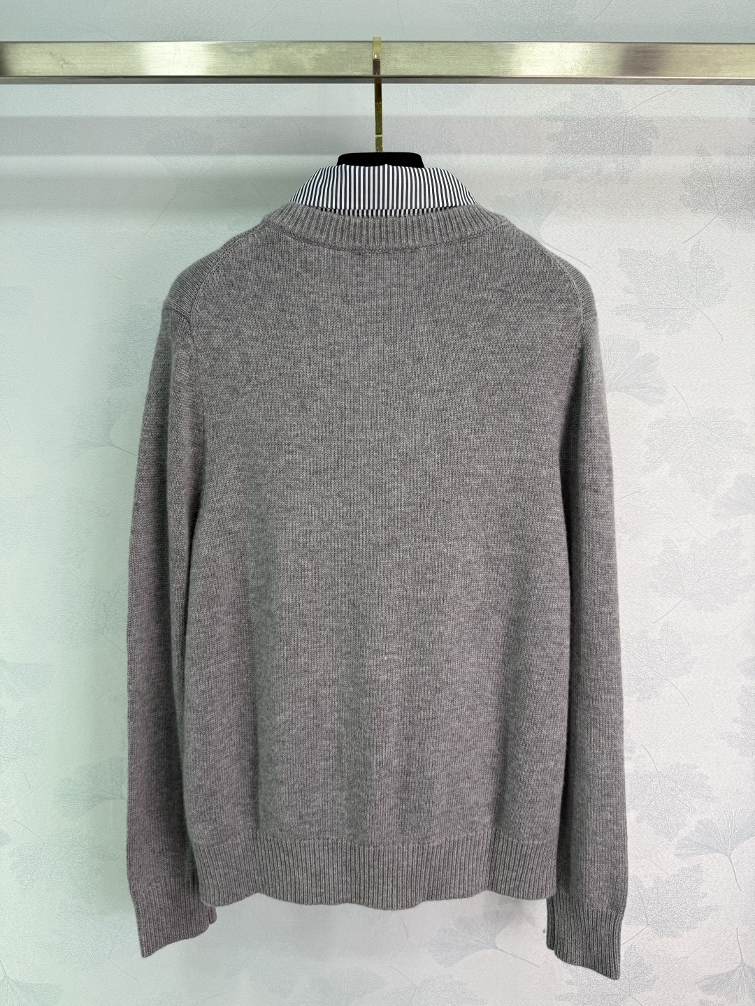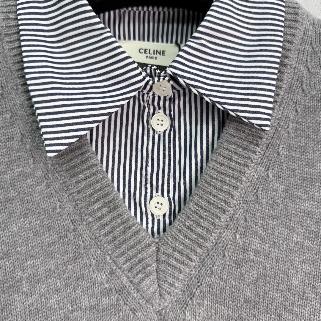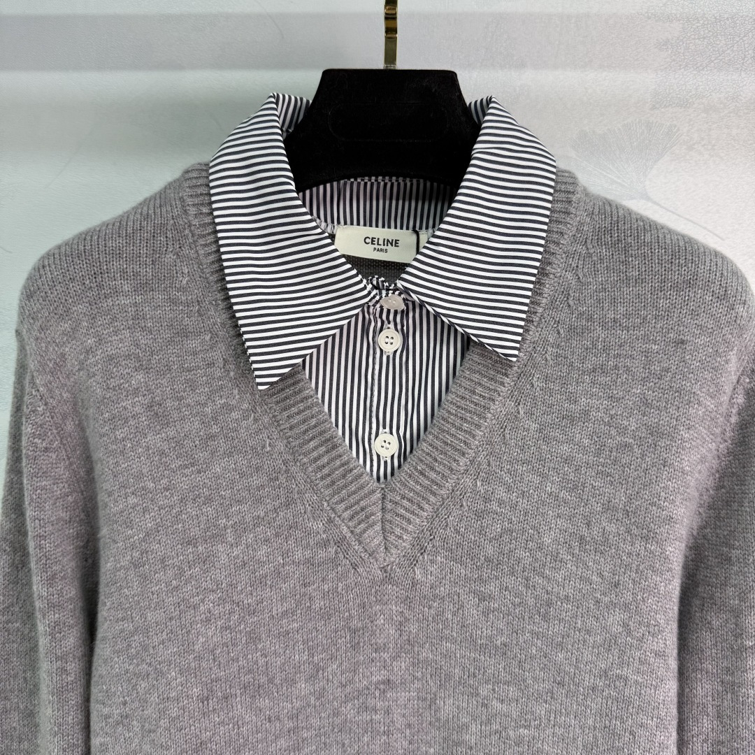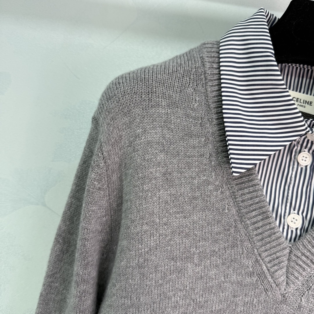 Details: Early Autumn Fake Two-Piece V-Neck Wool Sweater with Striped Collar. Soft, Warm and Elegant for a Refined Look