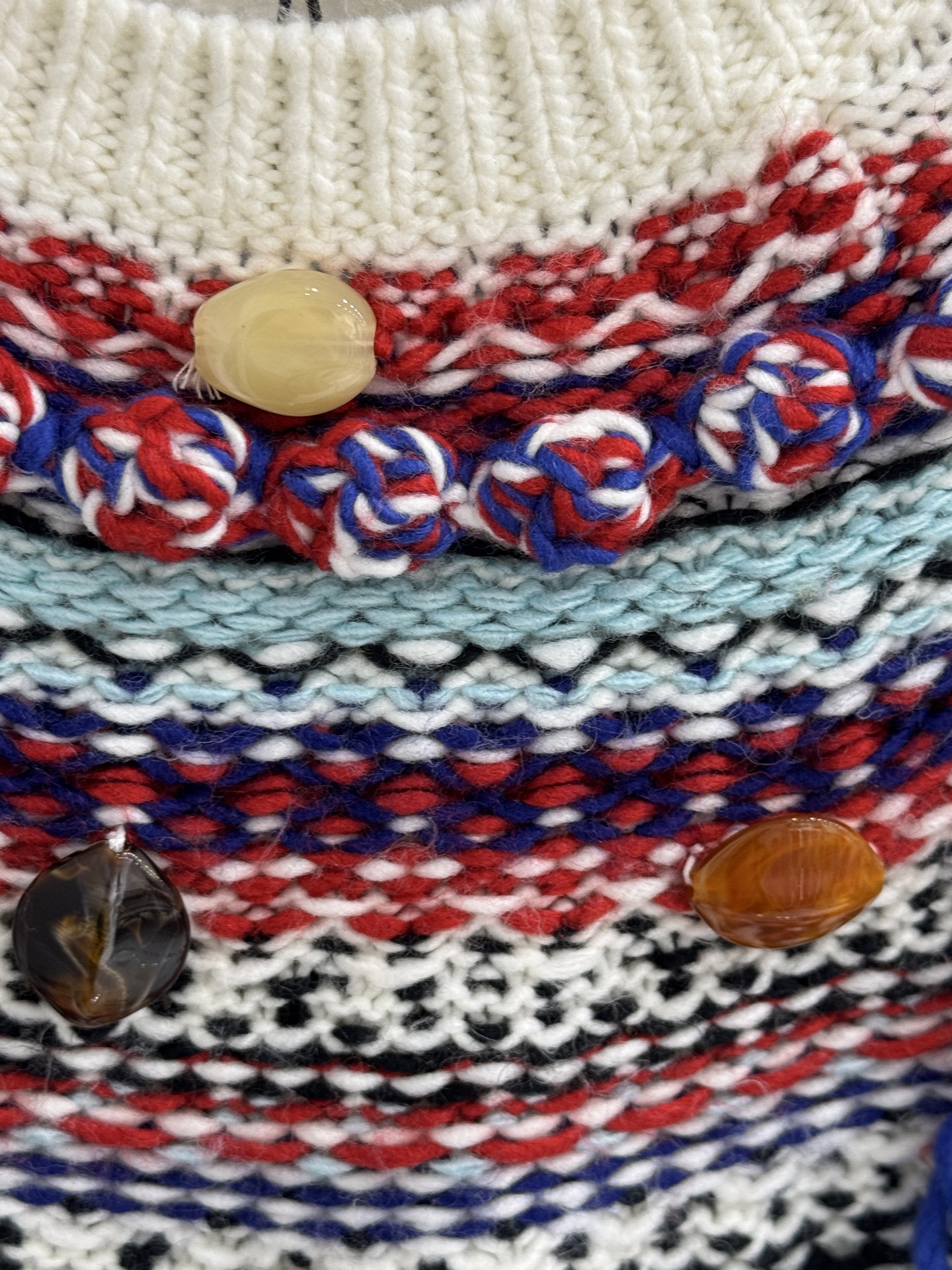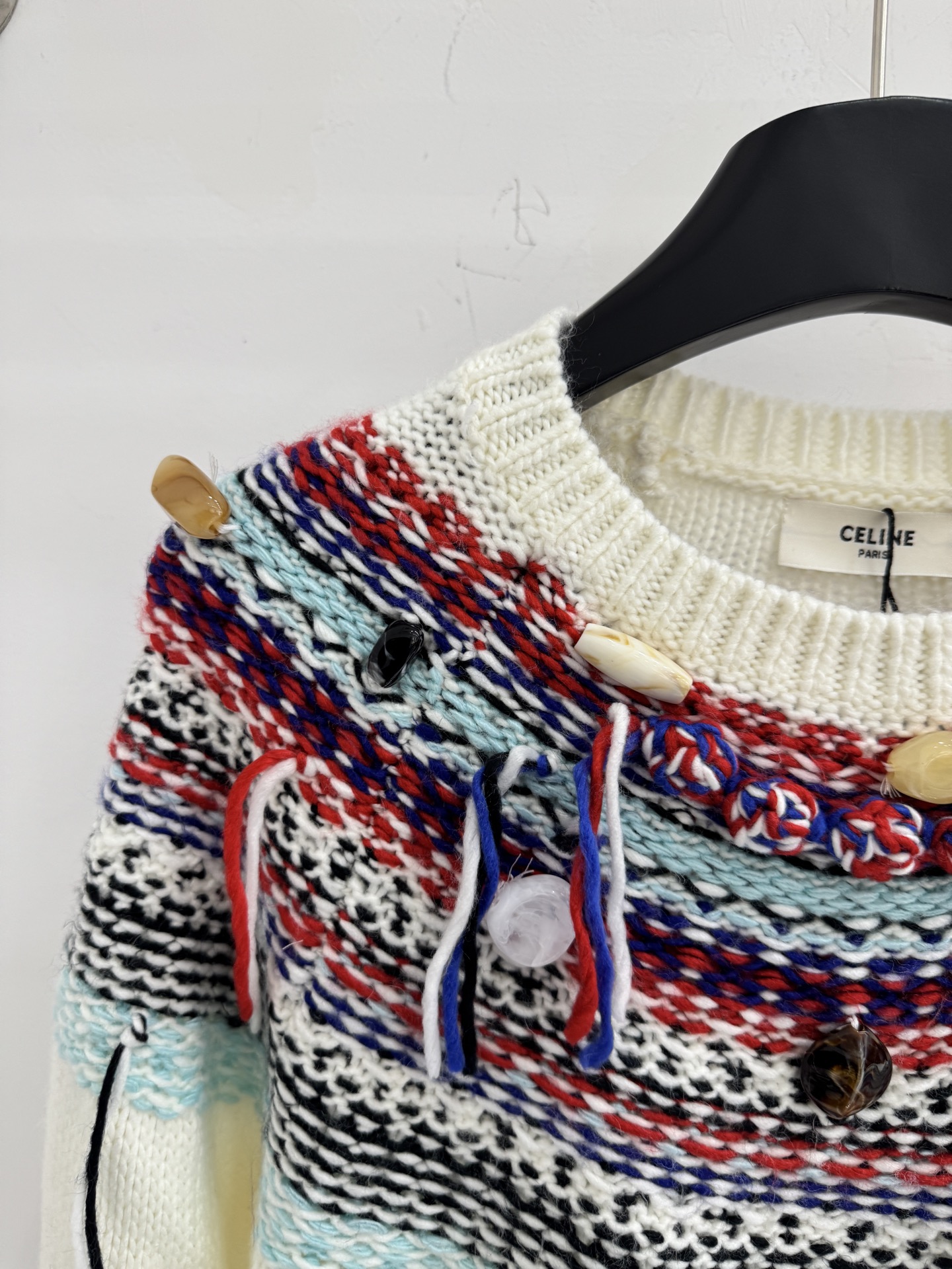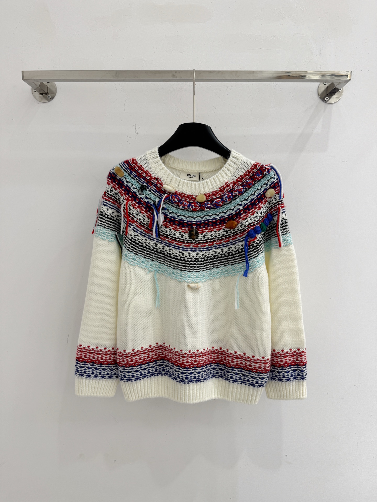 Details: Autumn Fair Isle knitted sweater with tassels and buttons, sizes S-M-L.