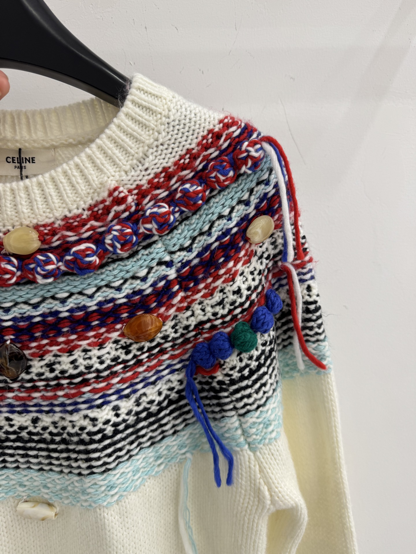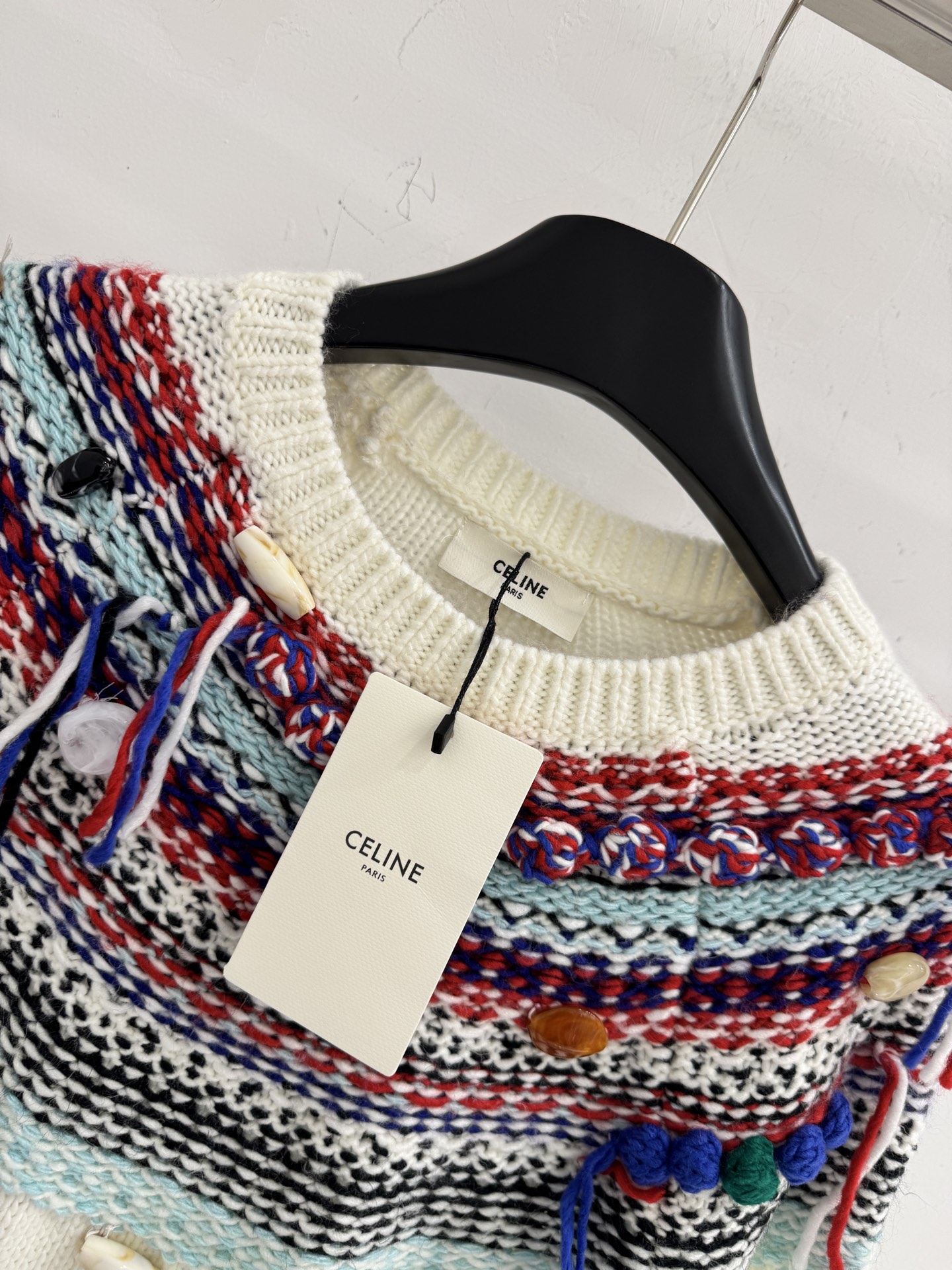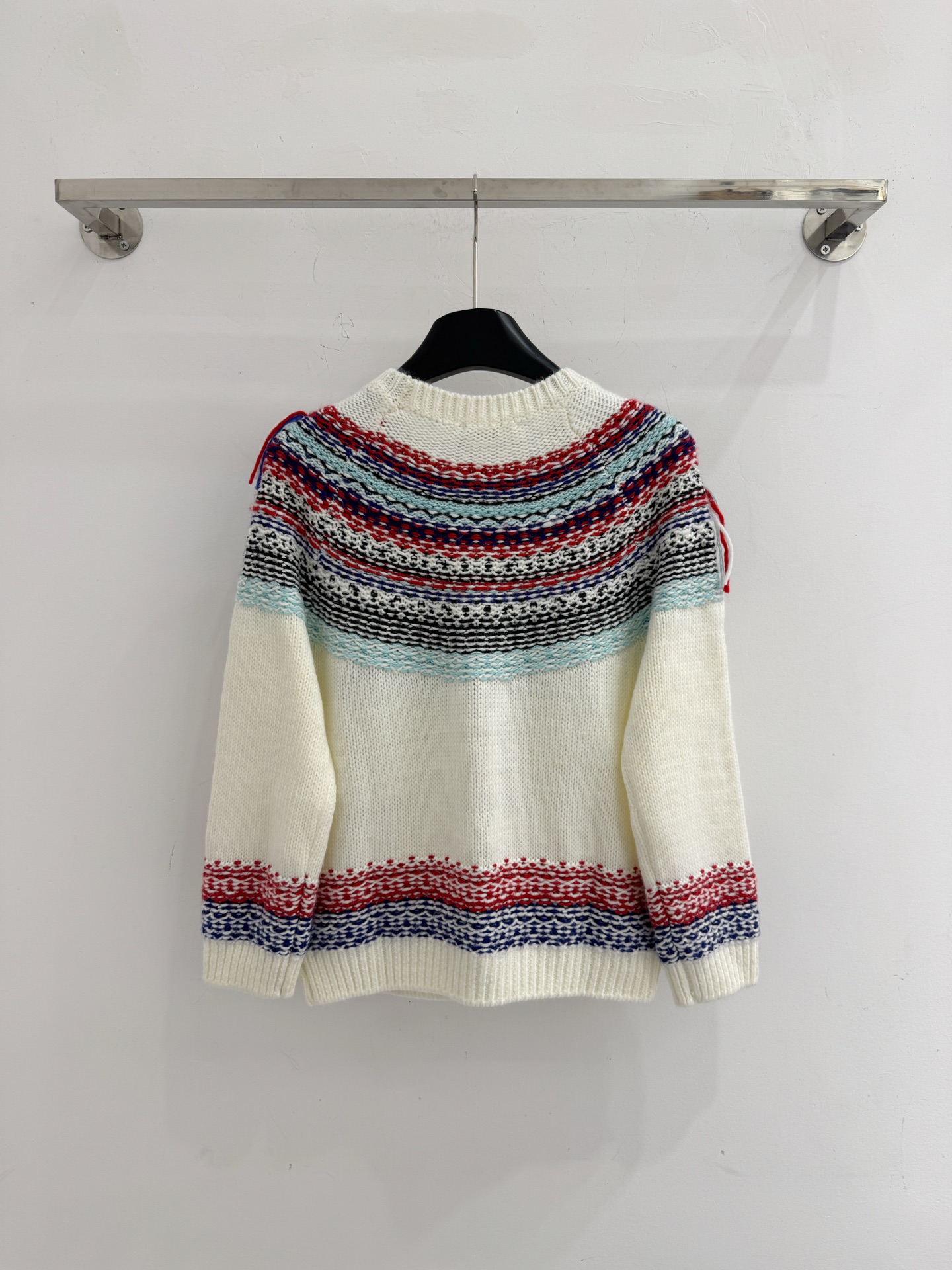 Details: Autumn Fair Isle knitted sweater with tassels and buttons, sizes S-M-L.