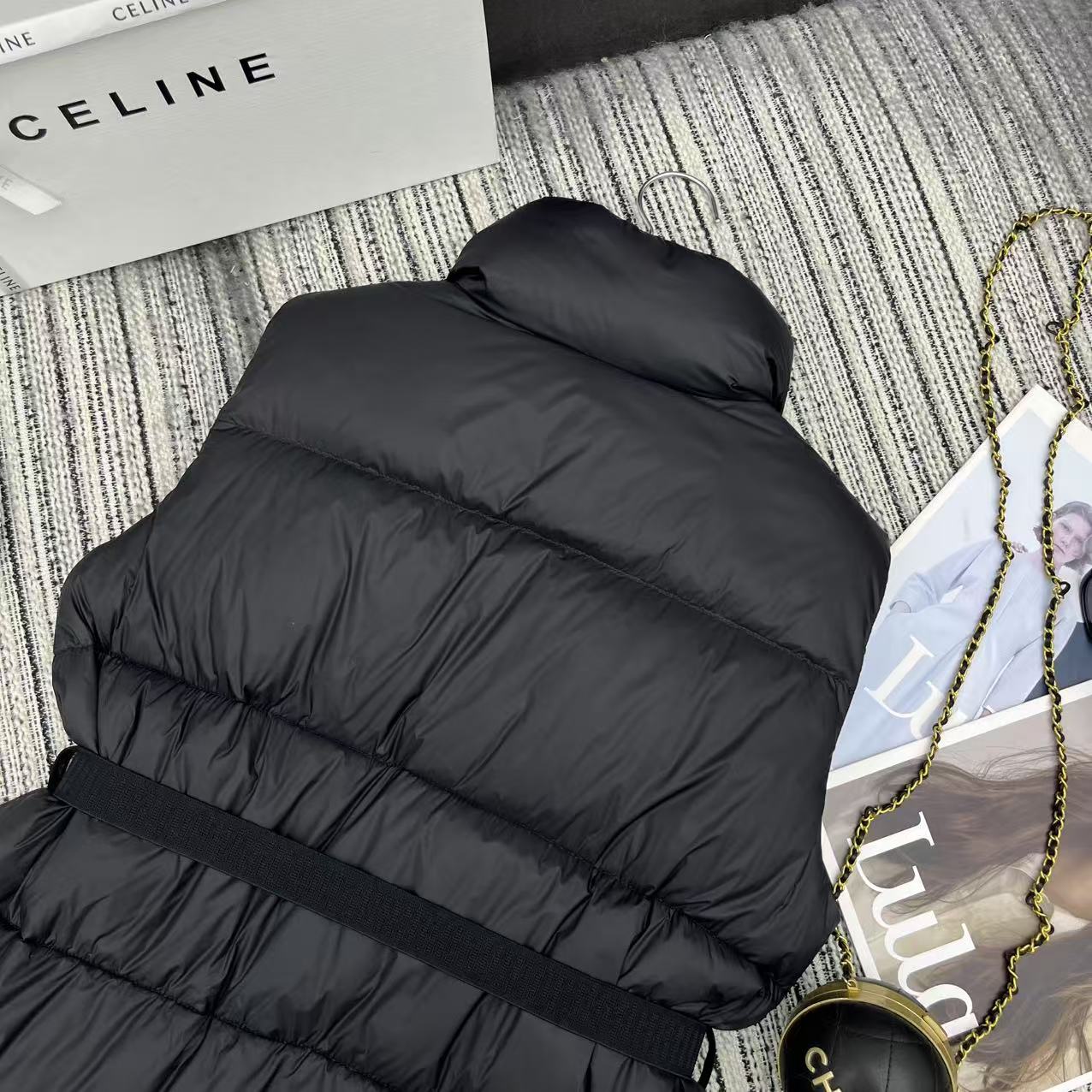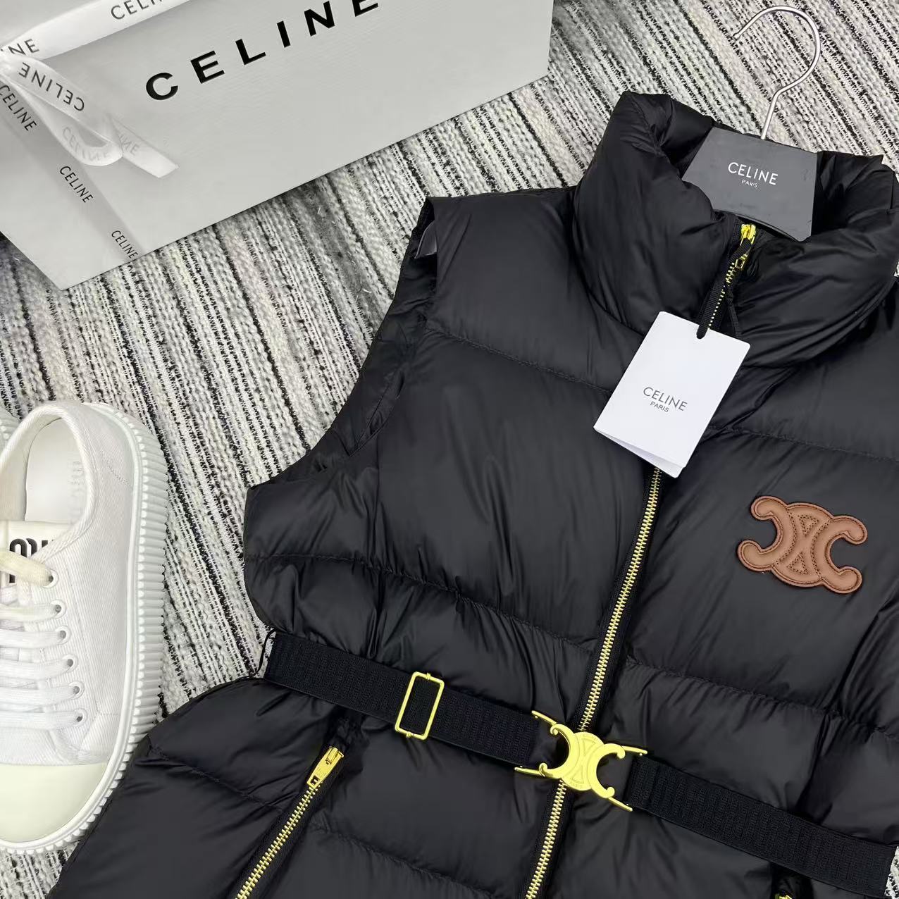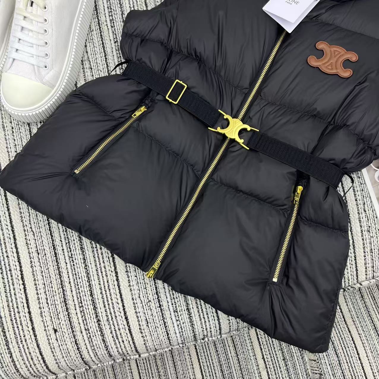 Details: Early autumn and winter down vest, collar, arch logo, 90% white goose down.