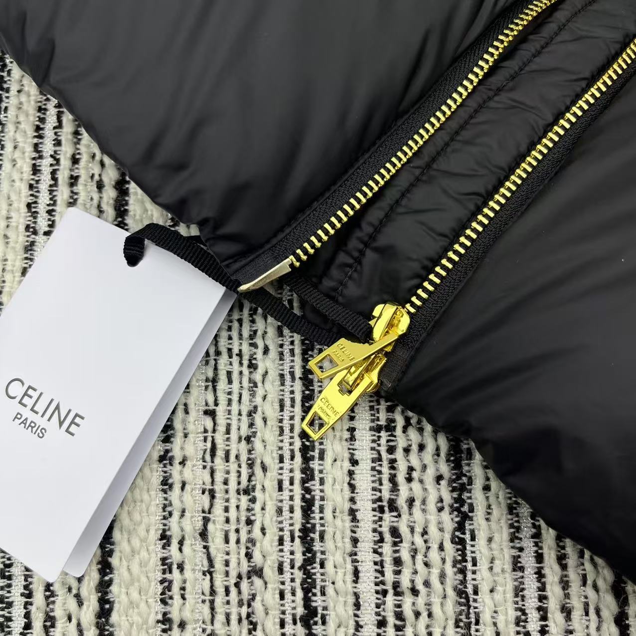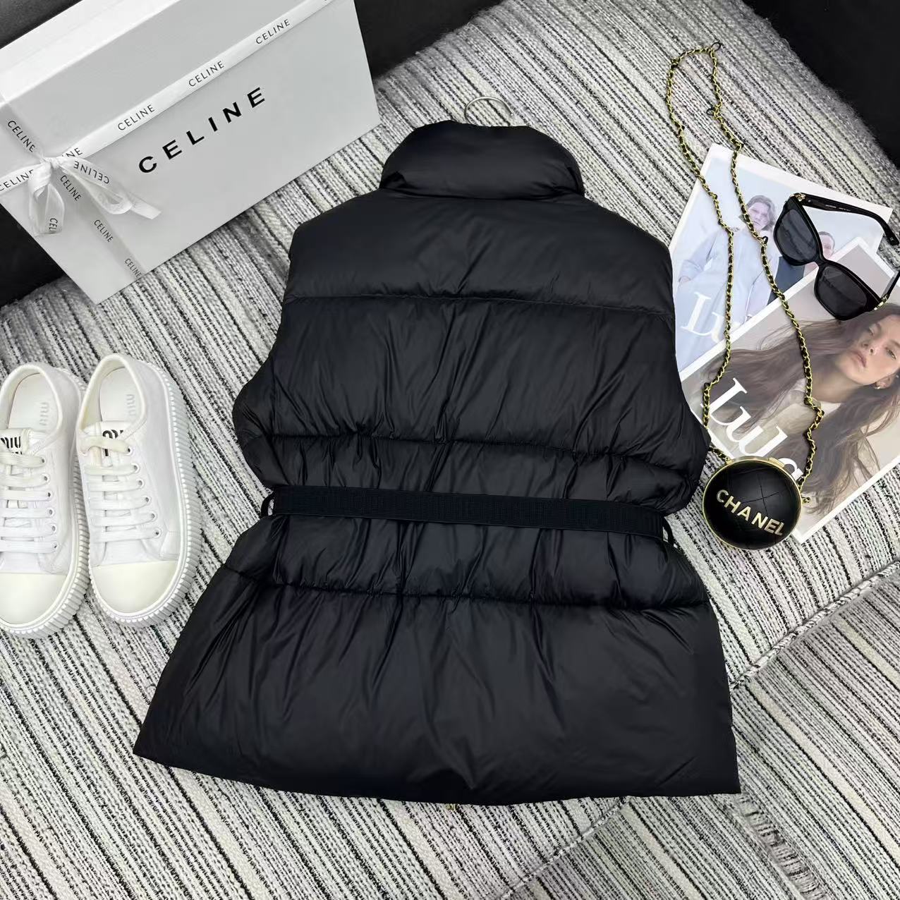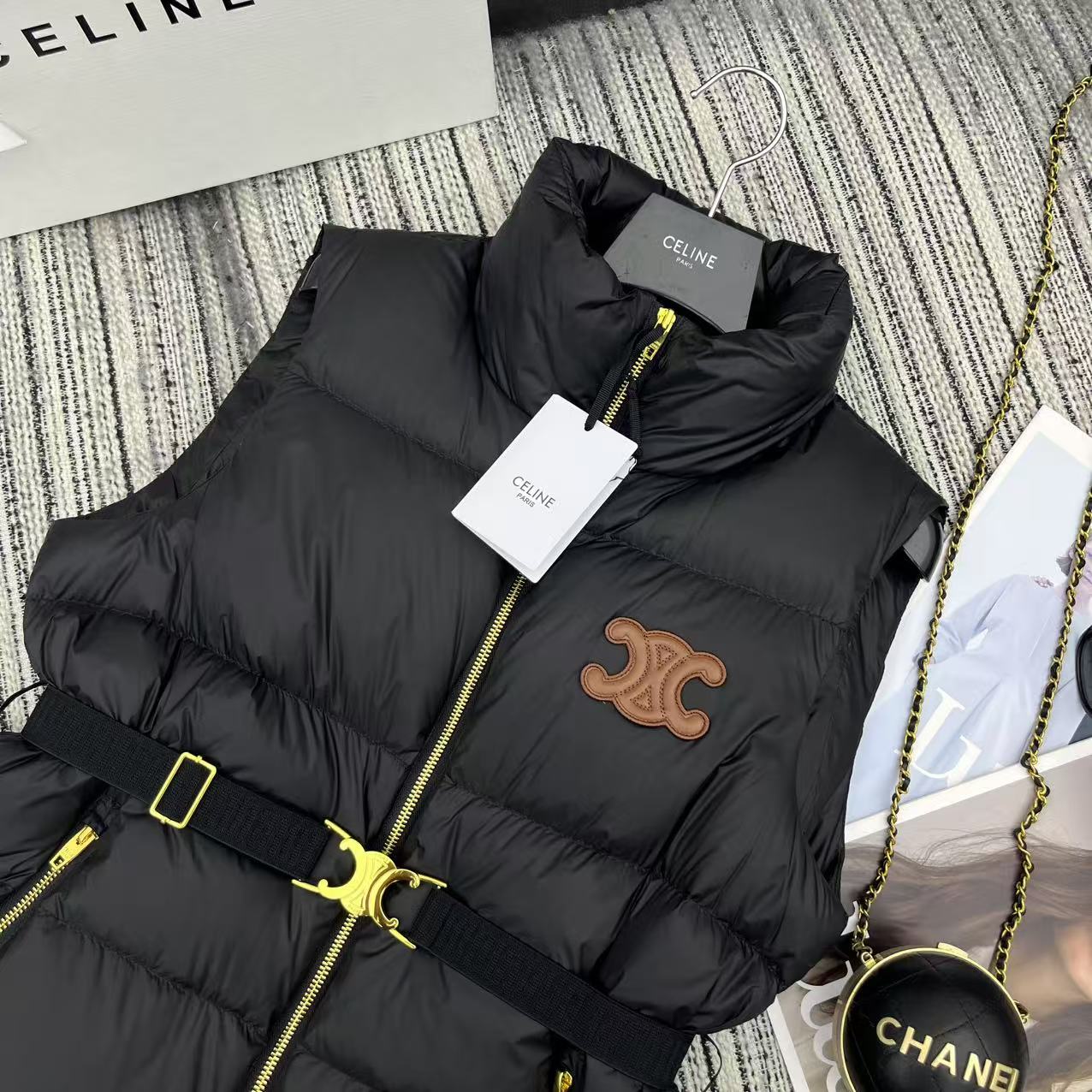 Details: Early autumn and winter down vest, collar, arch logo, 90% white goose down.