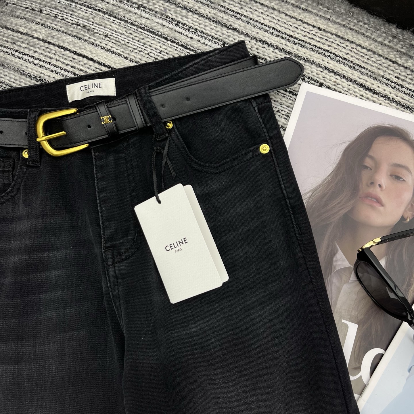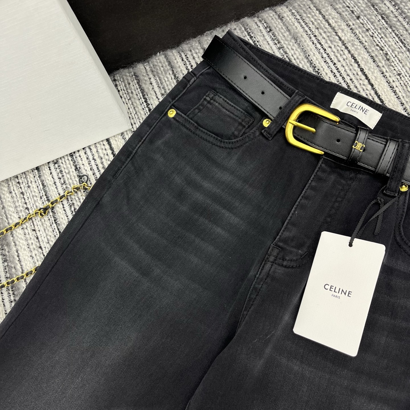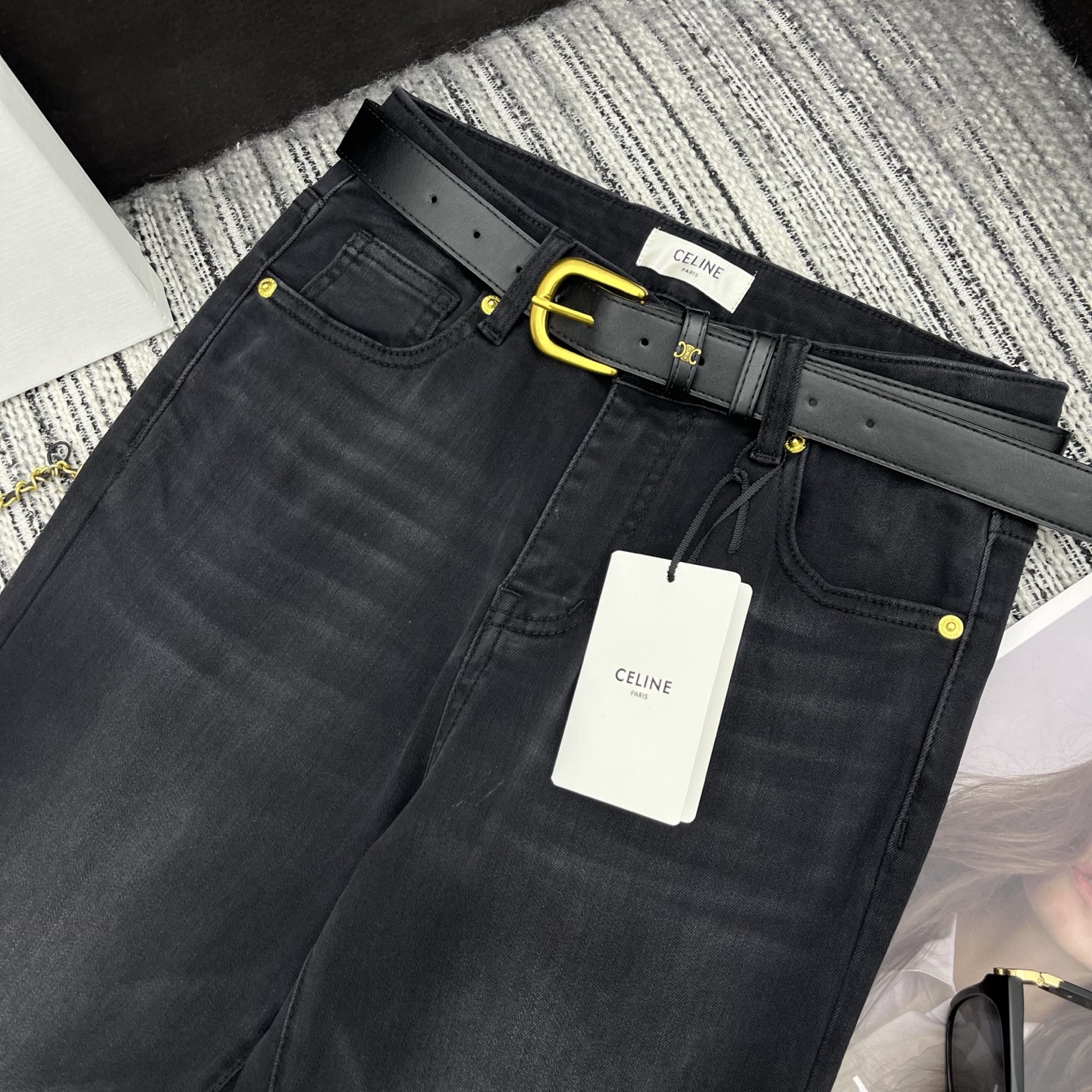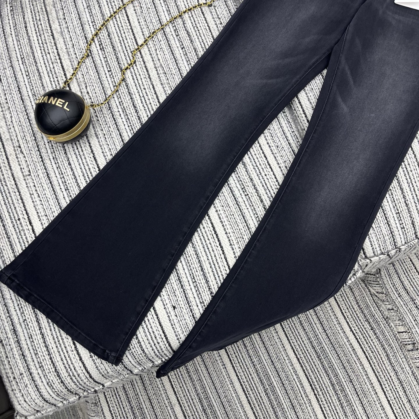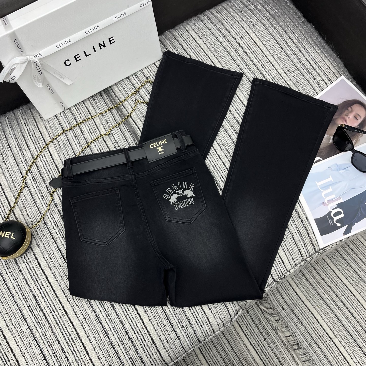 Details: Highly recommended early spring bell-bottom jeans with embroidered letter logo pockets and custom leather belt