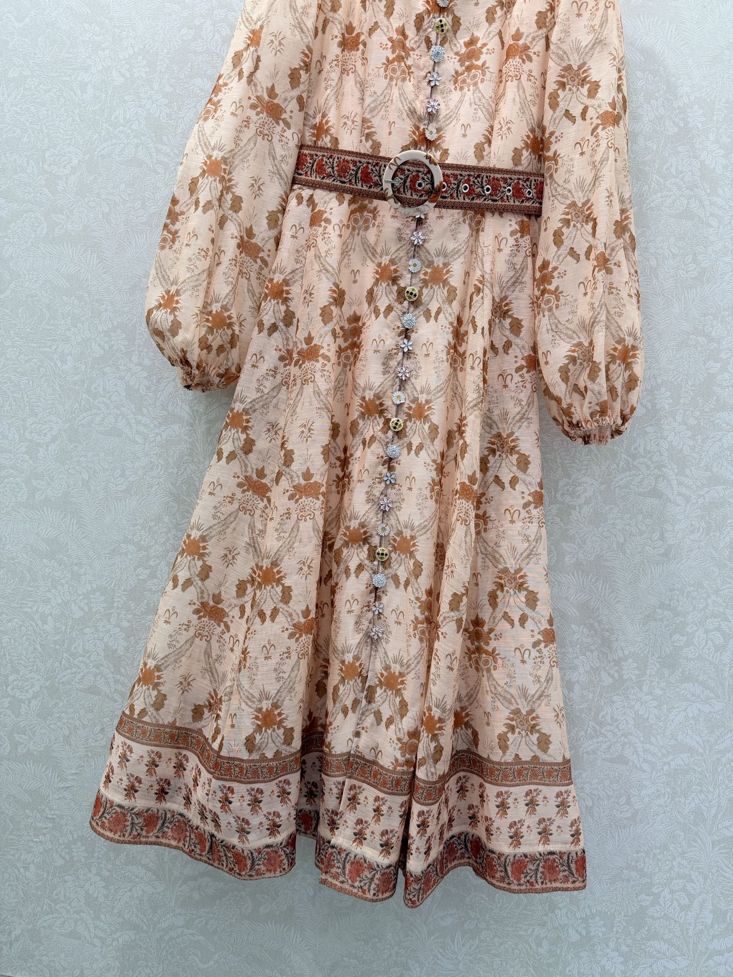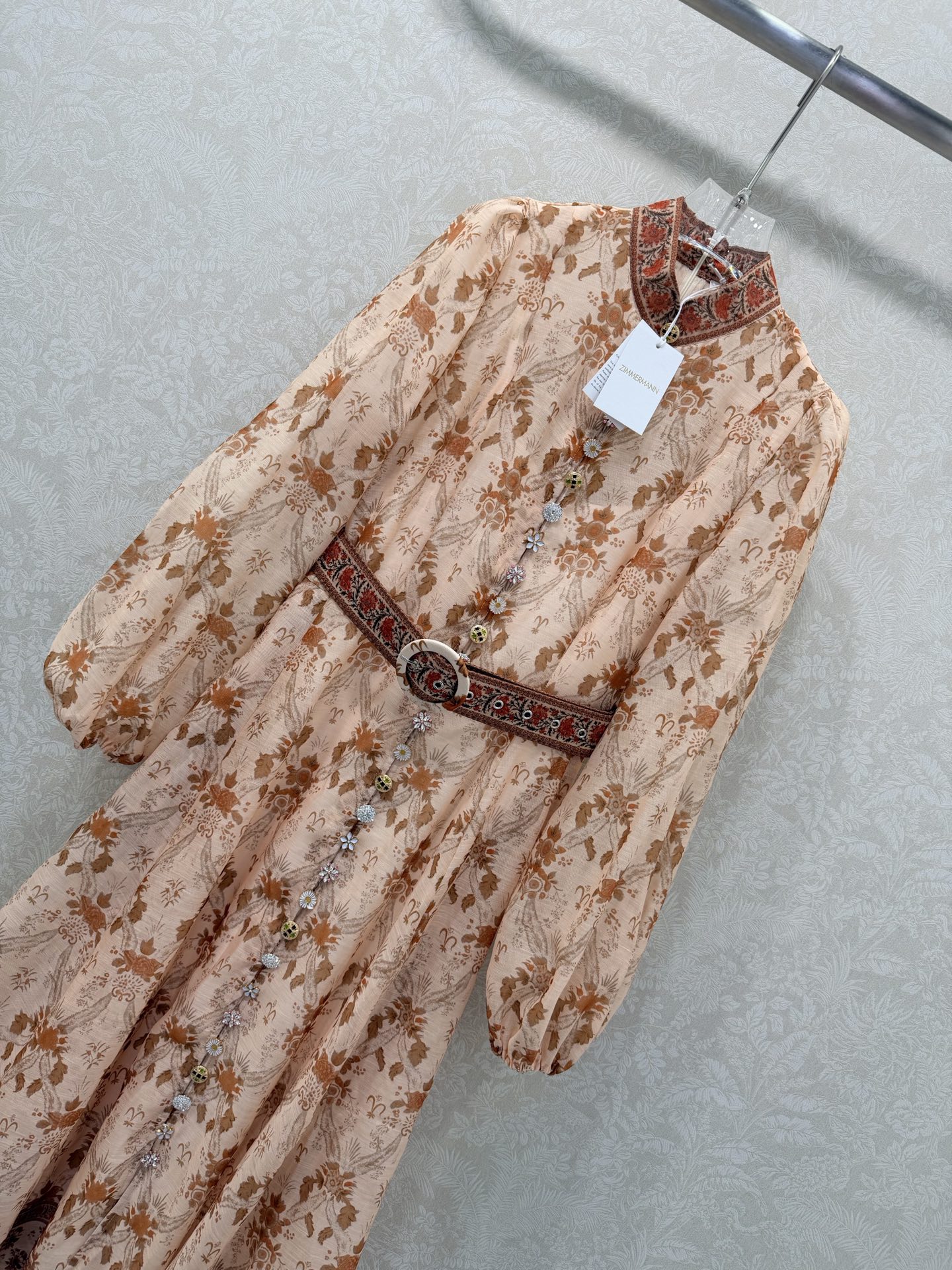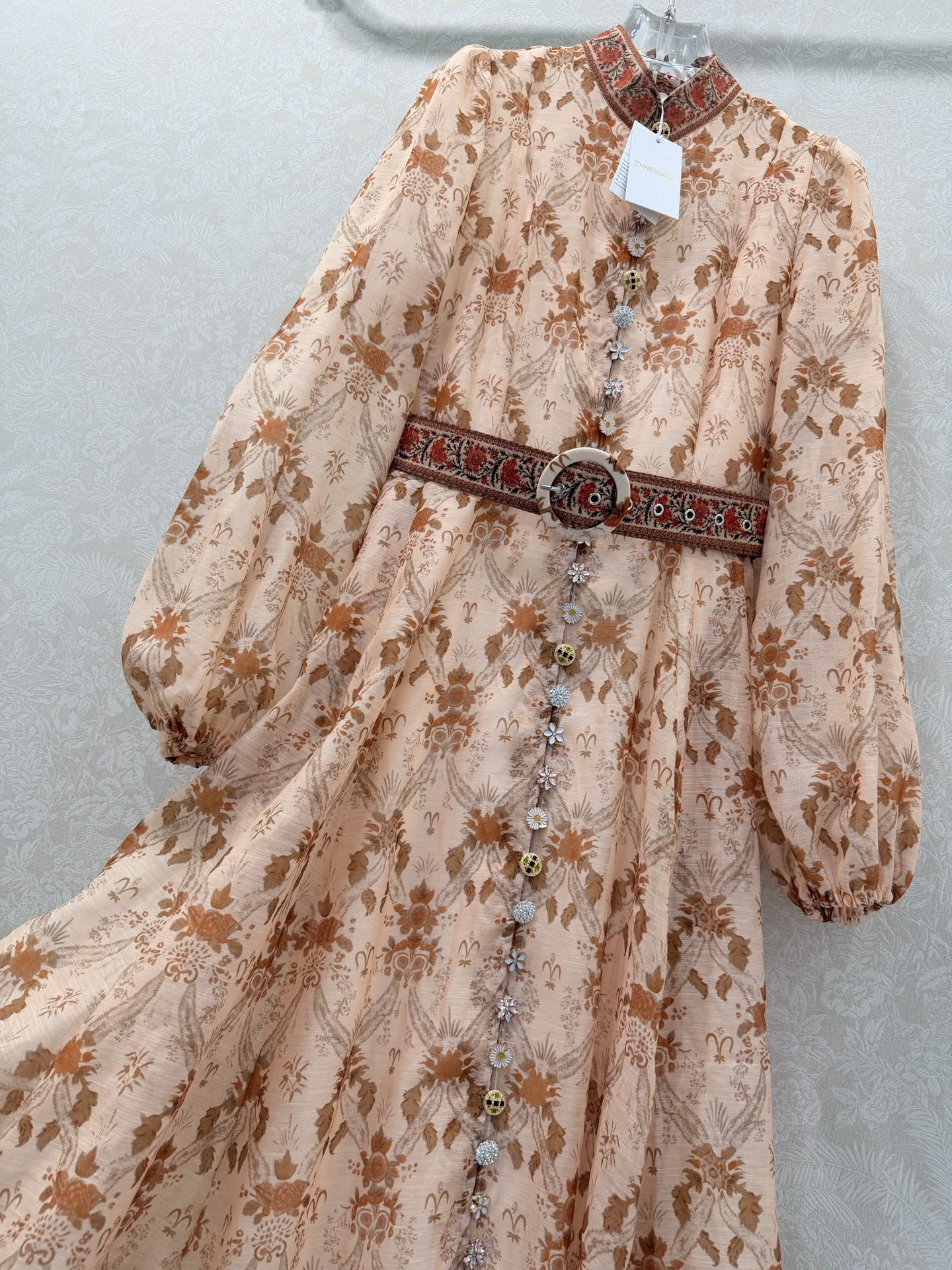 Details: Long lace dress with stand-up collar, puffed sleeves, custom multi-gem hardware, matching belt, ultra-feminine style, high-end customization, exquisite craftsmanship