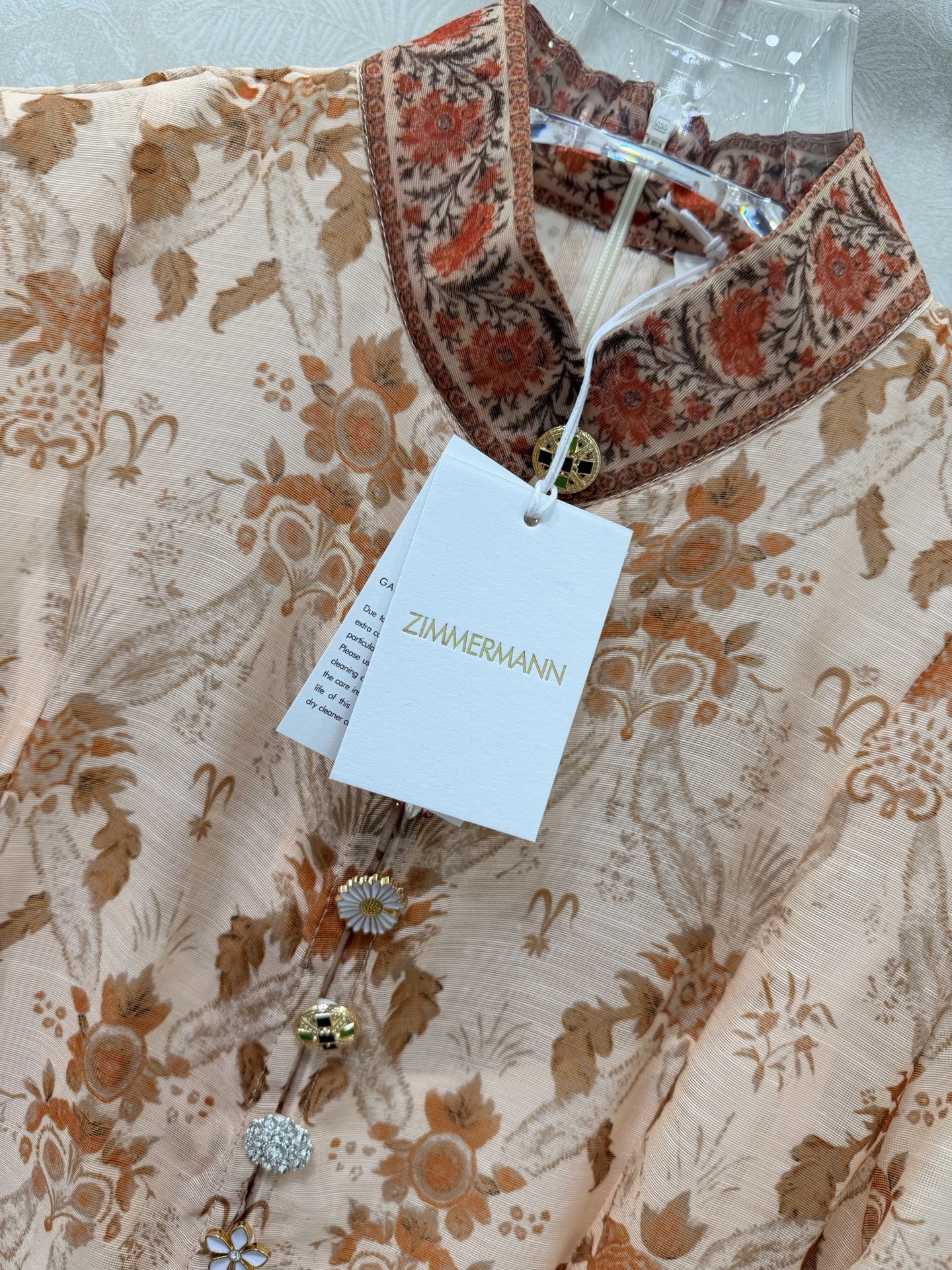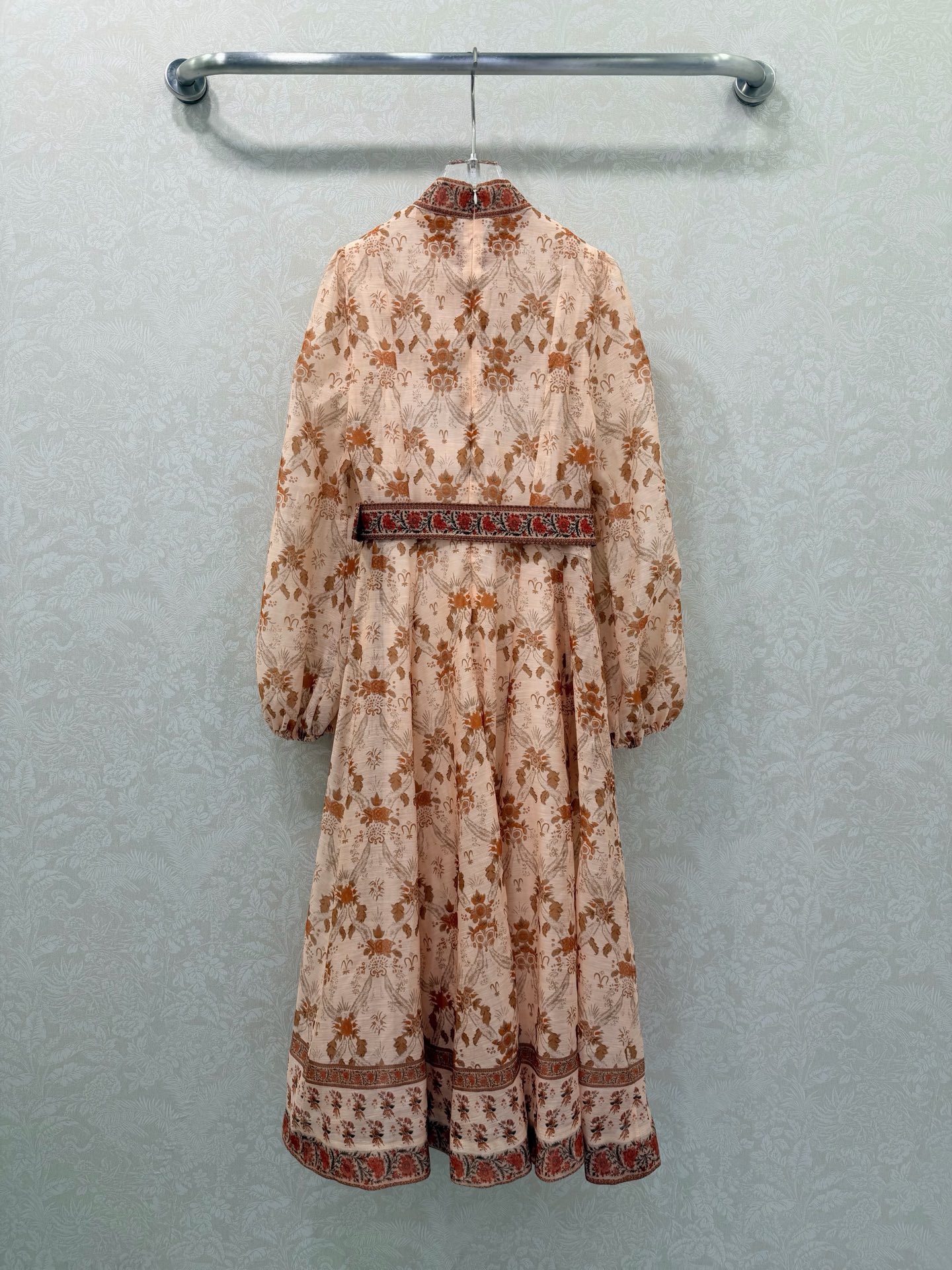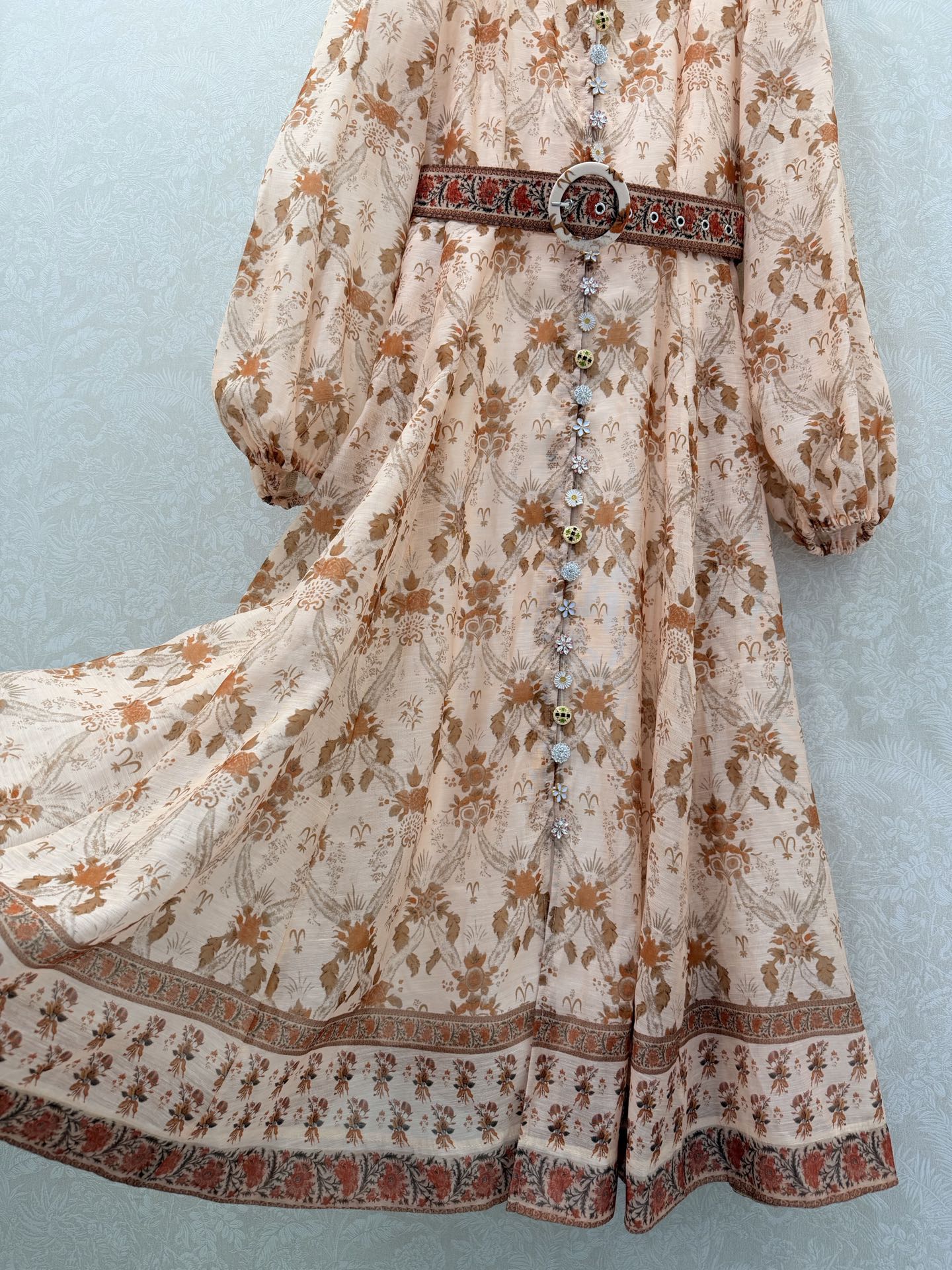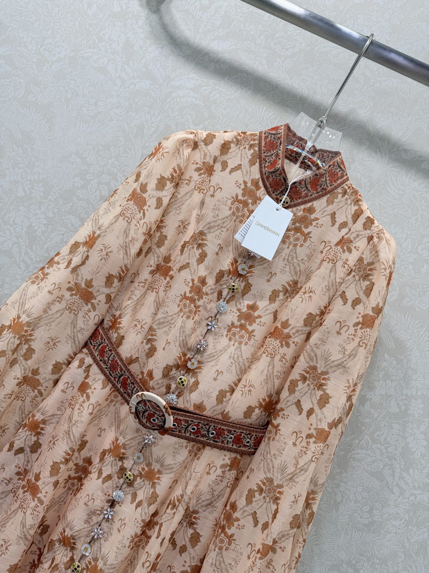 Details: Long lace dress with stand-up collar, puffed sleeves, custom multi-gem hardware, matching belt, ultra-feminine style, high-end customization, exquisite craftsmanship