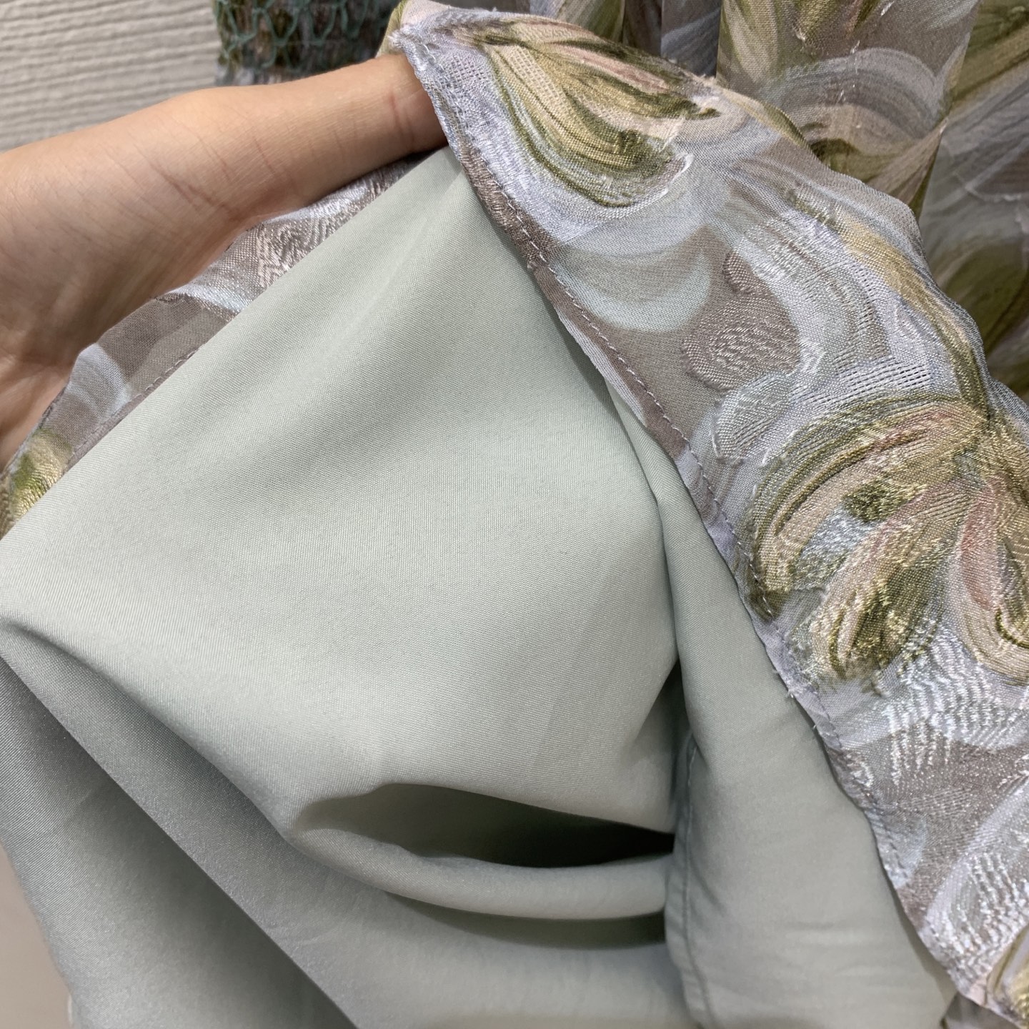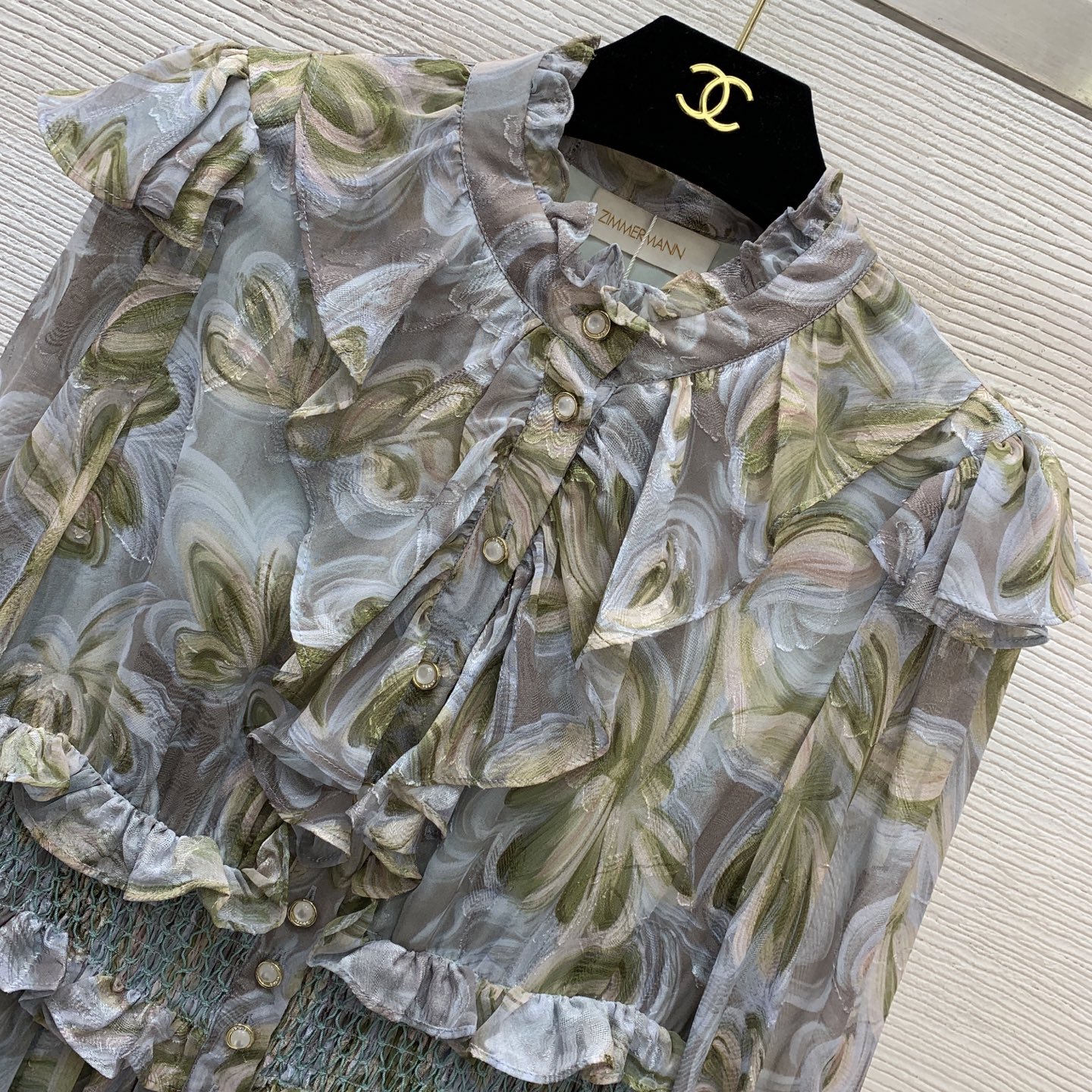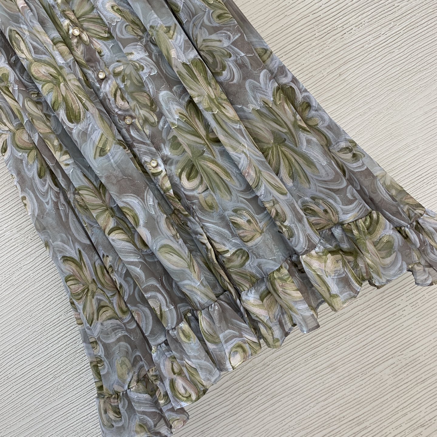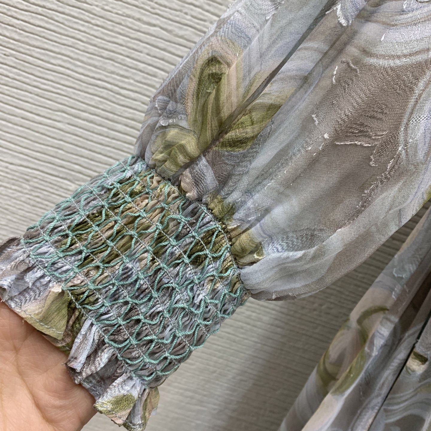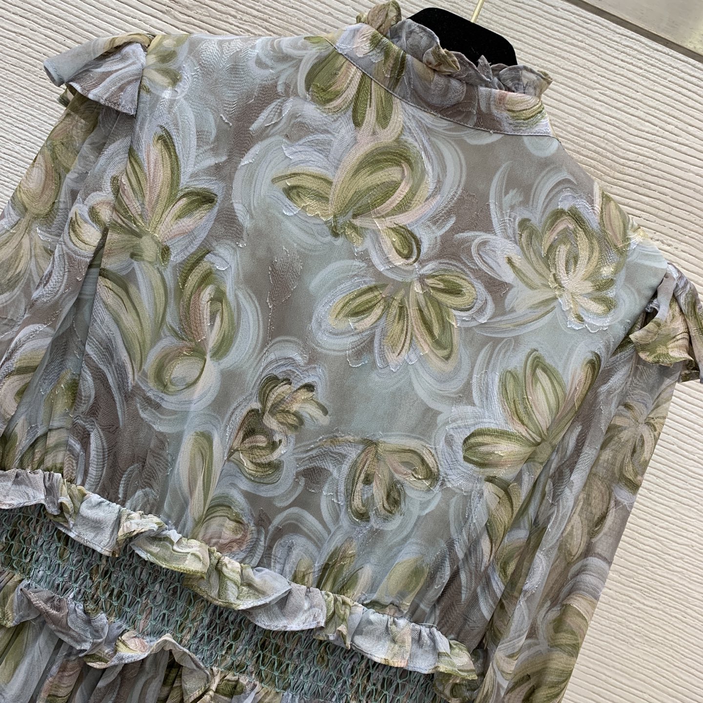 Details: Long-sleeved, stand-collar dress with cut-flower fabric, ruffled collar and waist-gathering, in blue, green or pink. High-end customization, fine workmanship