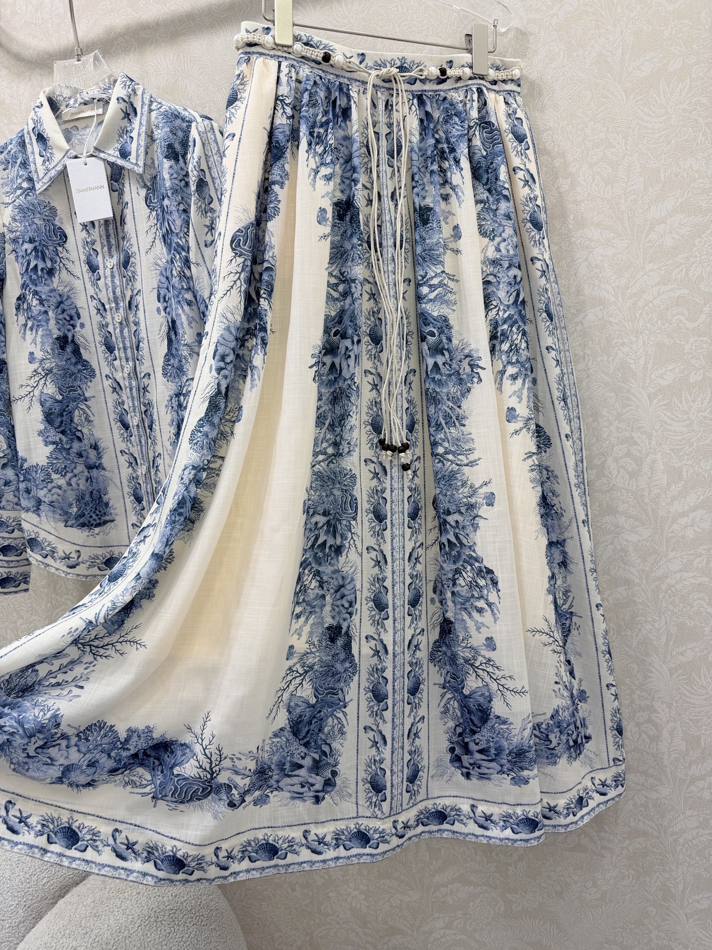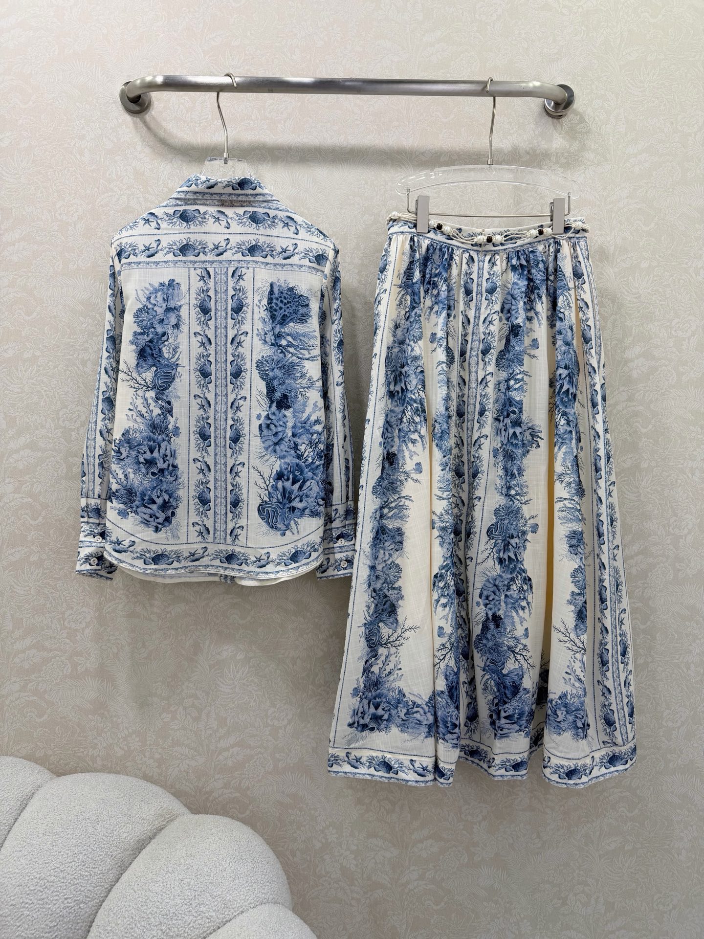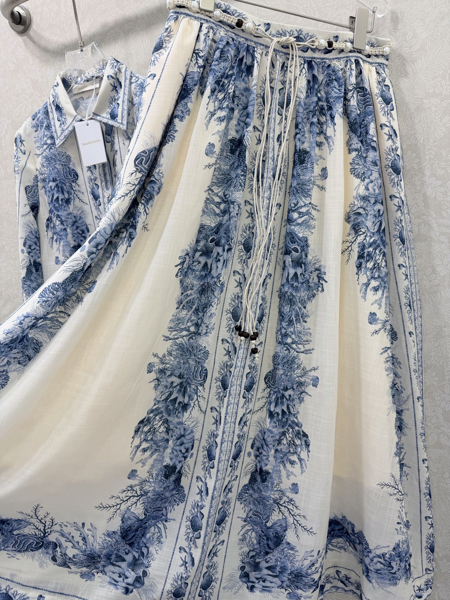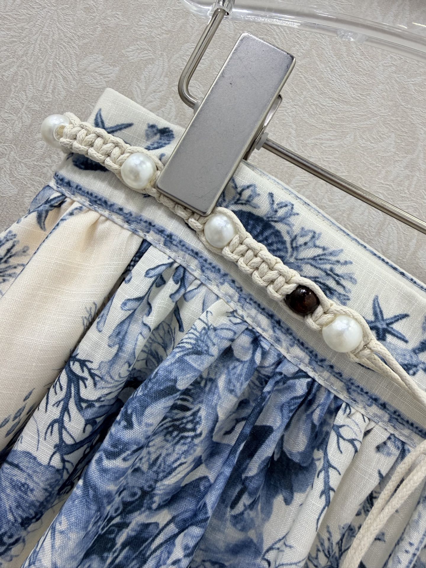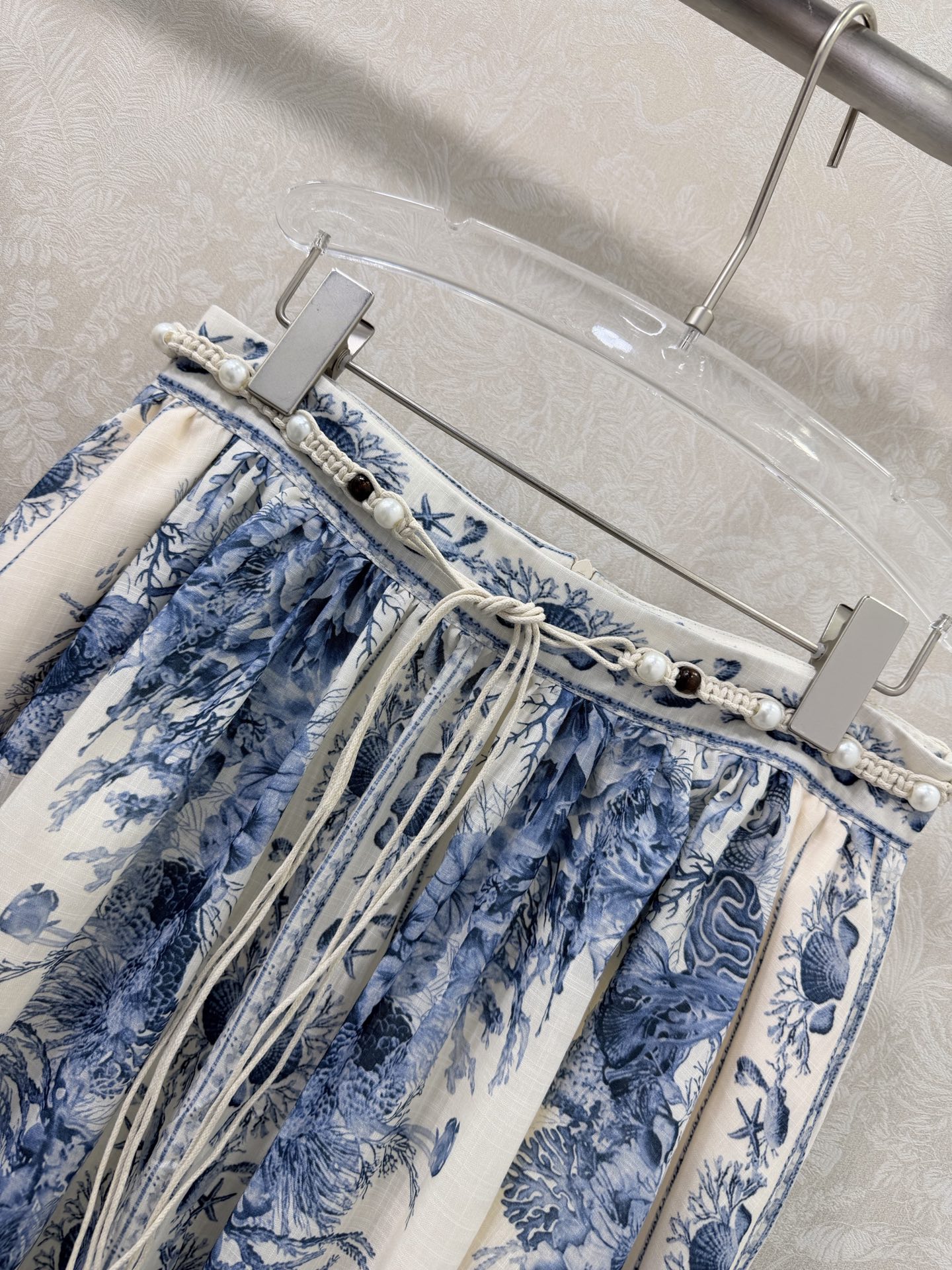 Details: Cotton suit dress with blue and white floral print, pearl waist and loose hem, fashionable and lively