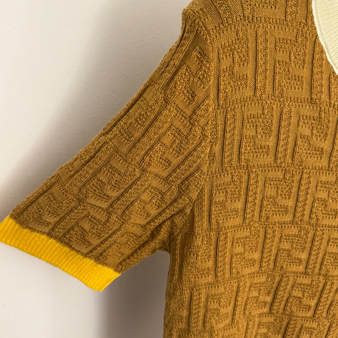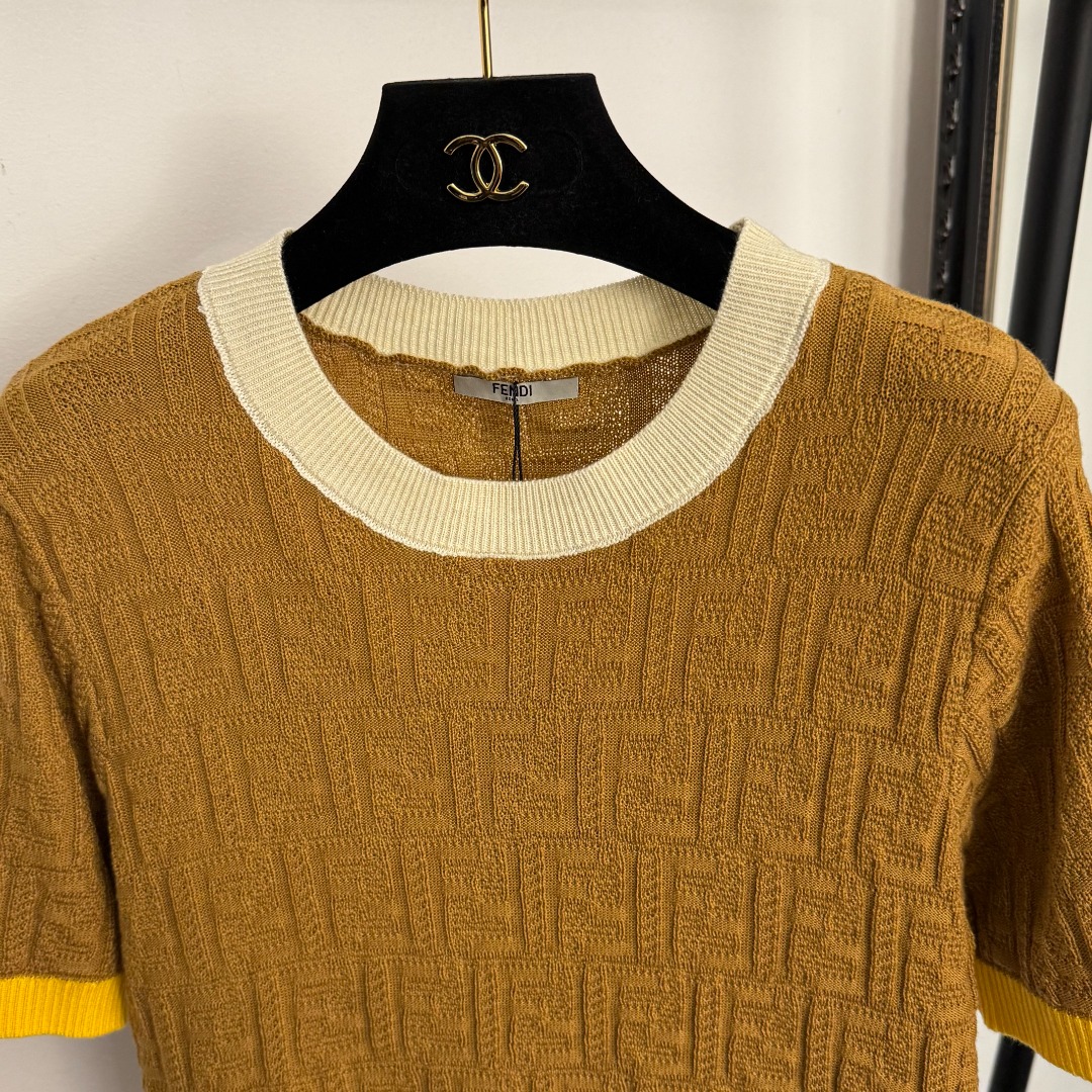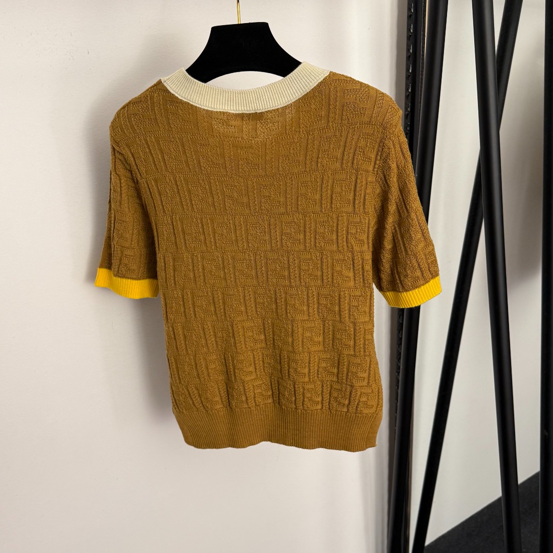 Details: Monogram F-jacquard pull-over short-sleeved knit sweater in khaki and blue, one size
