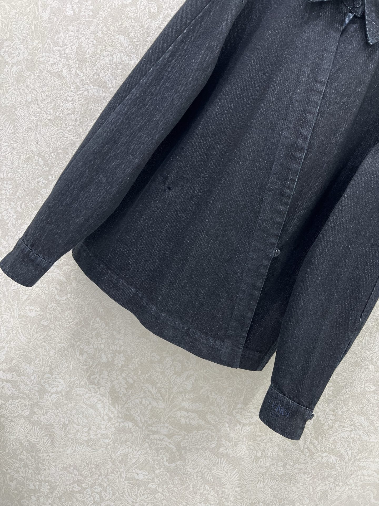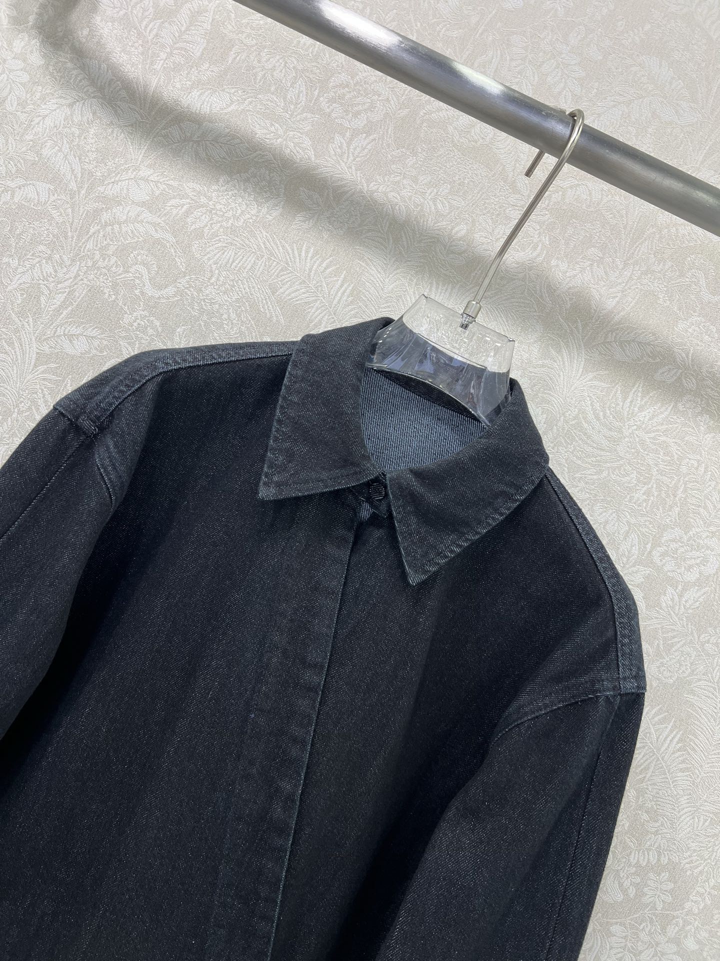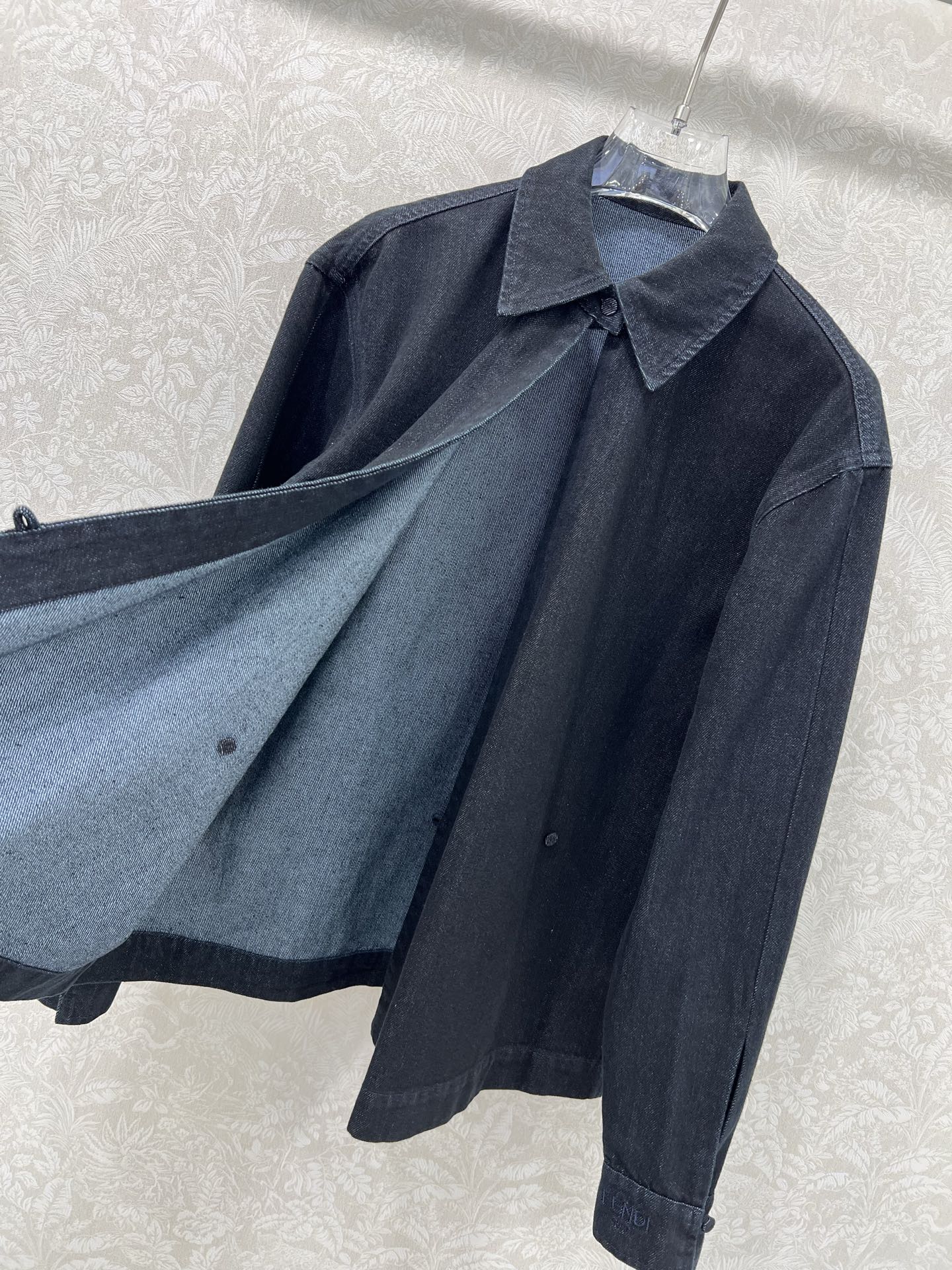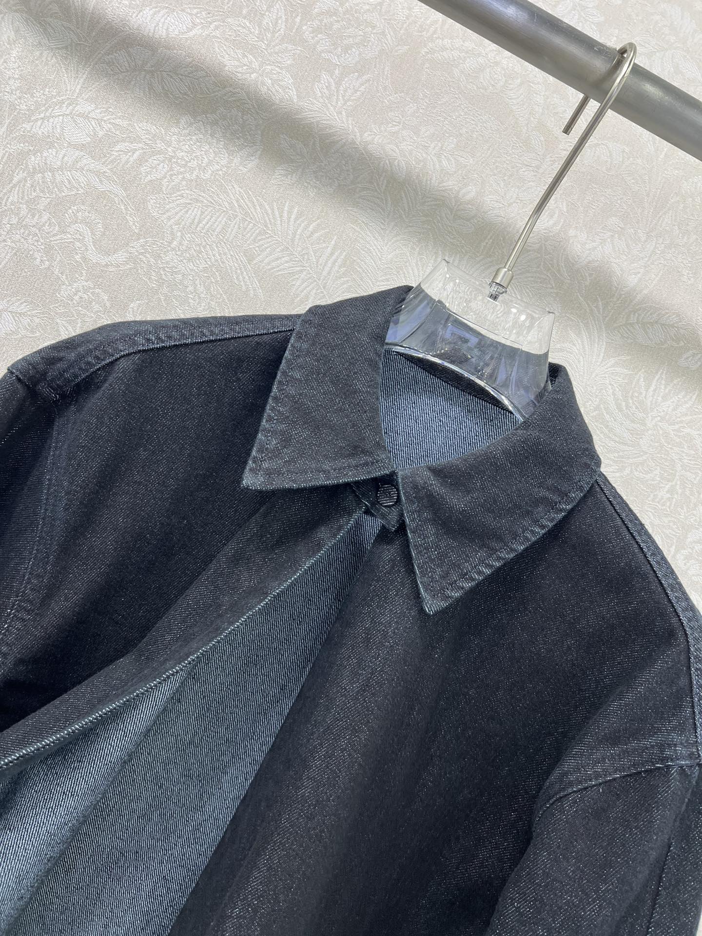 Details: Vintage lapel denim shirt with custom fabric and blue embroidery. Elegant and versatile for various occasions.