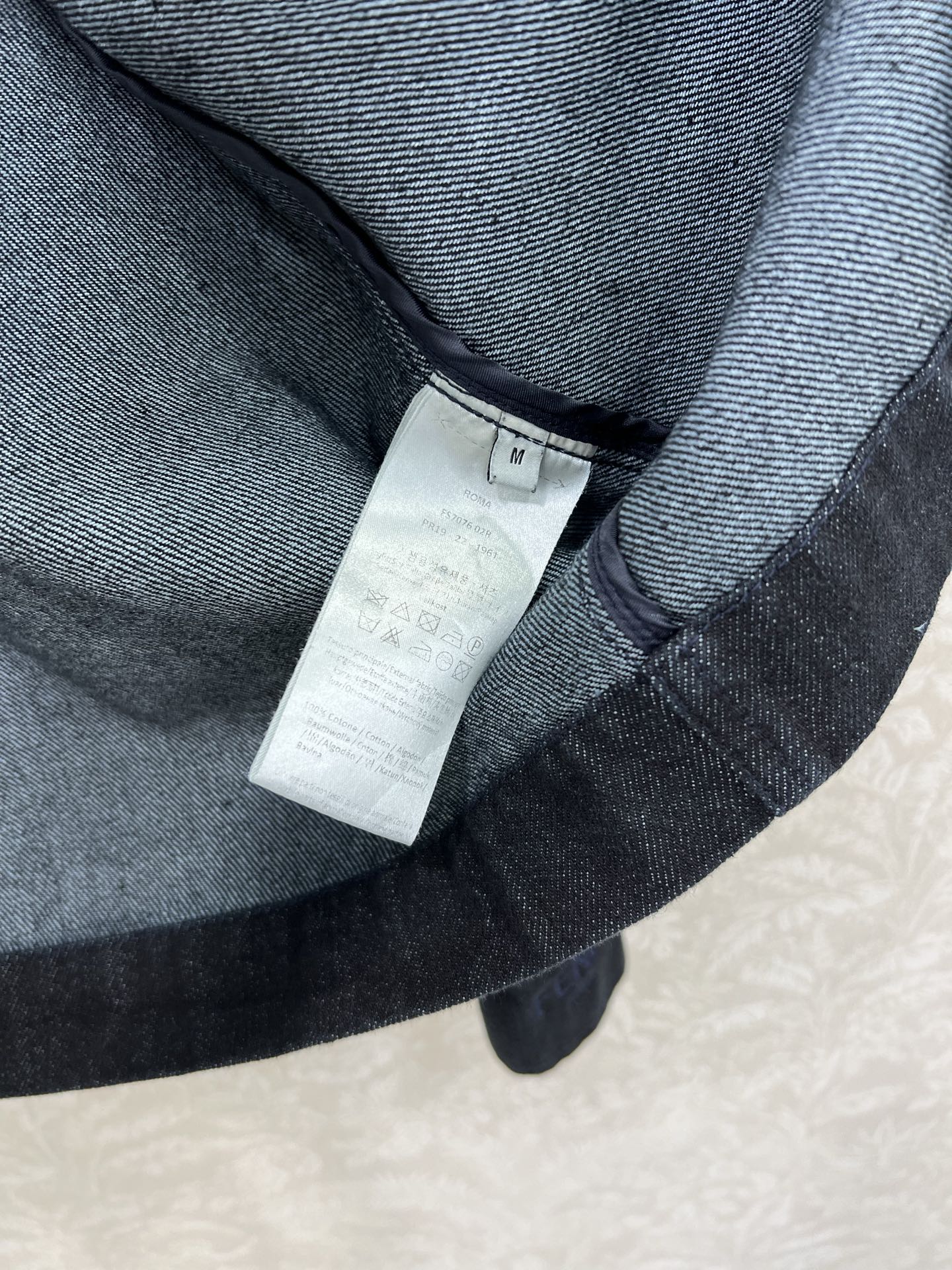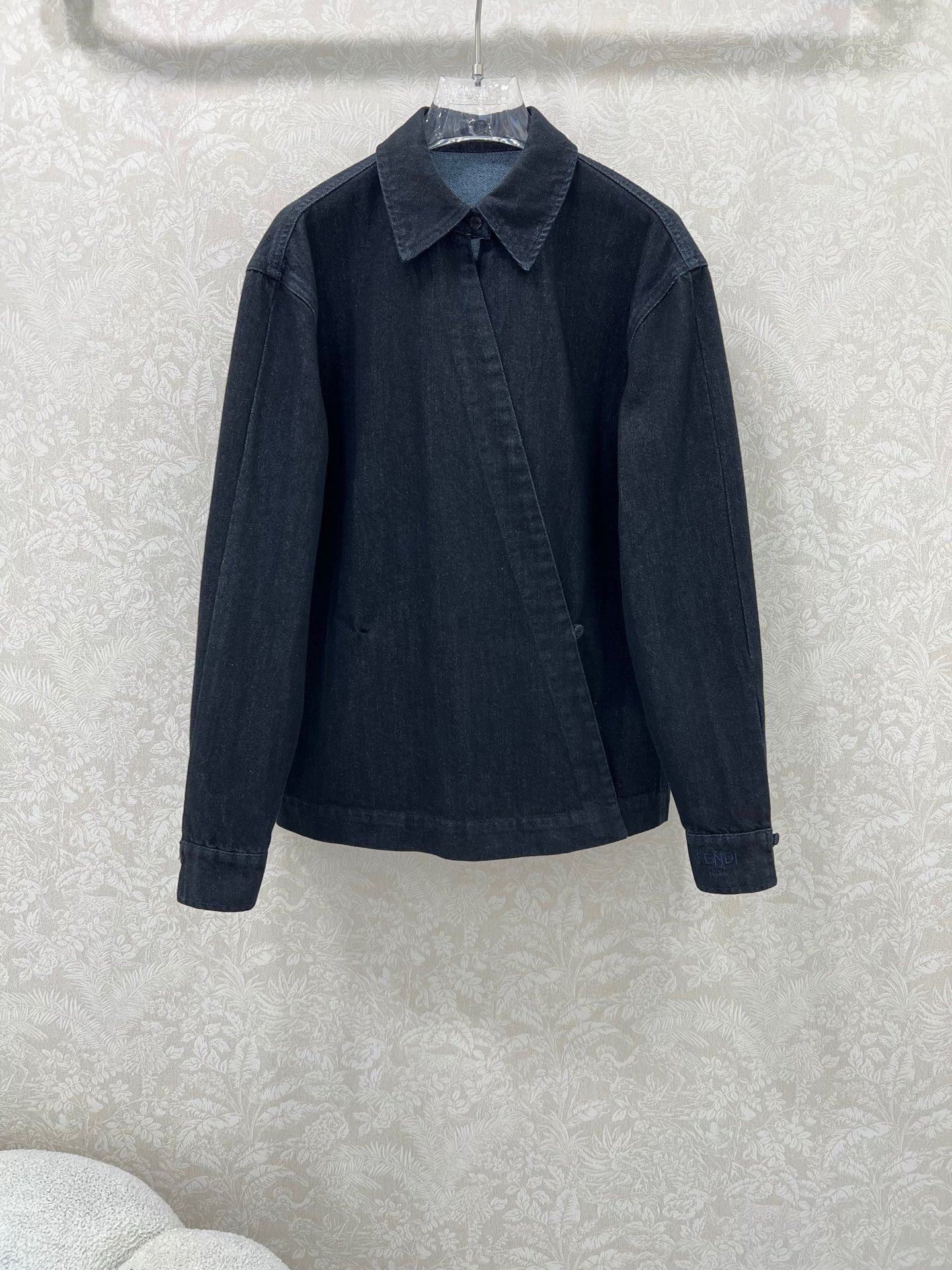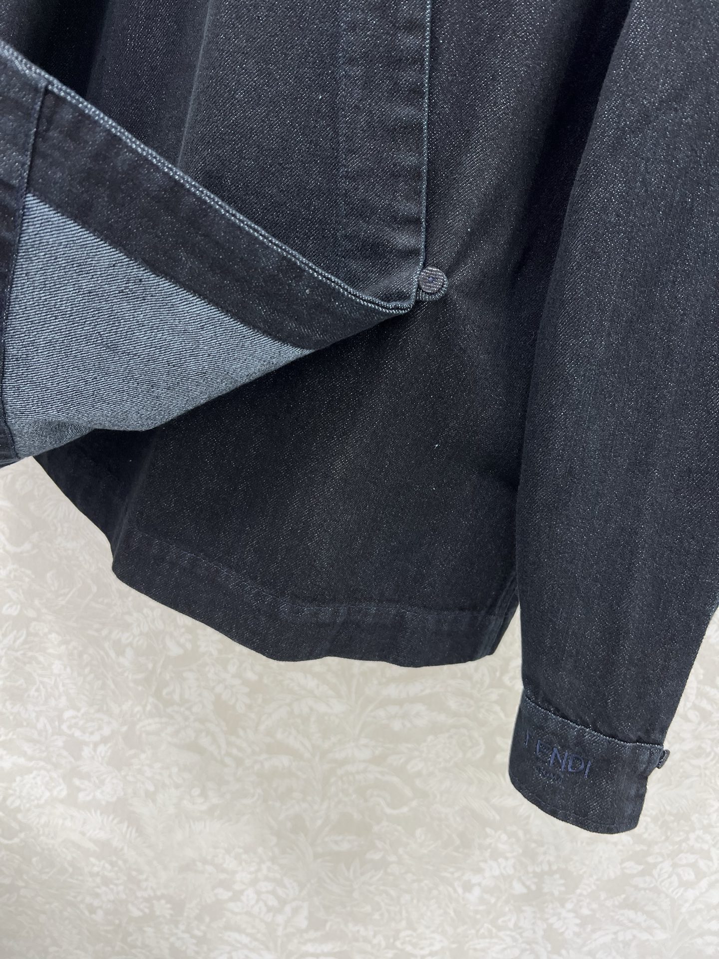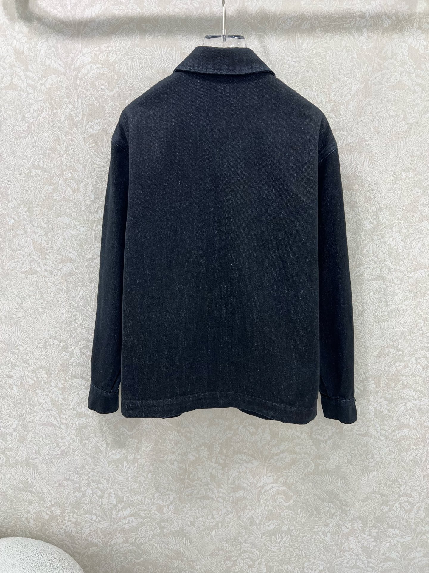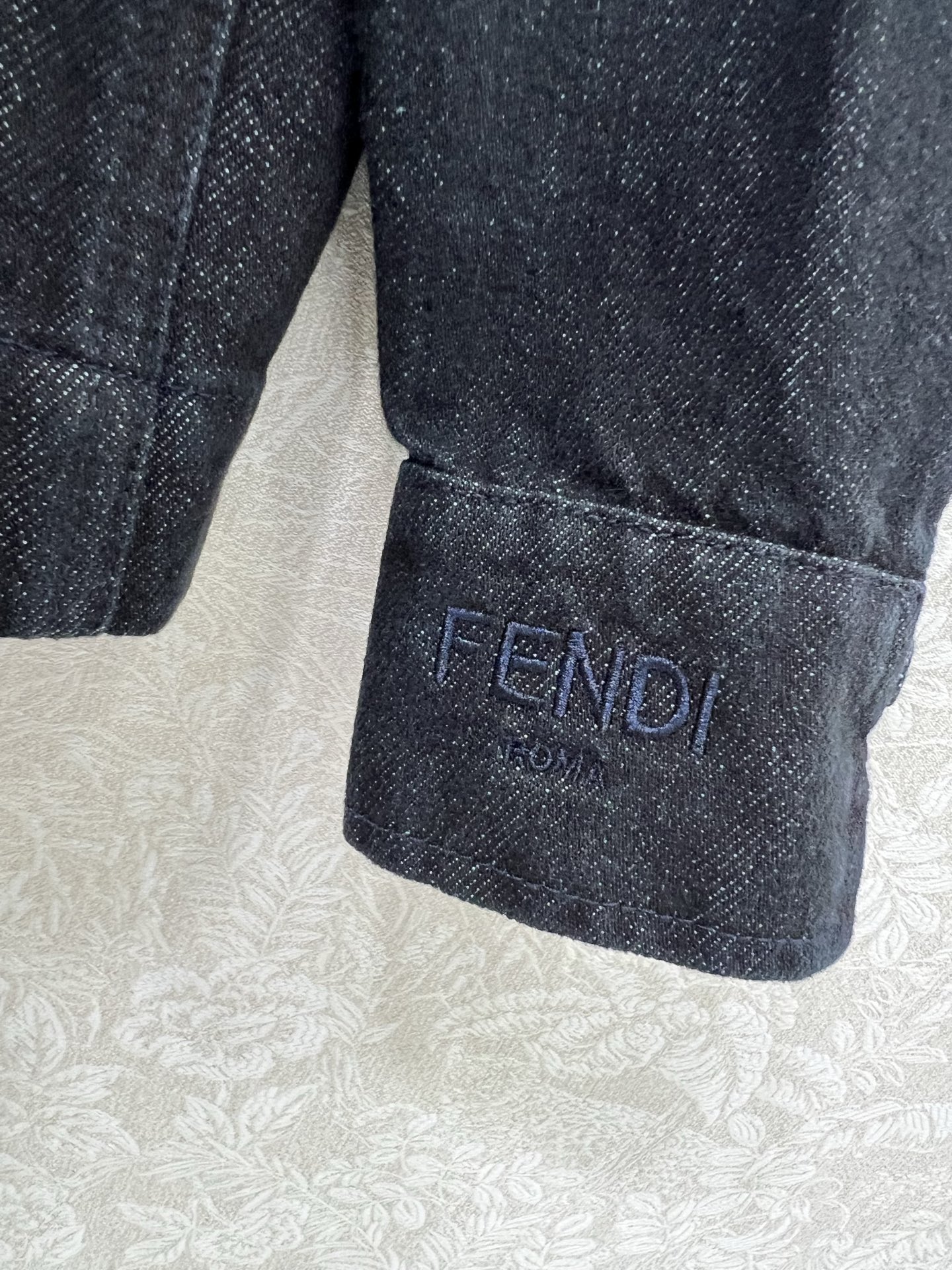 Details: Vintage lapel denim shirt with custom fabric and blue embroidery. Elegant and versatile for various occasions.