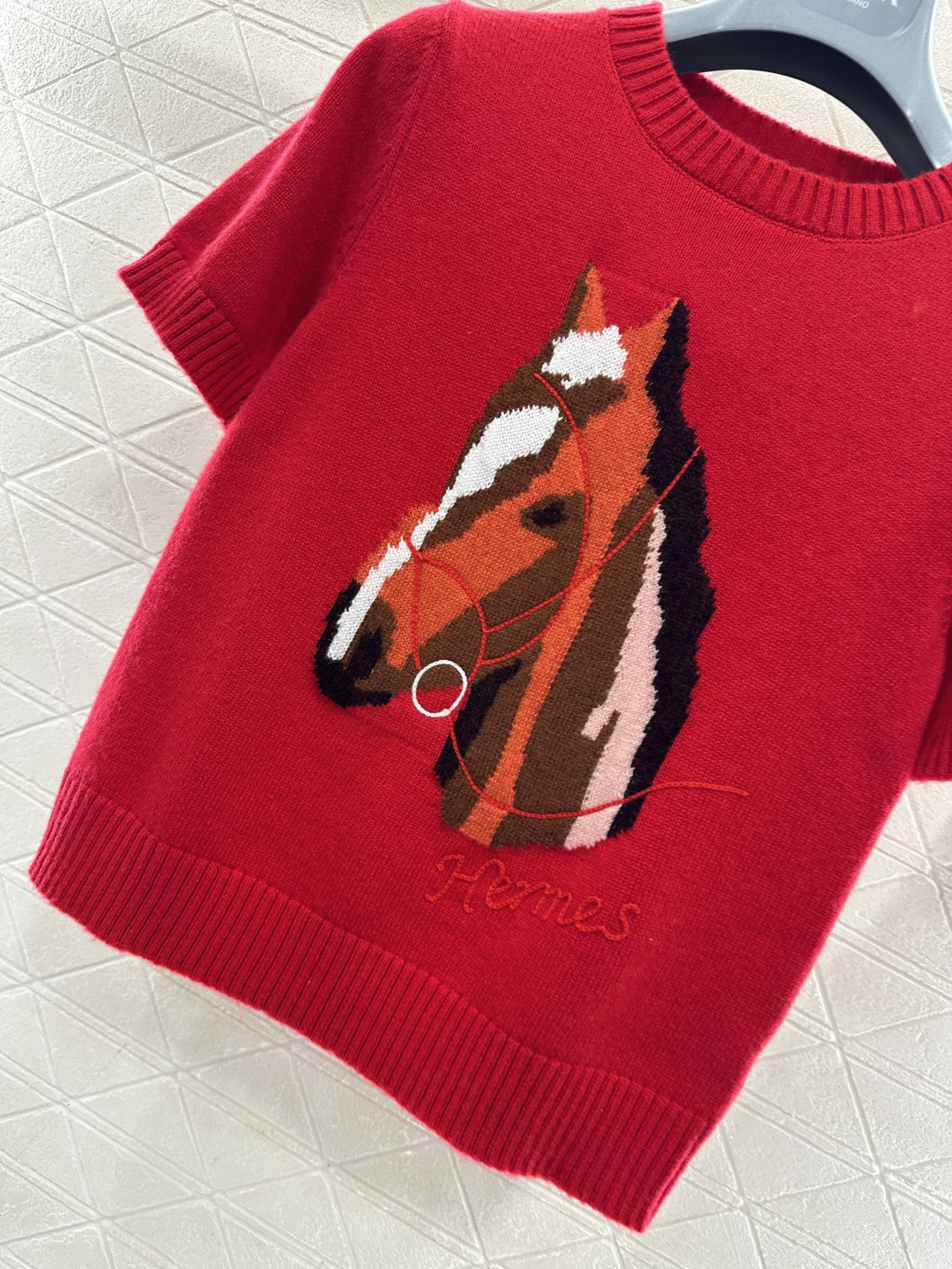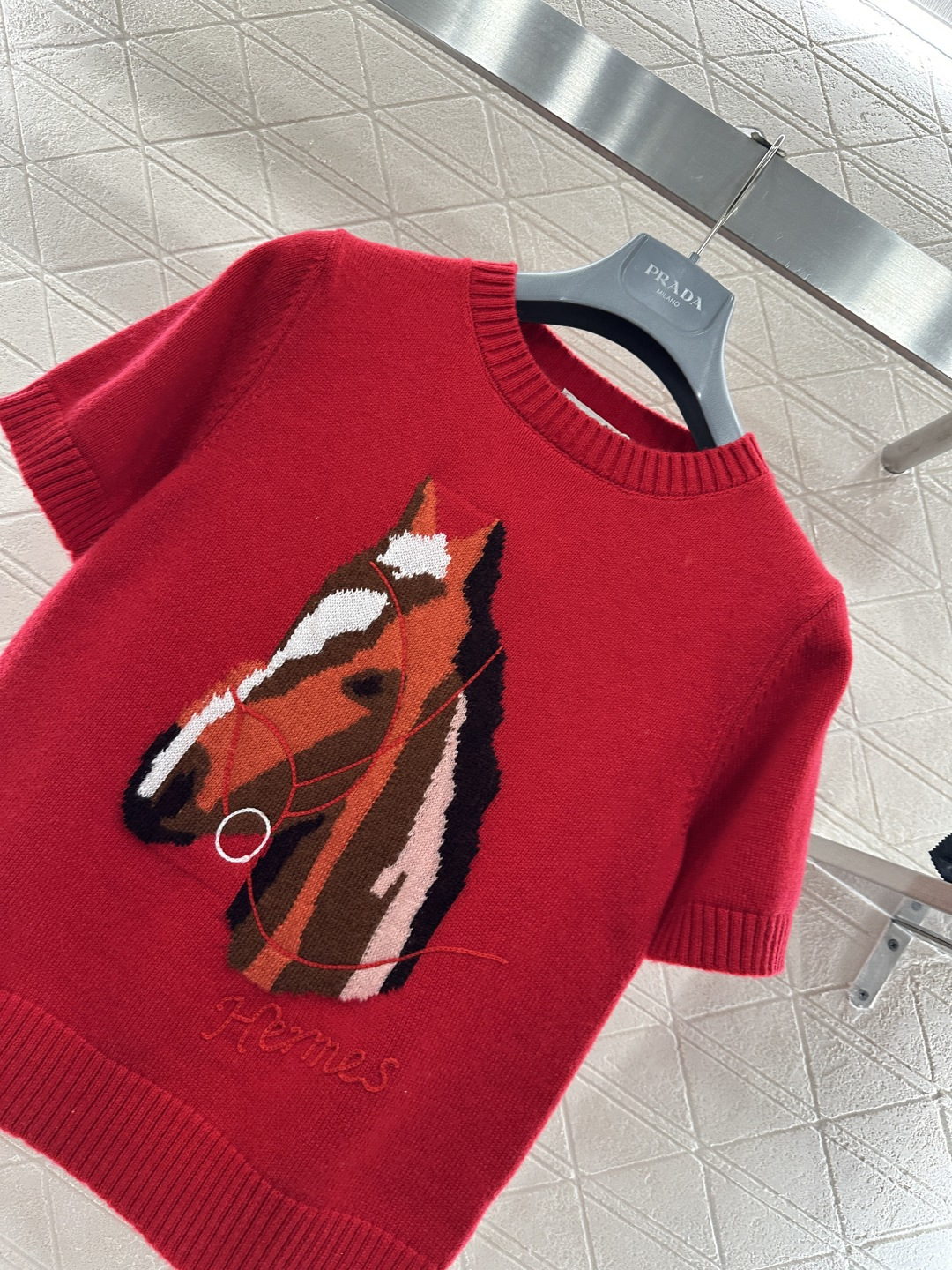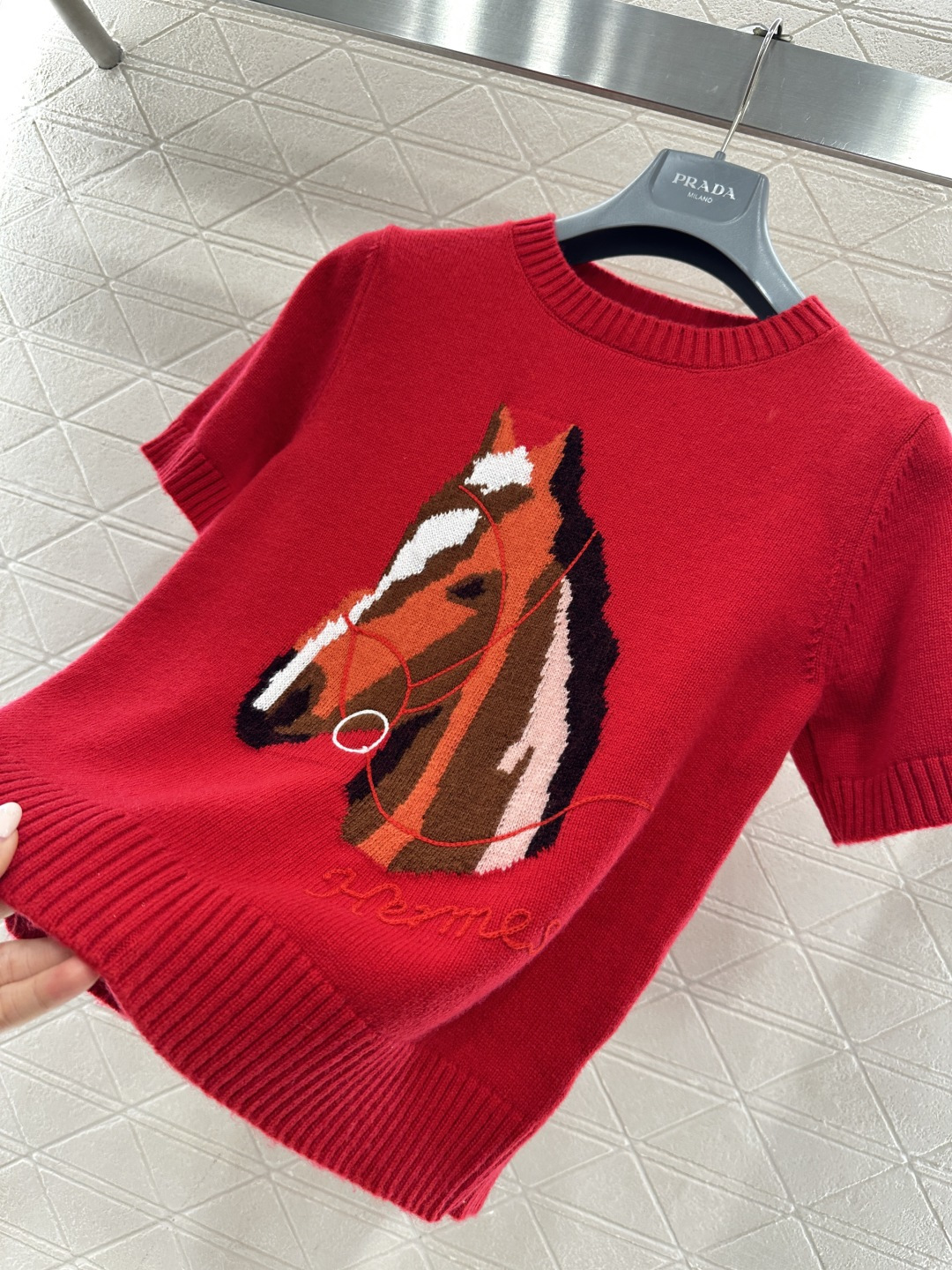 Details: New Year knitted short-sleeved sweater with horsehead jacquard, red-brown contrast, warm wool.
