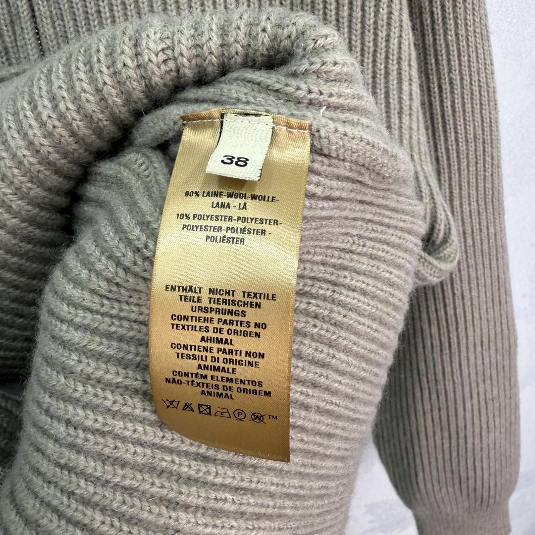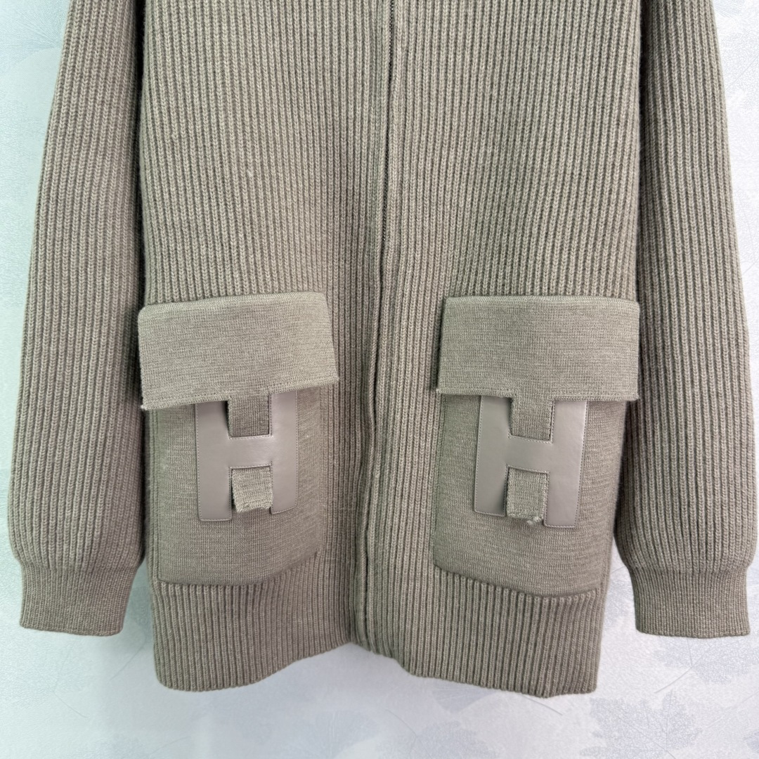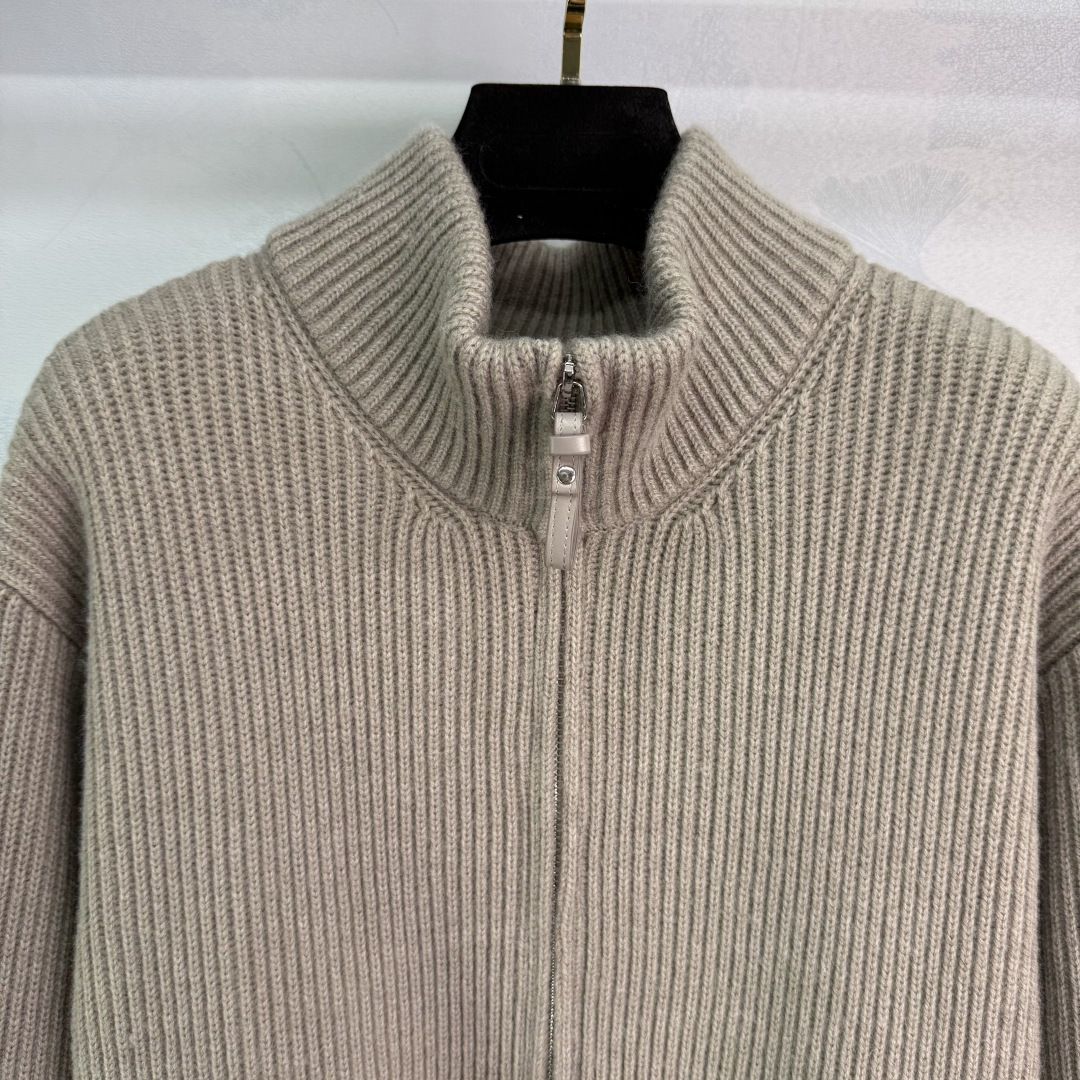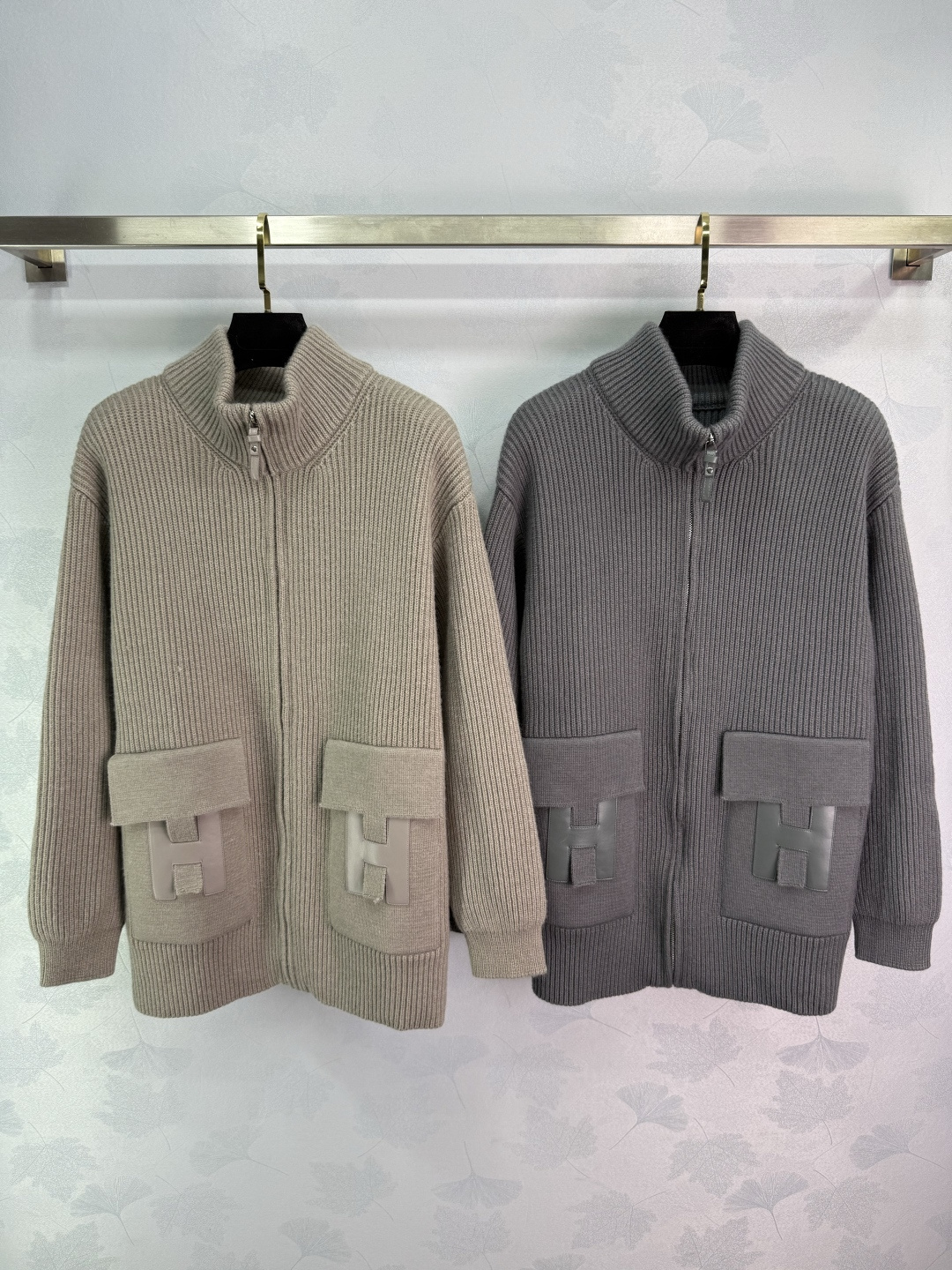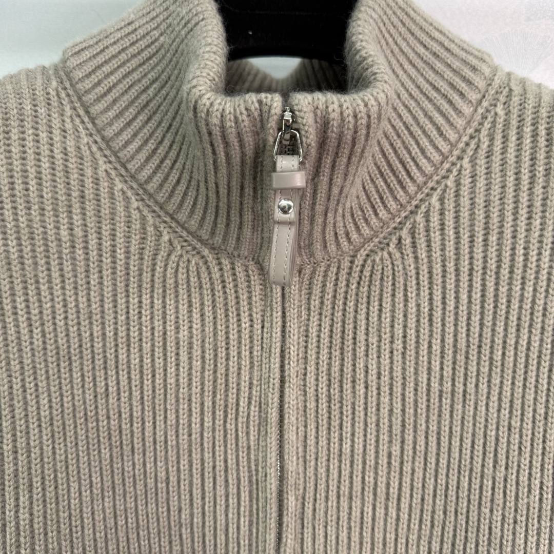 Details: White Wool Cardigan with Brown Leather Logo on Chest Pockets, Zipper Design, Soft and Cozy for Autumn-Winter