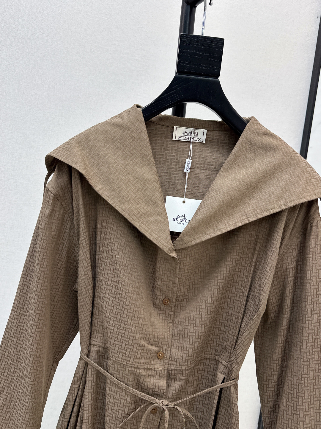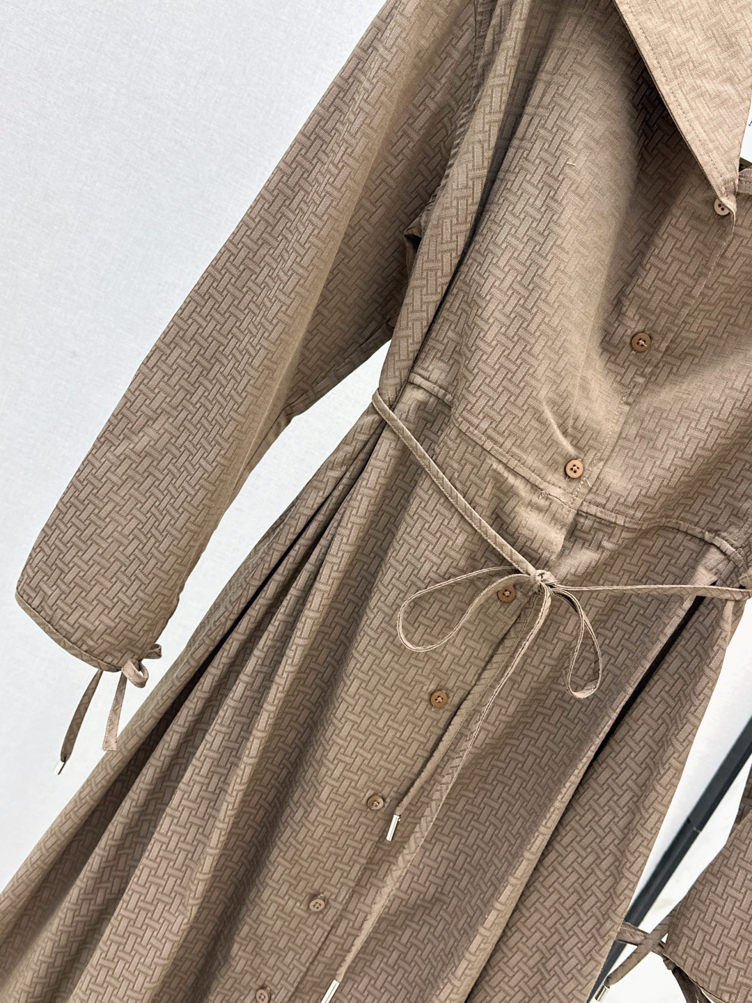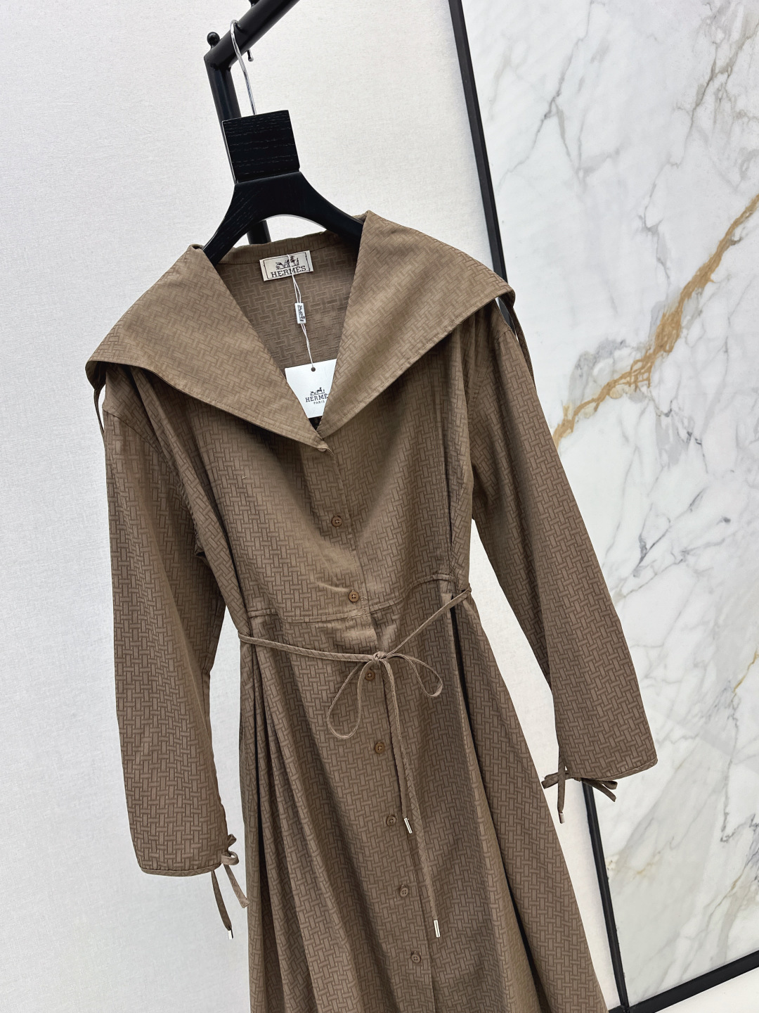 Details: Exclusive early autumn long trench coat dress with H - patterned jacquard, large lapel, and belt. Imported fabric, simple yet refined, with a flattering fit. Available in two colors.