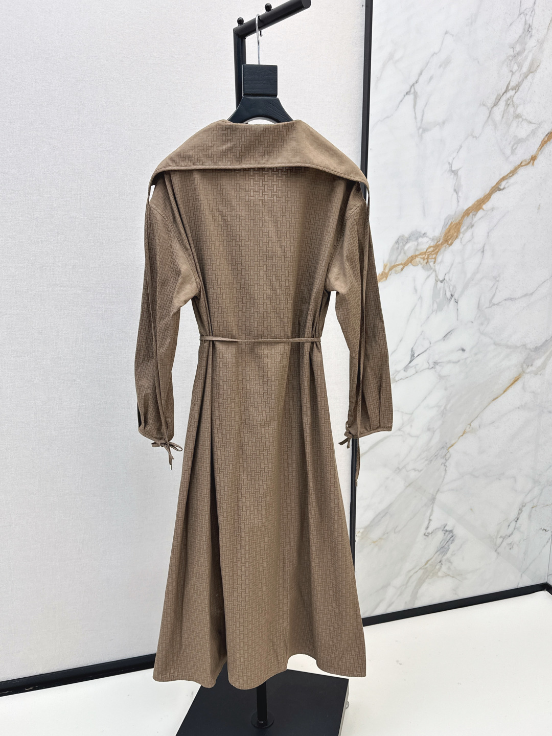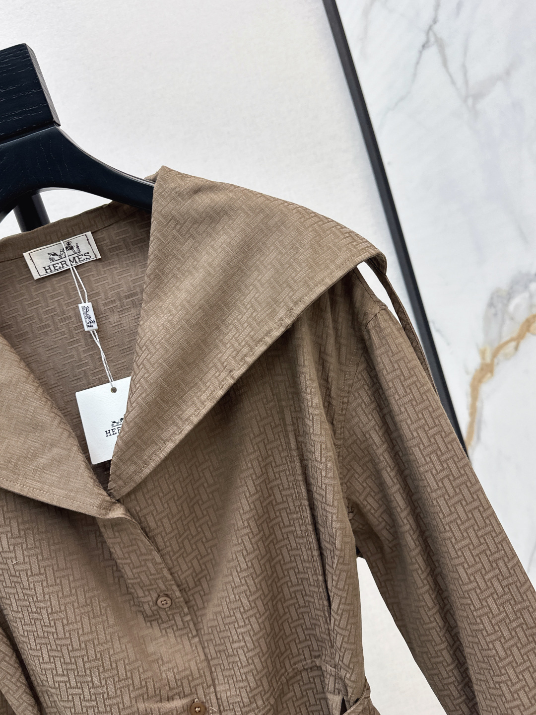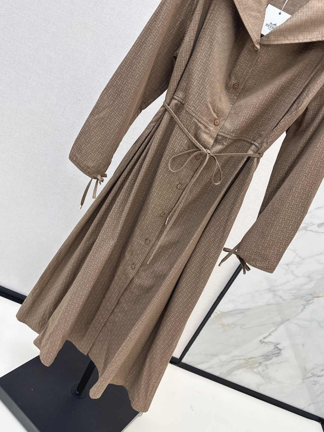 Details: Exclusive early autumn long trench coat dress with H - patterned jacquard, large lapel, and belt. Imported fabric, simple yet refined, with a flattering fit. Available in two colors.
