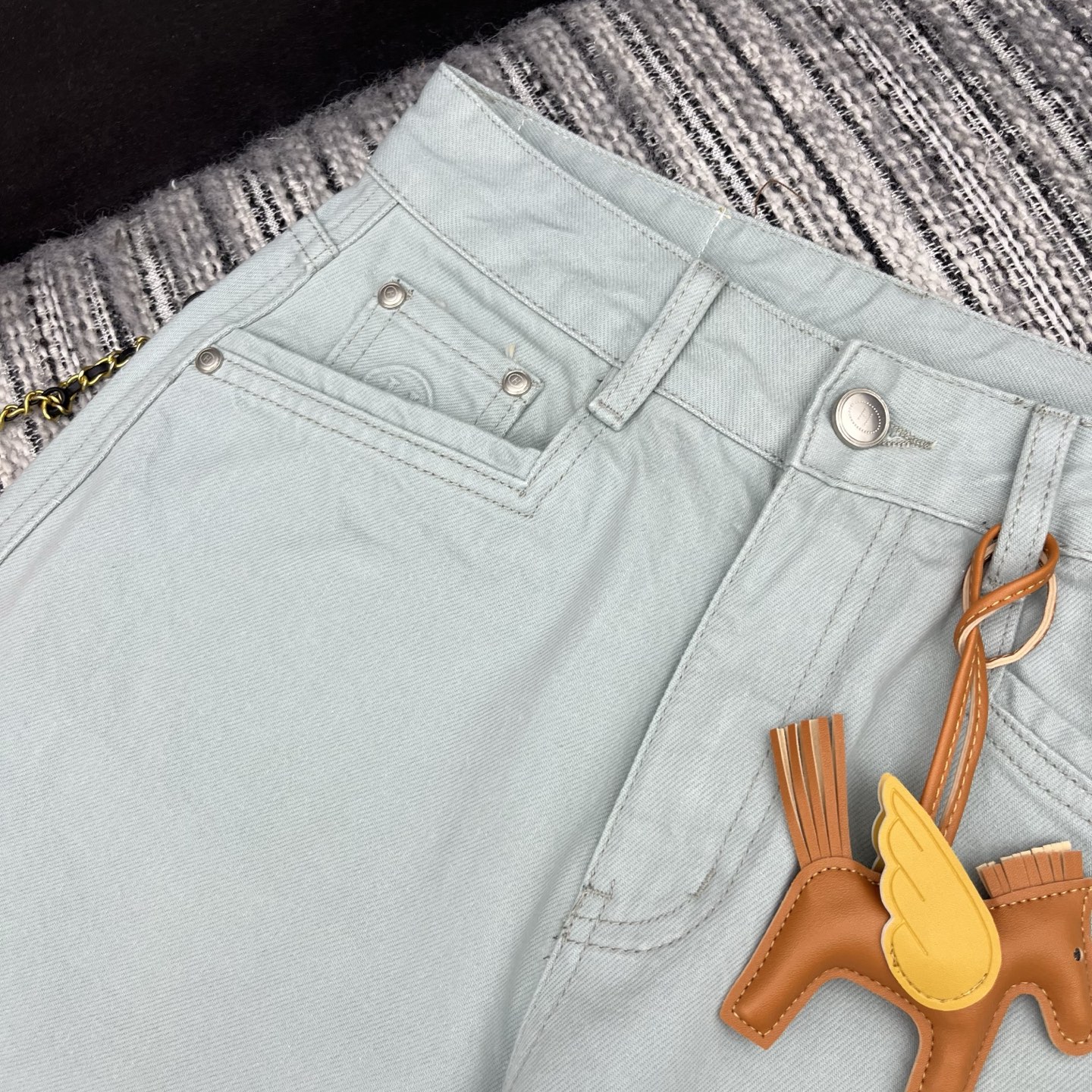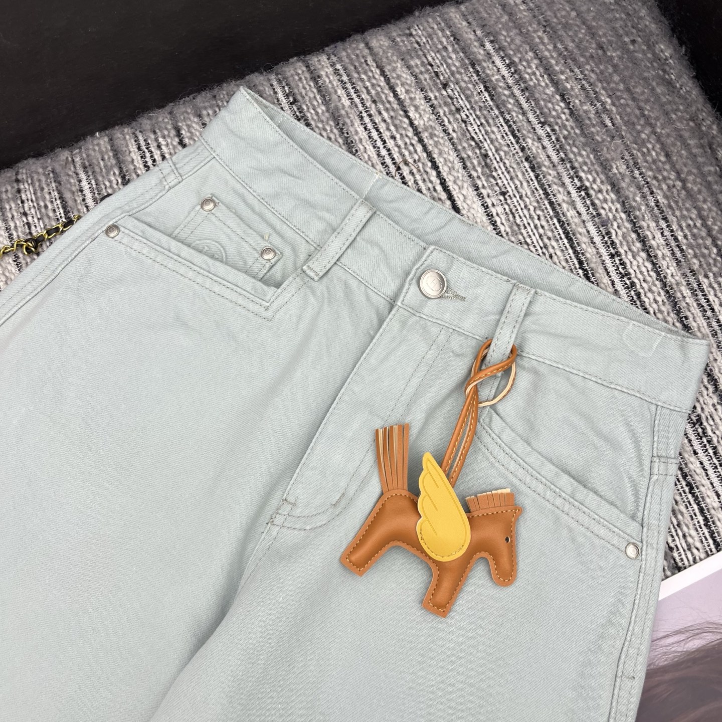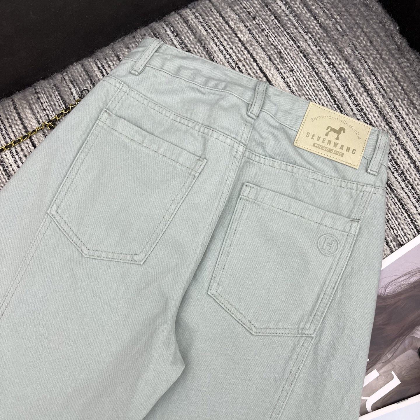 Details: New spring machete jeans with leather pony accessory, two colors.