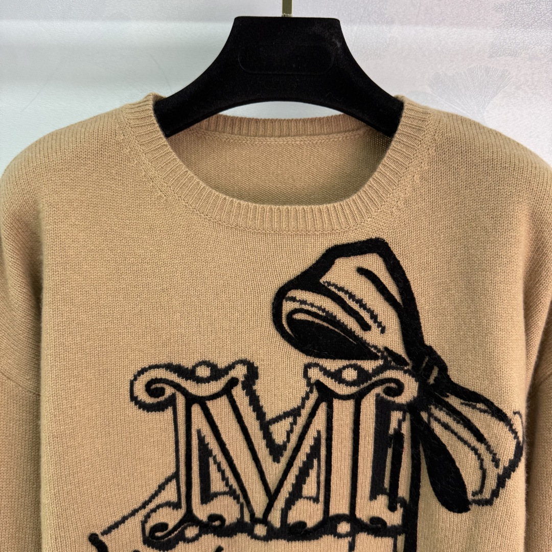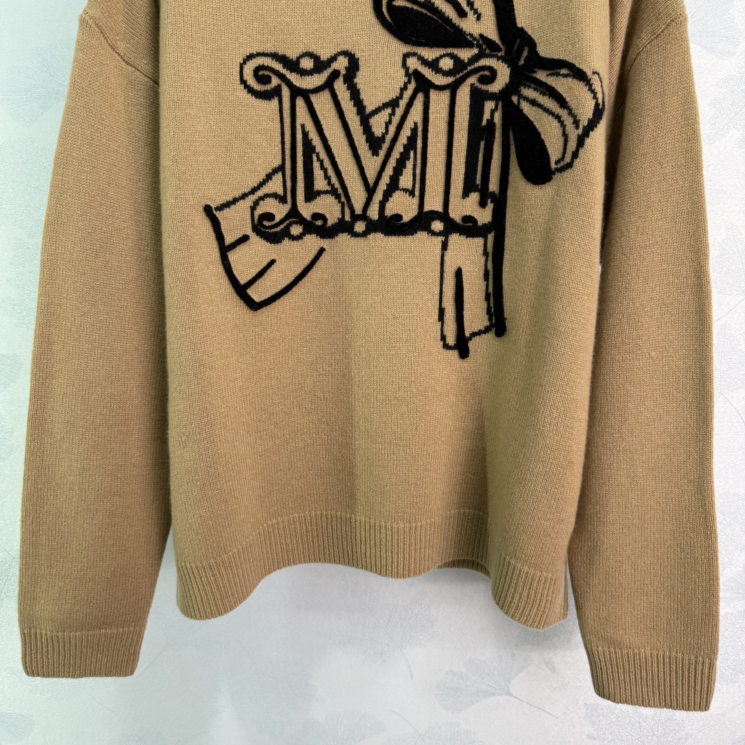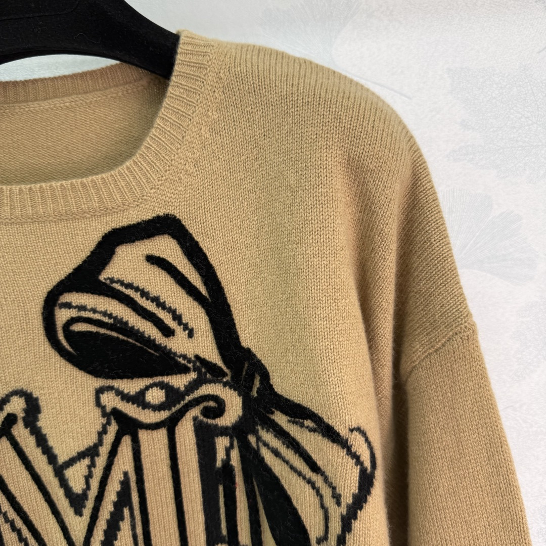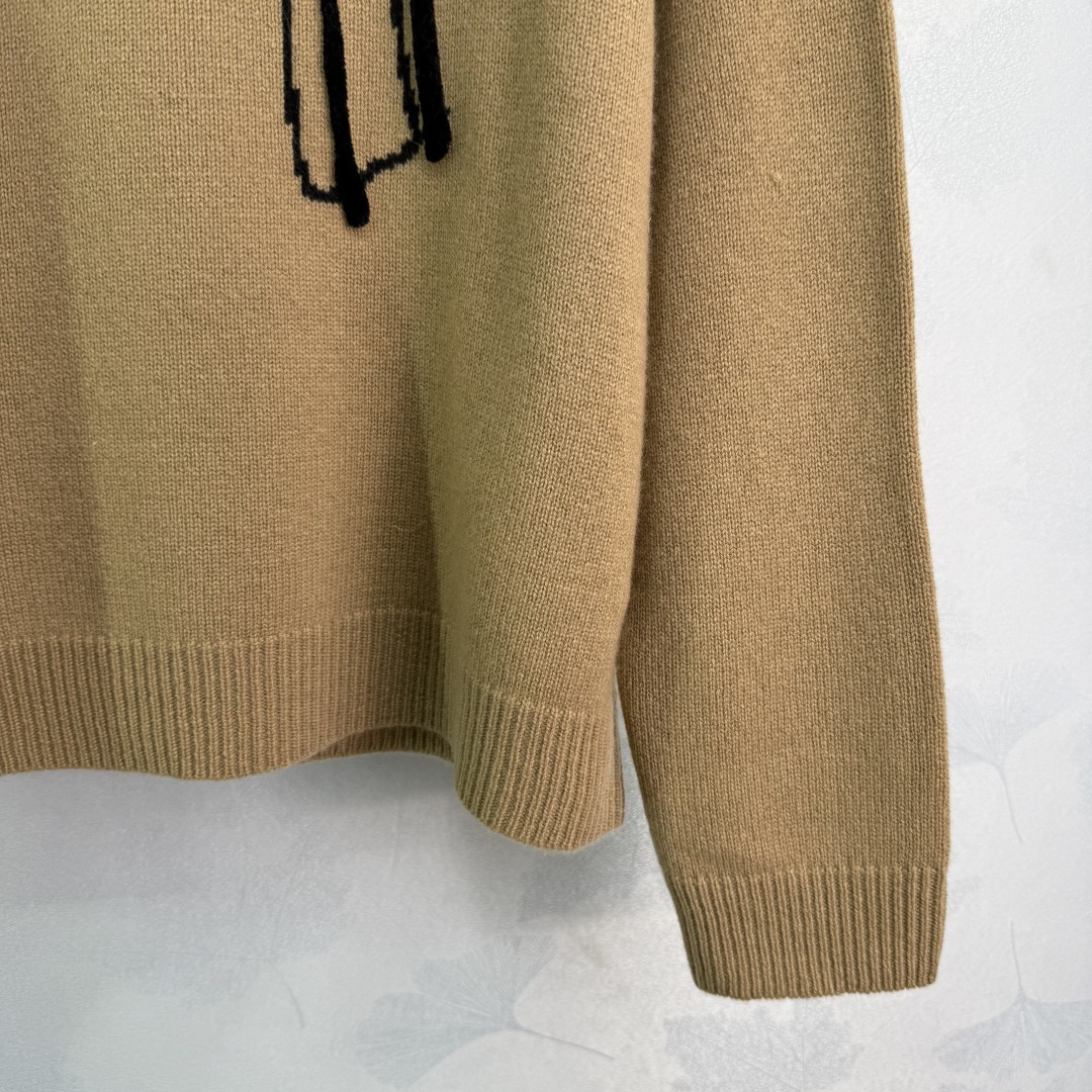 Details: Camel-colored cashmere sweater with black bow letter pattern, soft and comfortable, loose fit, perfect for autumn and winter.