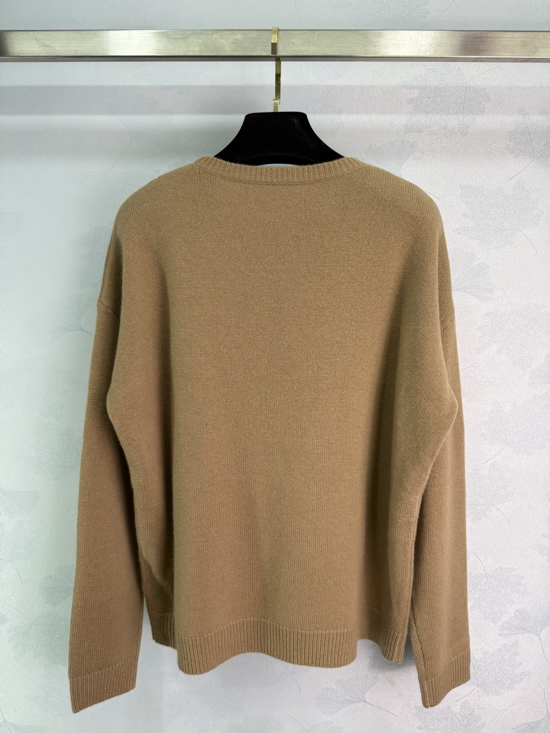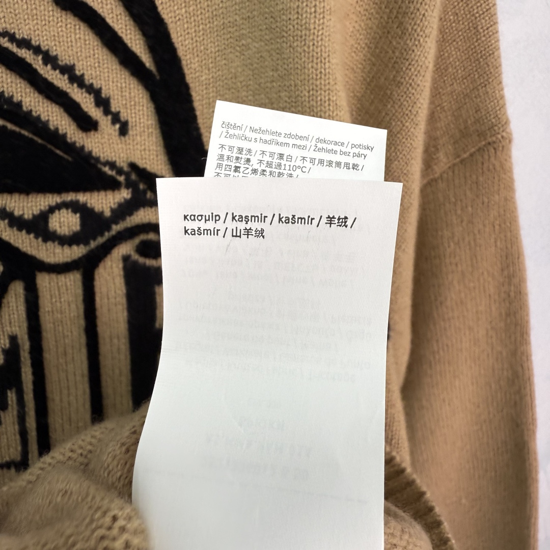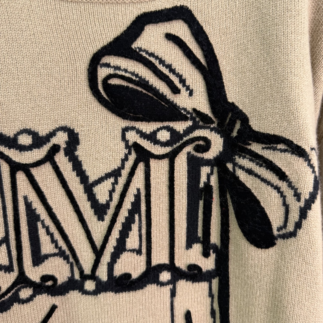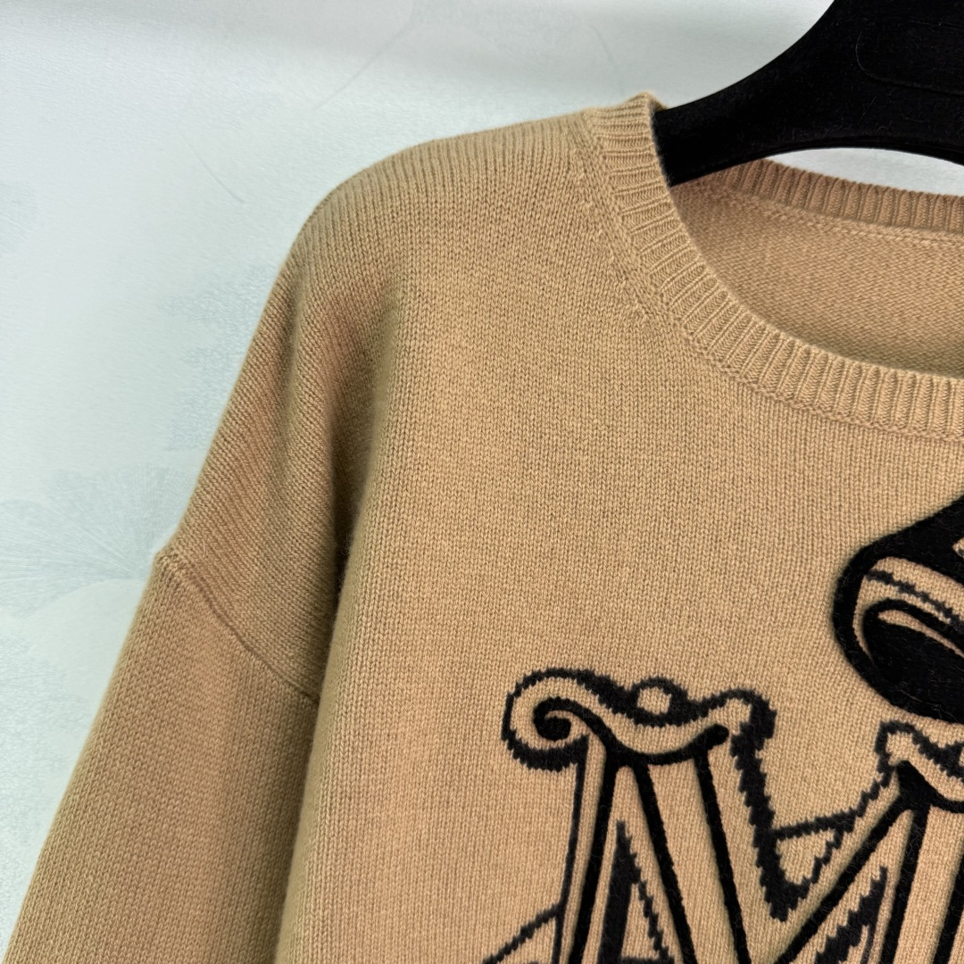 Details: Camel-colored cashmere sweater with black bow letter pattern, soft and comfortable, loose fit, perfect for autumn and winter.