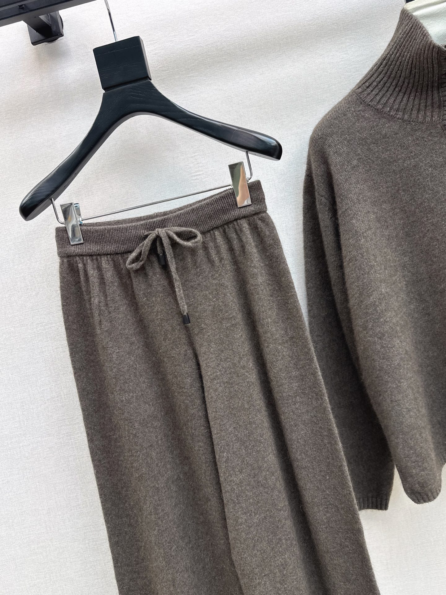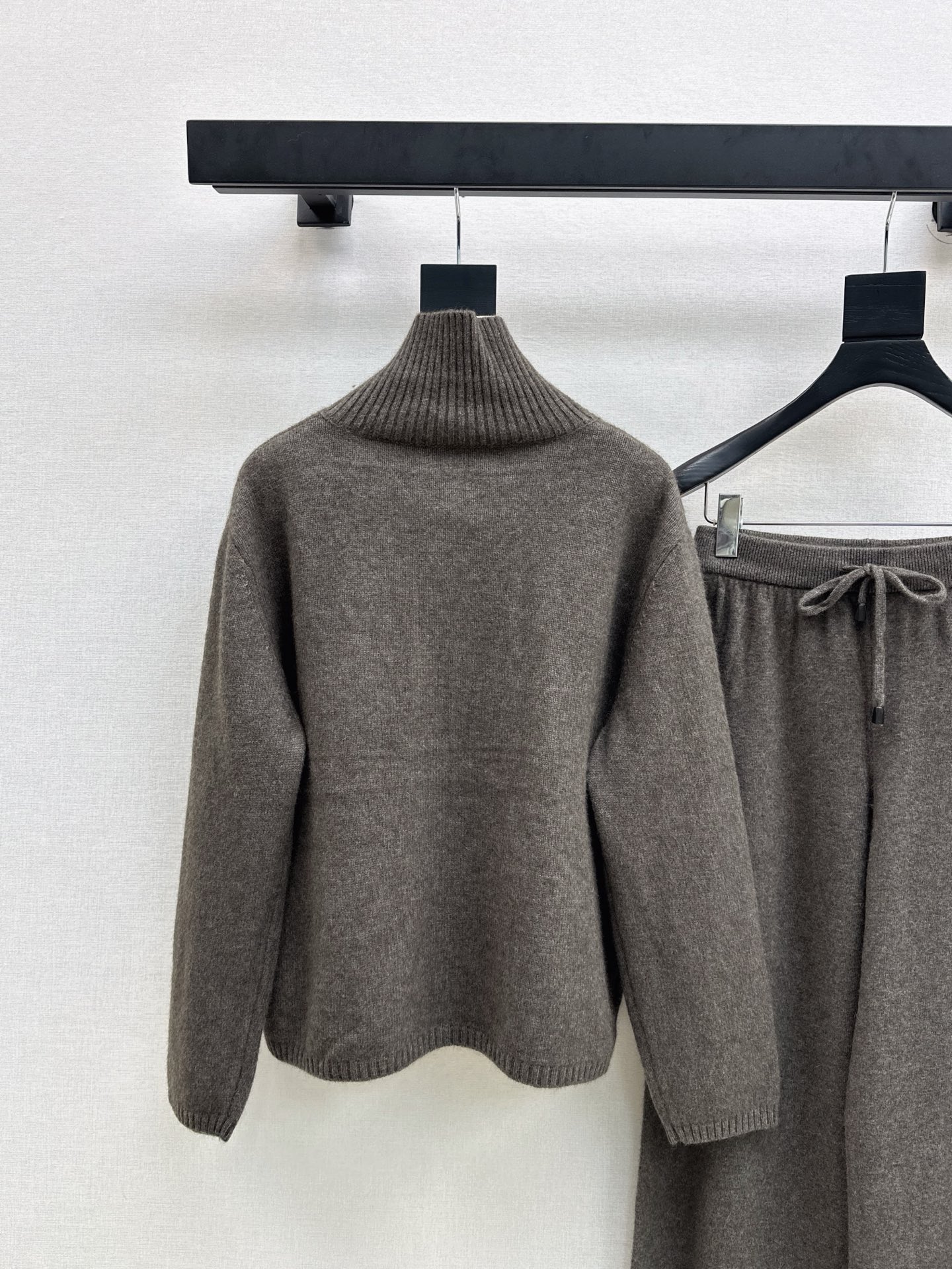 Details: Autumn-winter knitted suit set with lapel sweater and straight-leg pants, made of custom wool fabric. High-end Custom, Fine Craftsmanship
