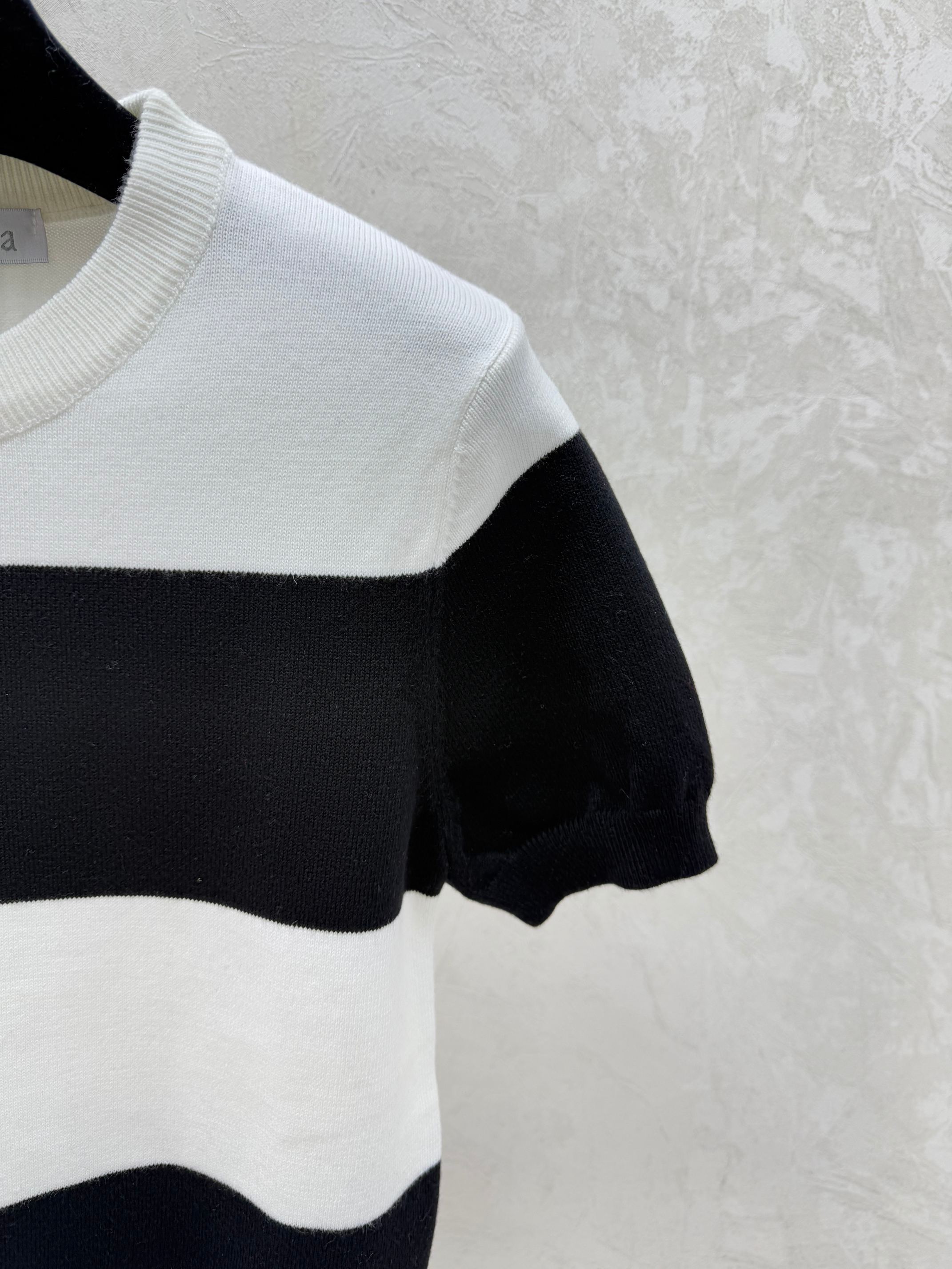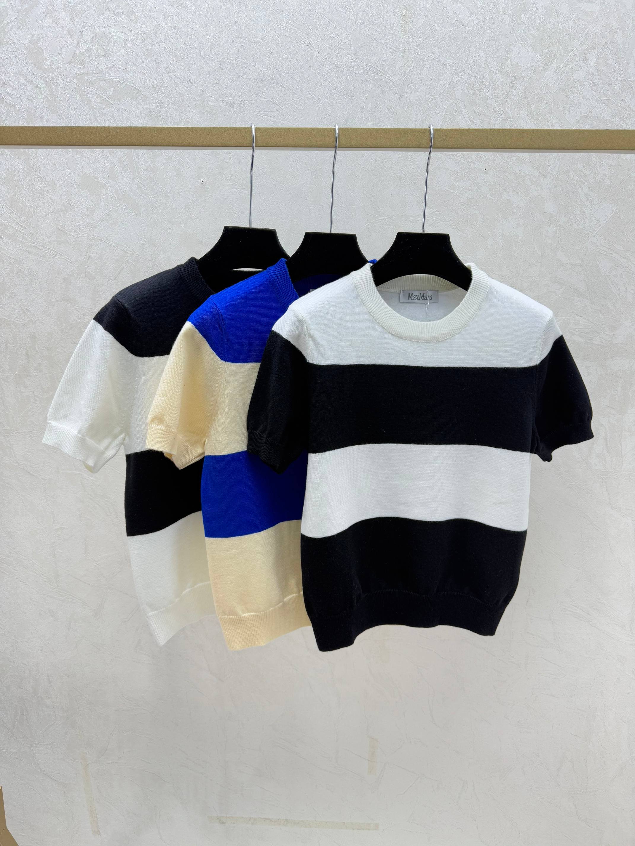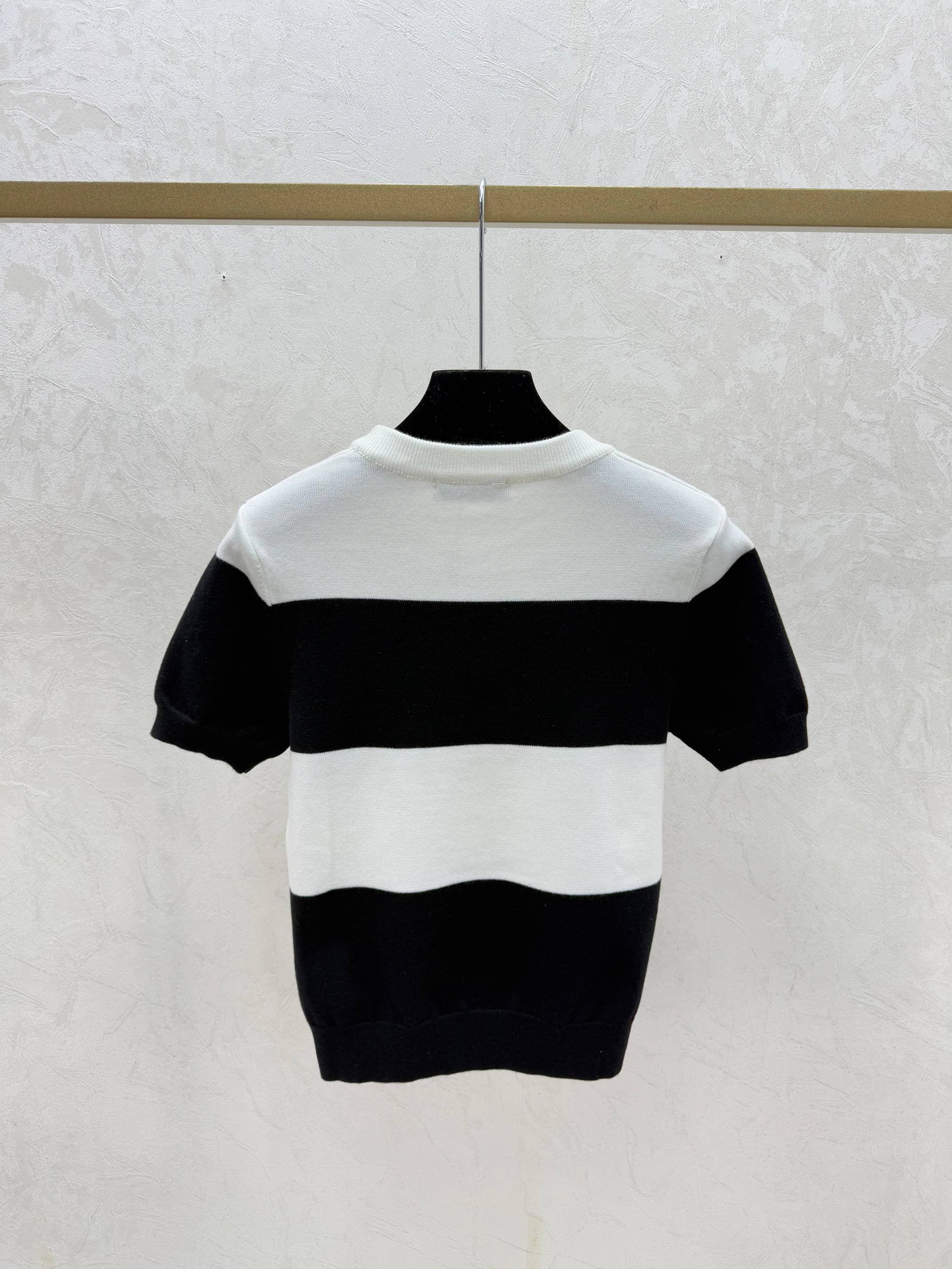 Details: Early spring new, color-blocked striped round-neck knitted short-sleeved top in white, sapphire and black. Sizes available: 36, 38, 40. High-end custom, fine workmanship