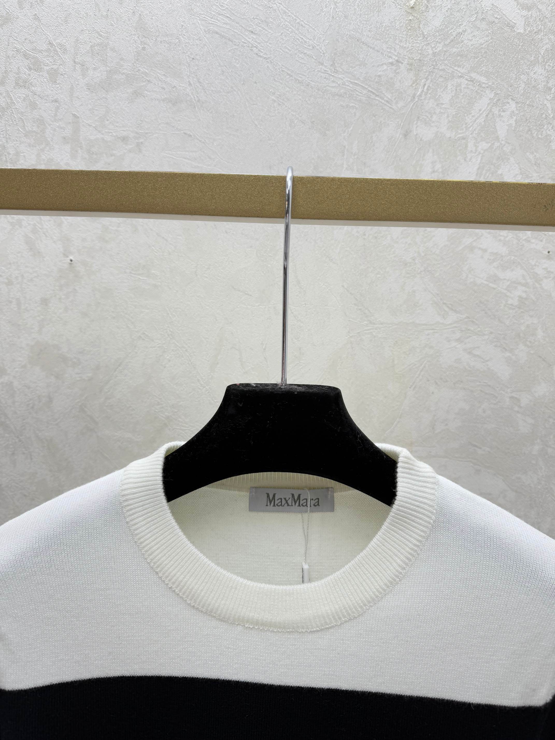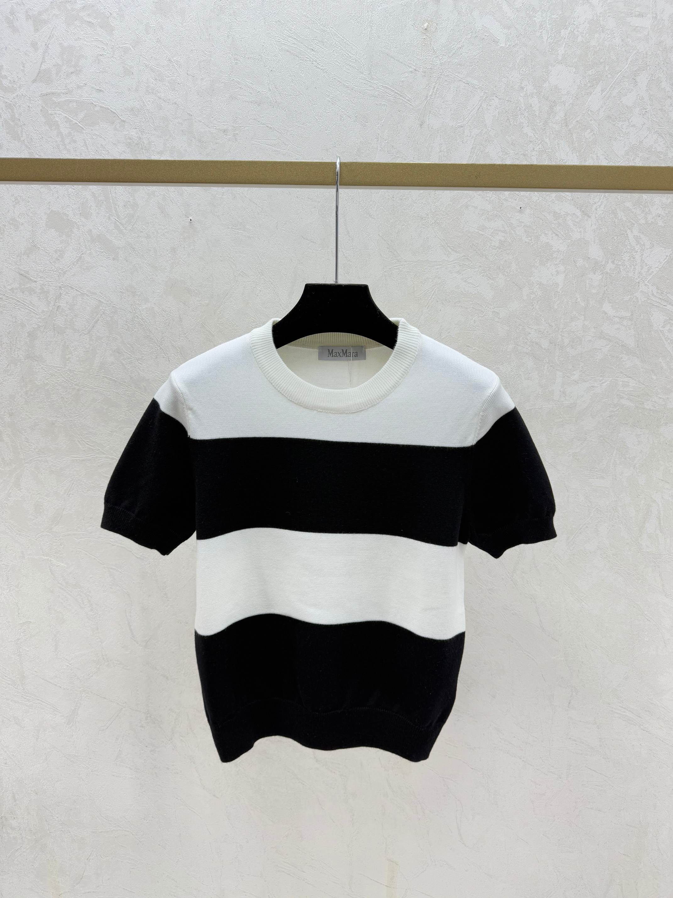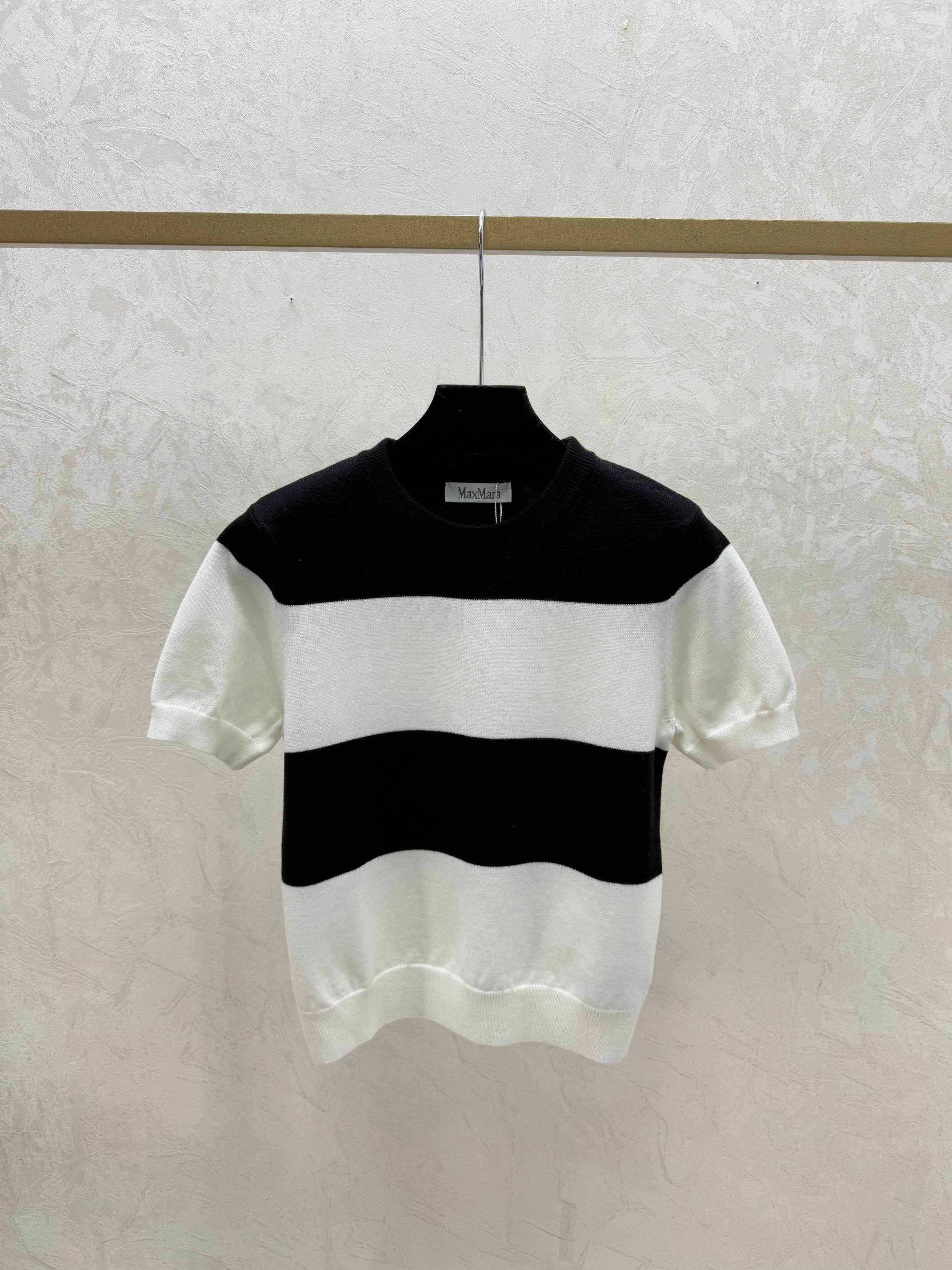 Details: Early spring new, color-blocked striped round-neck knitted short-sleeved top in white, sapphire and black. Sizes available: 36, 38, 40. High-end custom, fine workmanship