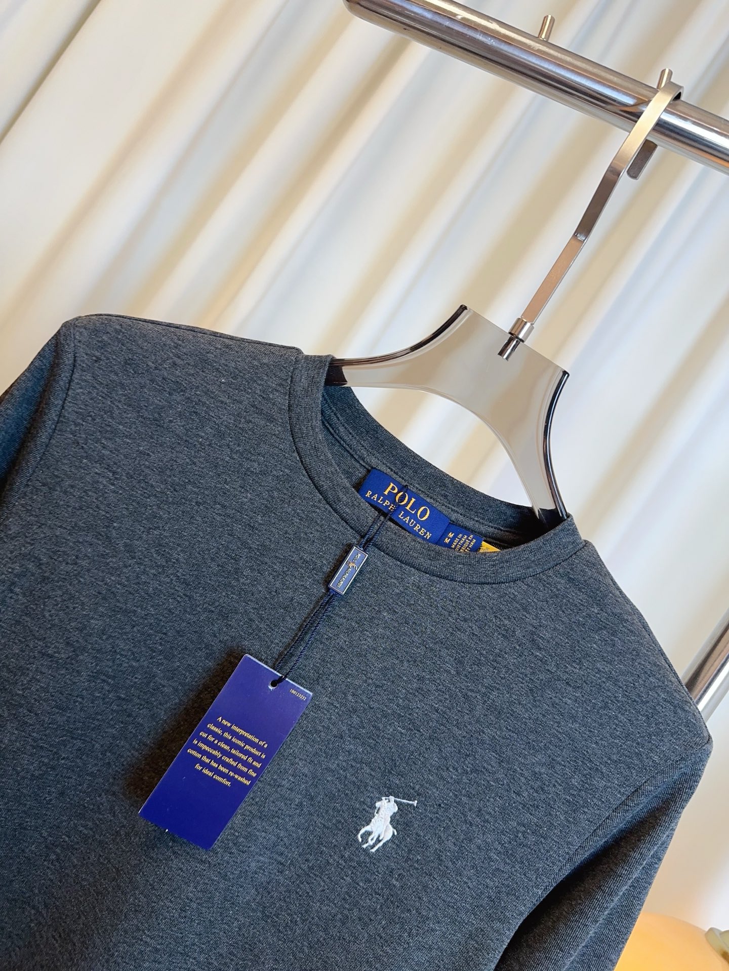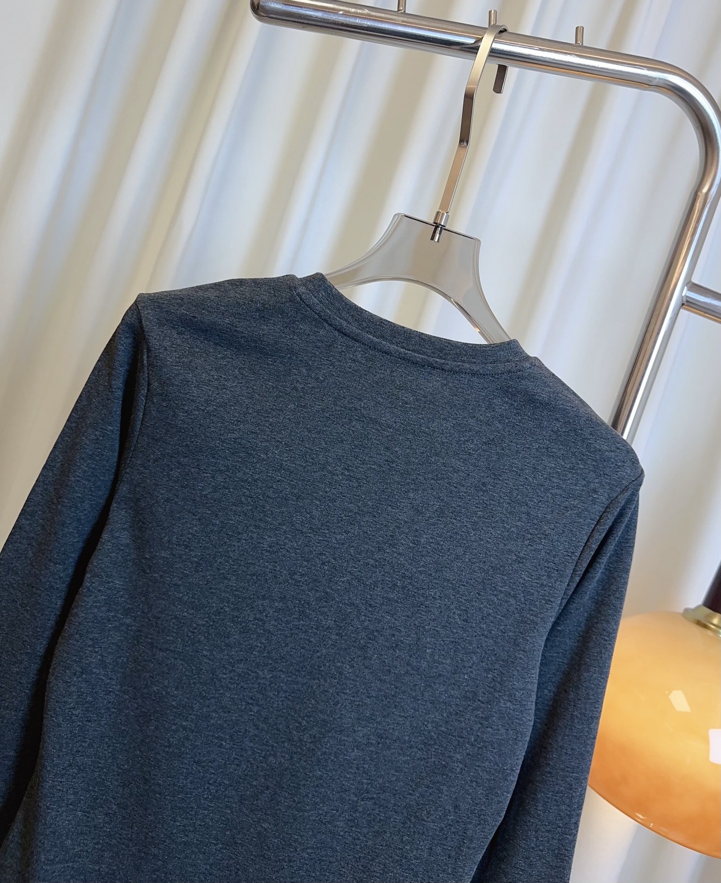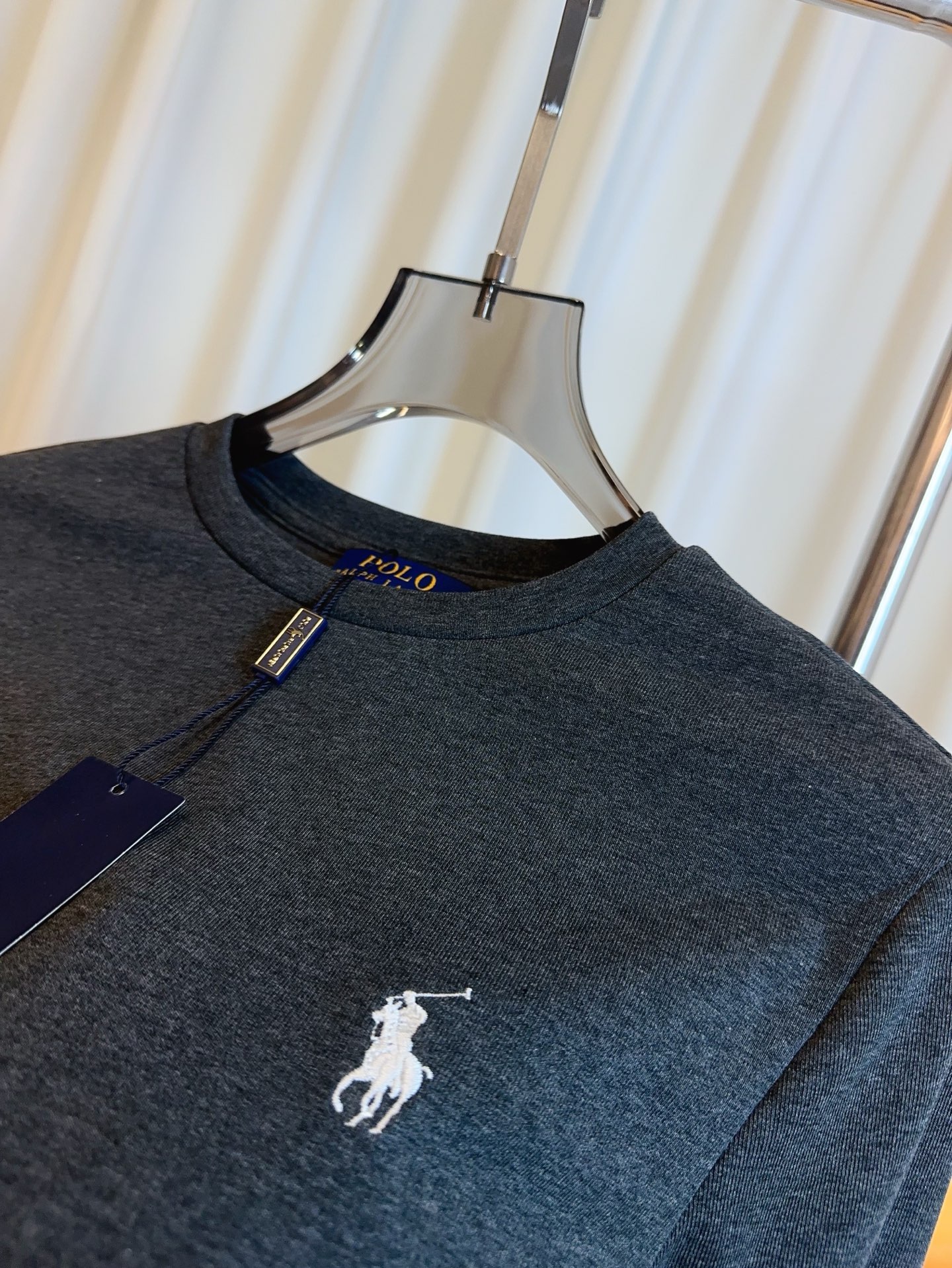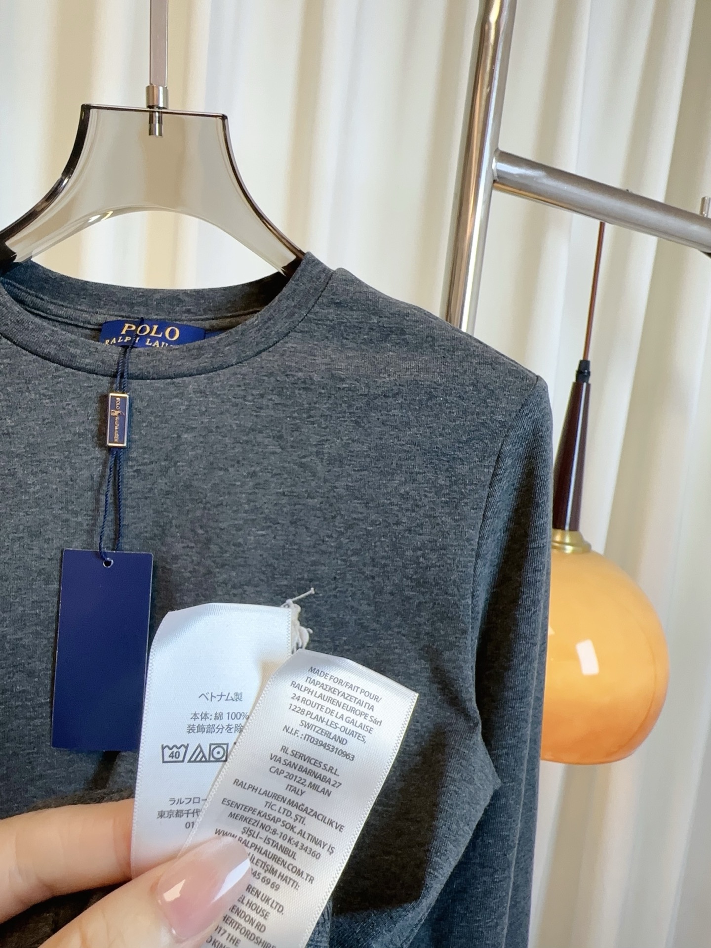 Details: Custom-made cotton long-sleeved T-shirt with small embroidered logo, in white, grey and black.