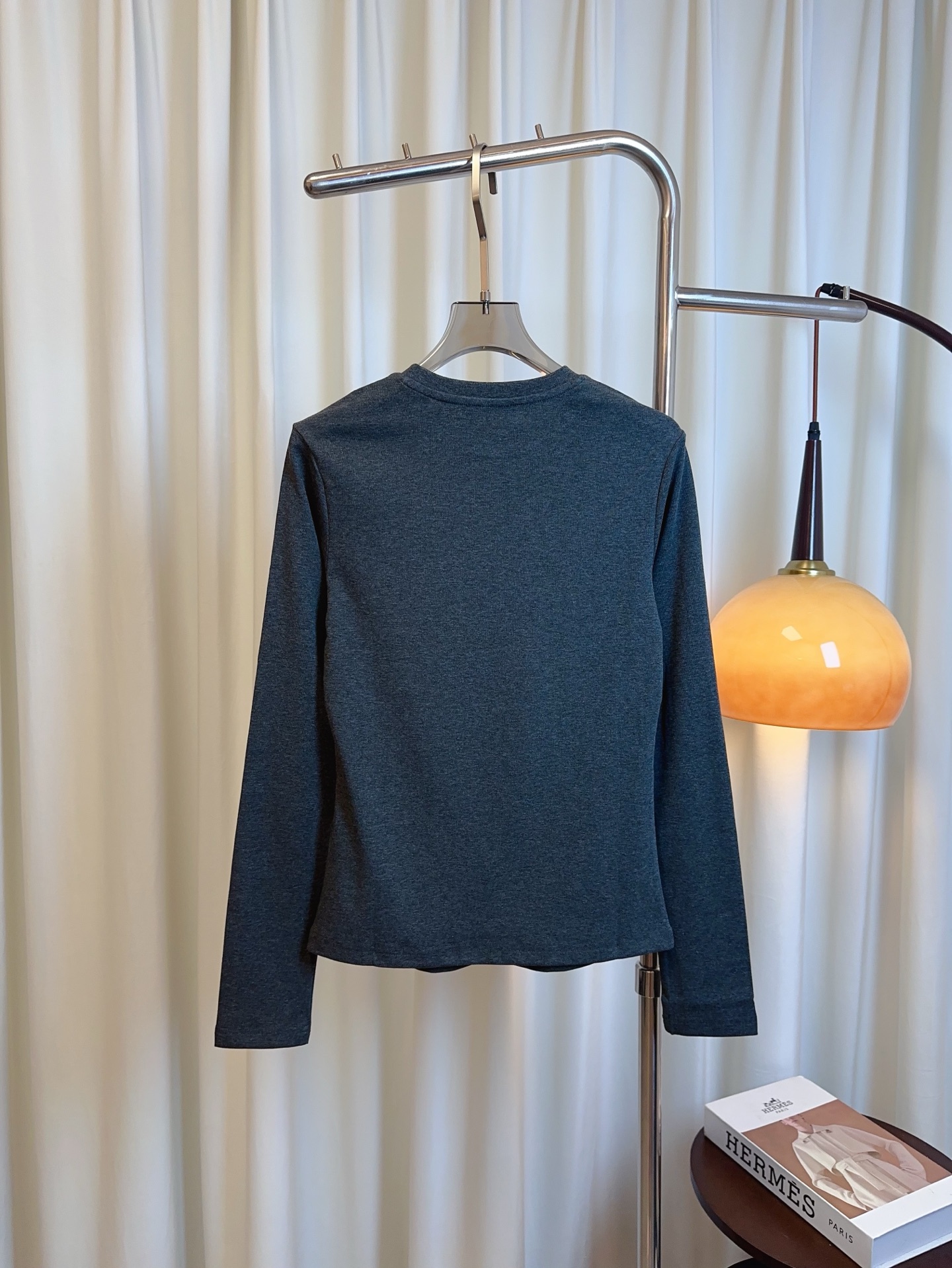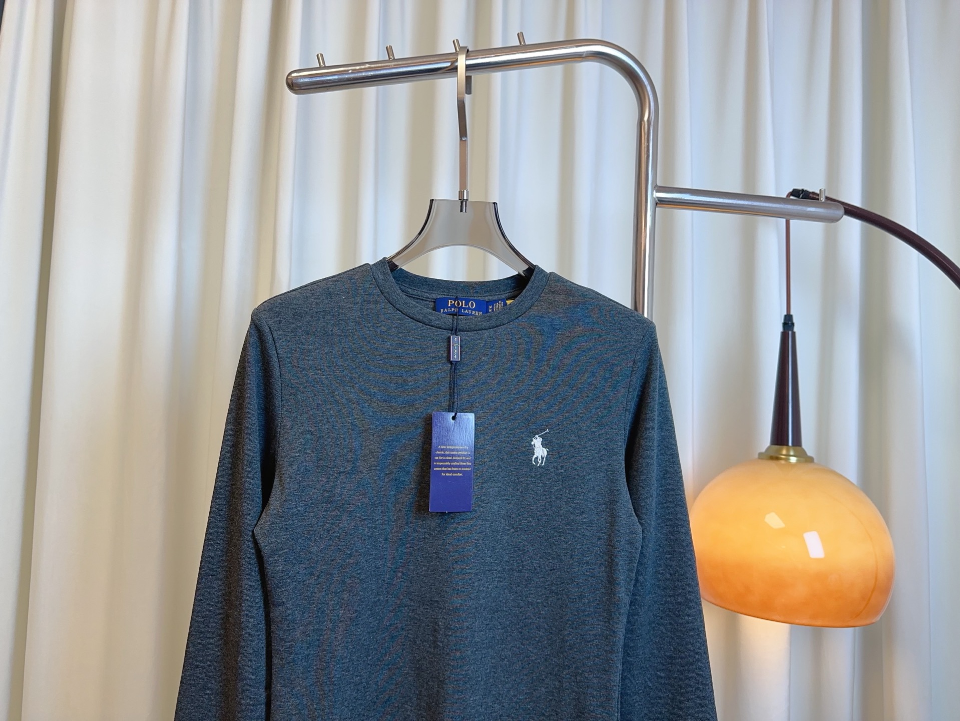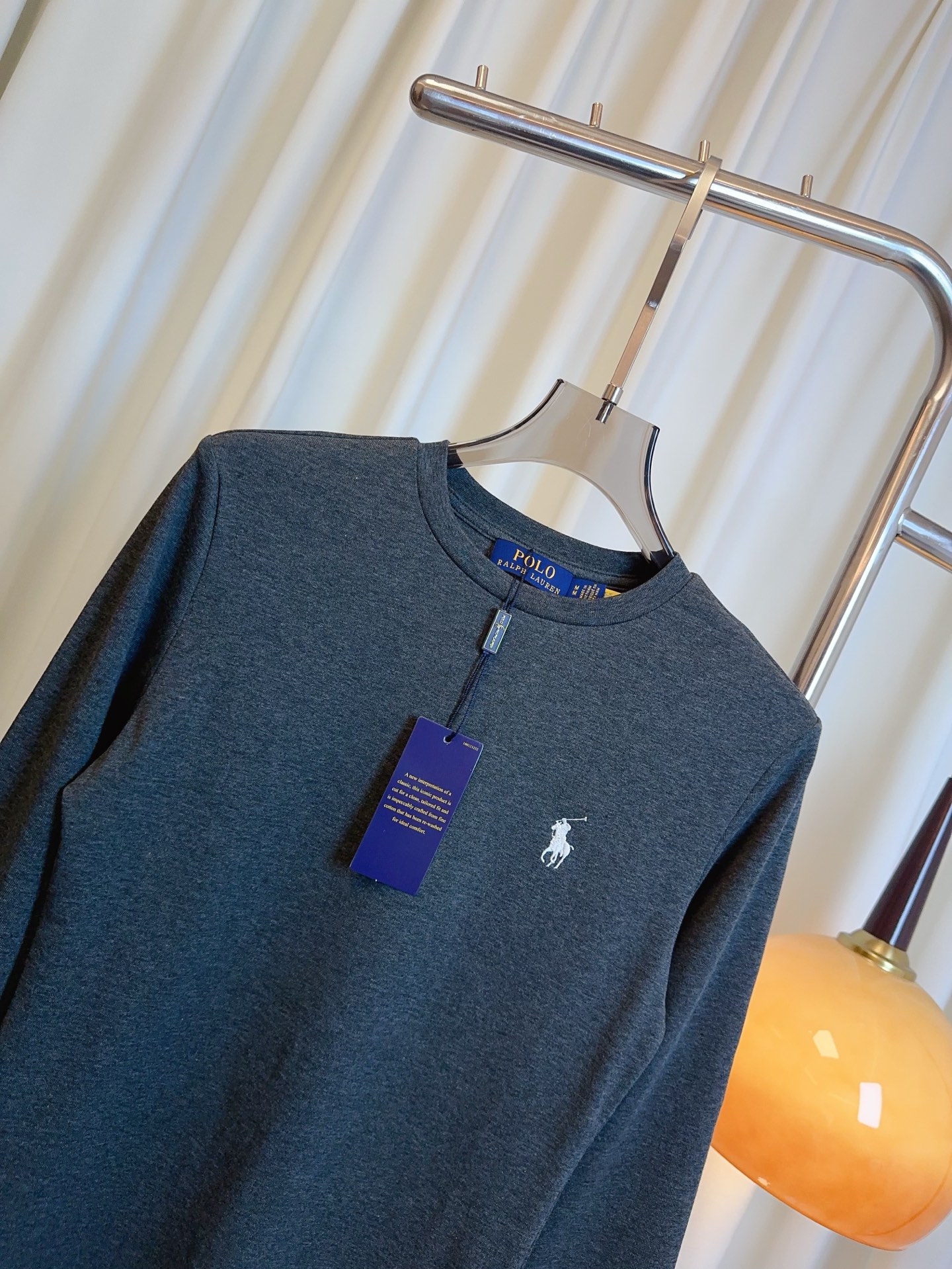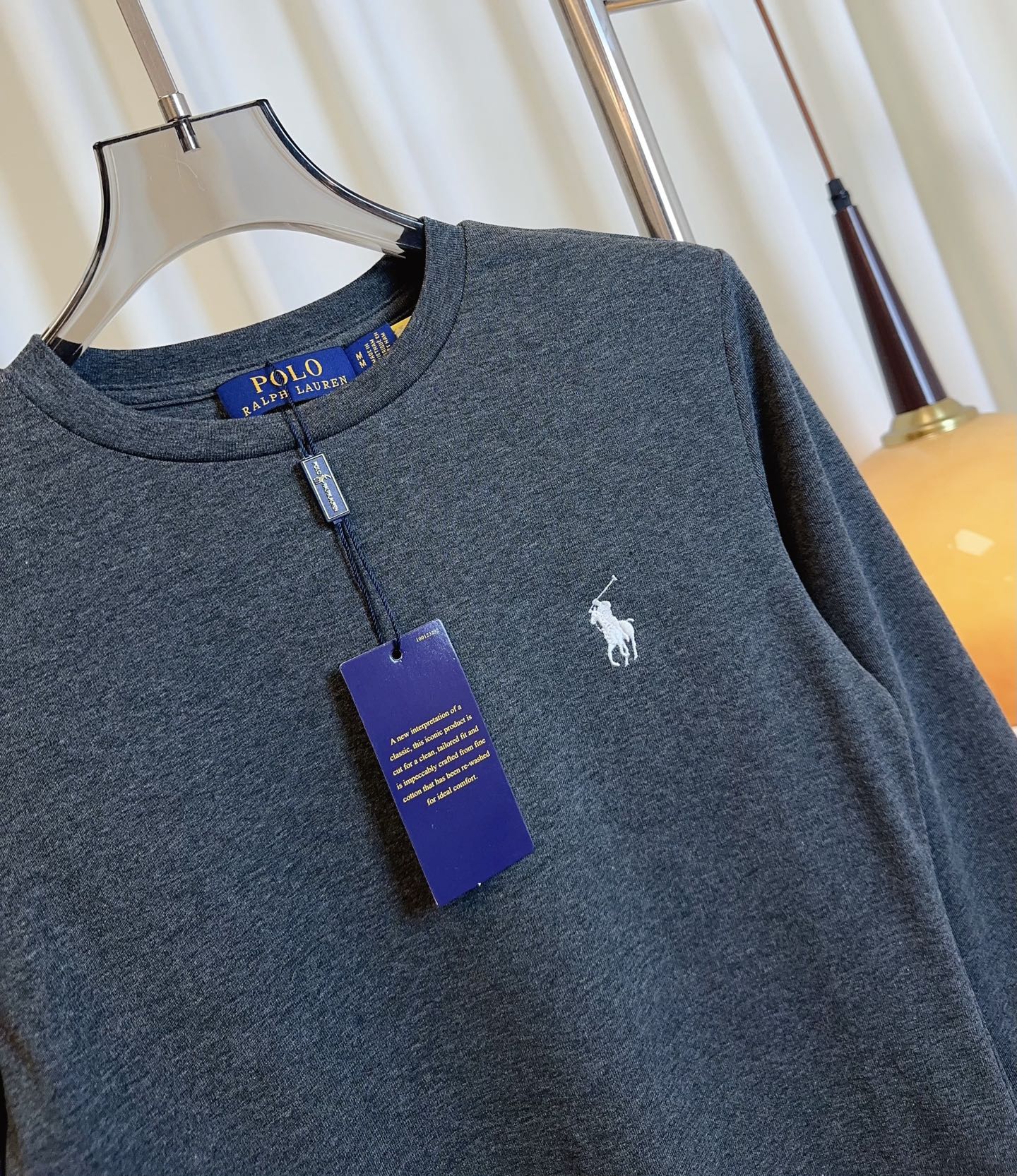 Details: Custom-made cotton long-sleeved T-shirt with small embroidered logo, in white, grey and black.