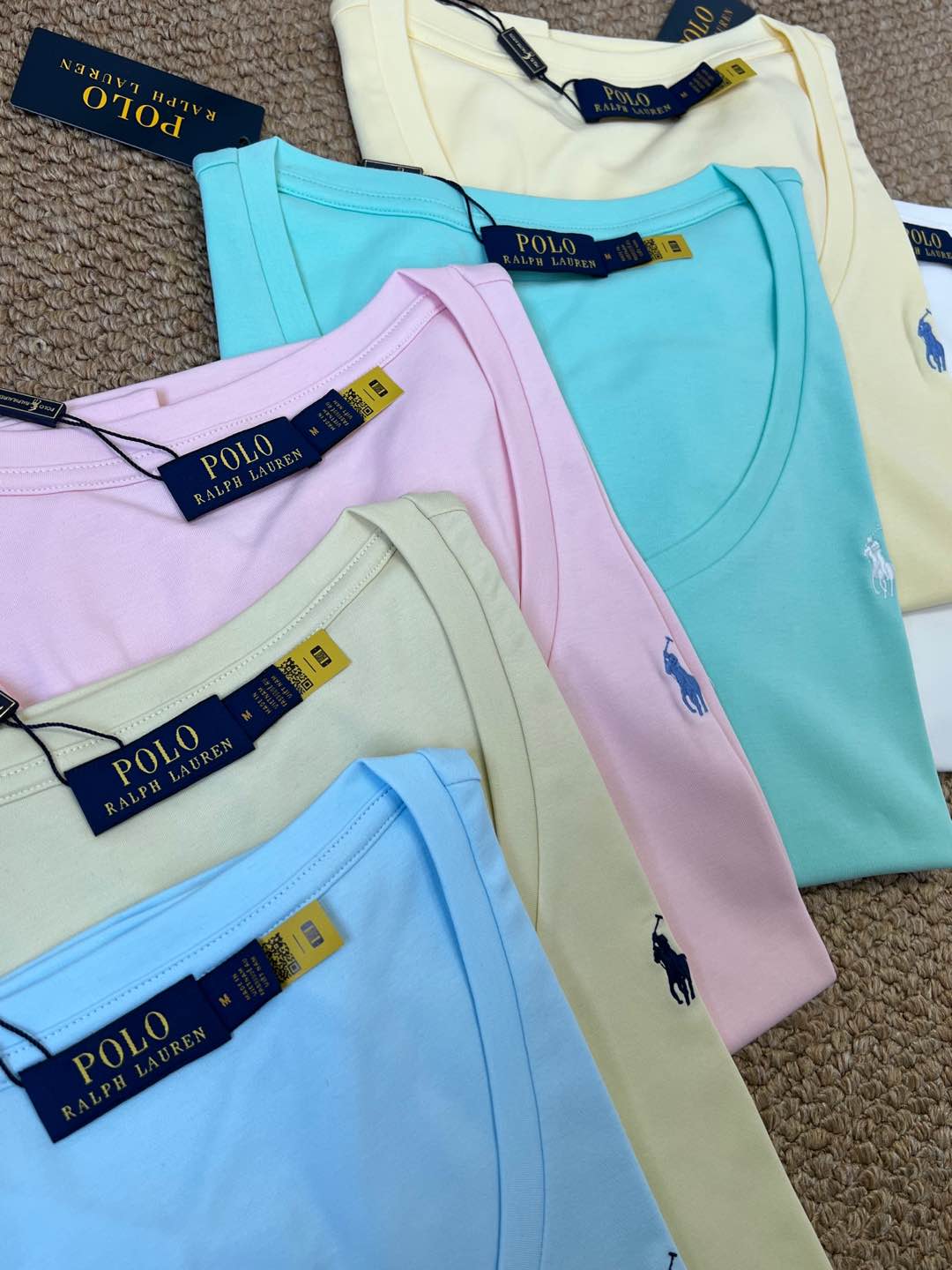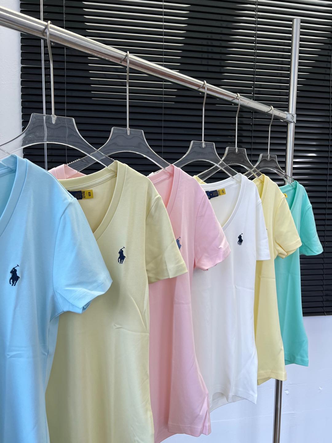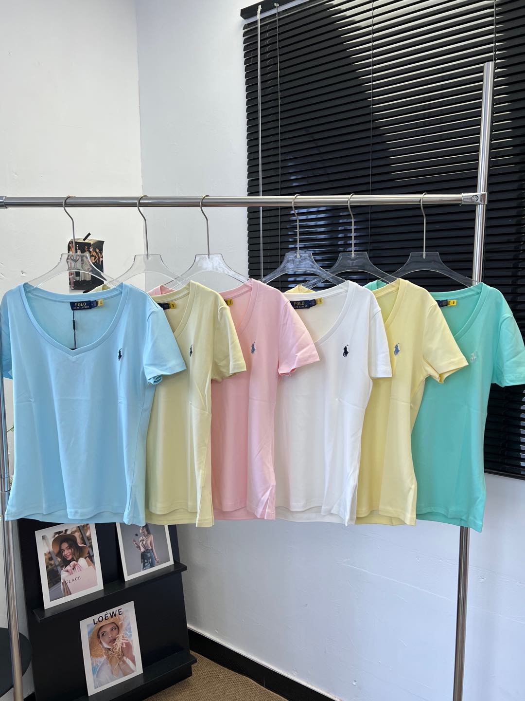 Details: V-neck short-sleeved T-shirt with embroidered horse logo, macaron colors, suitable for women with curves, high-end customization