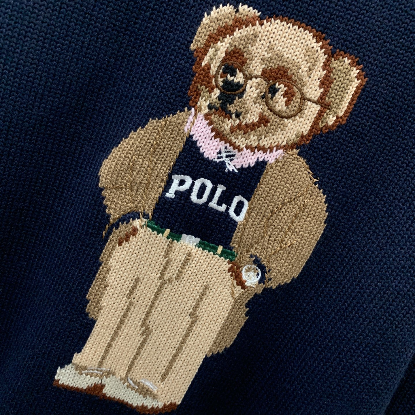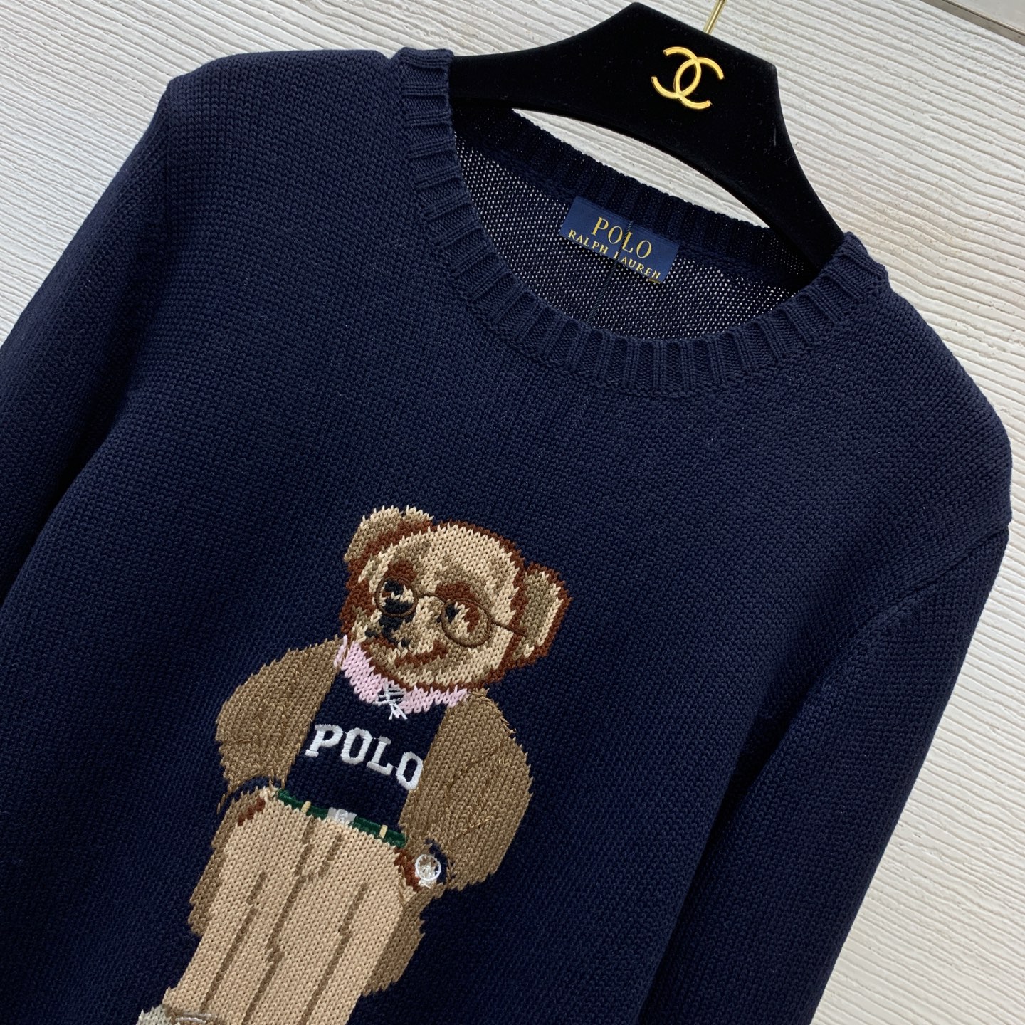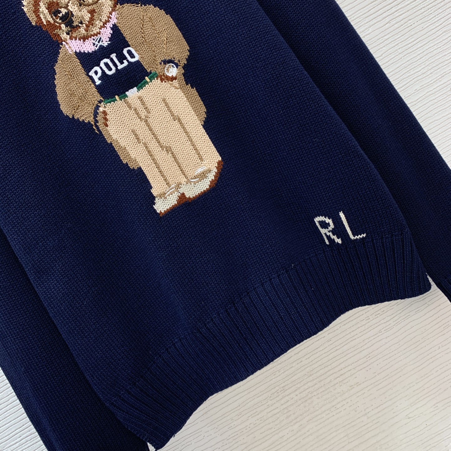 Details: Navy blue round - neck knitted top with POLO bear and RL logo. High - end custom, fine workmanship