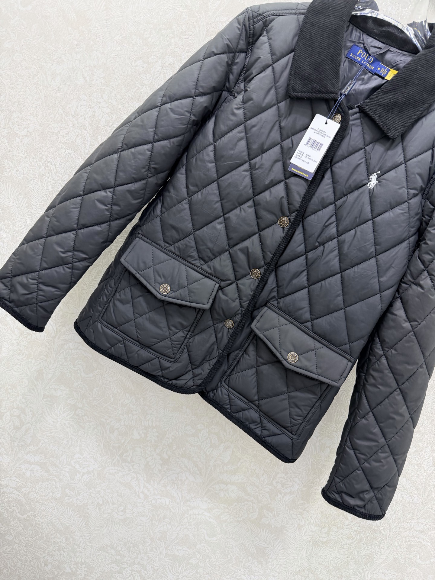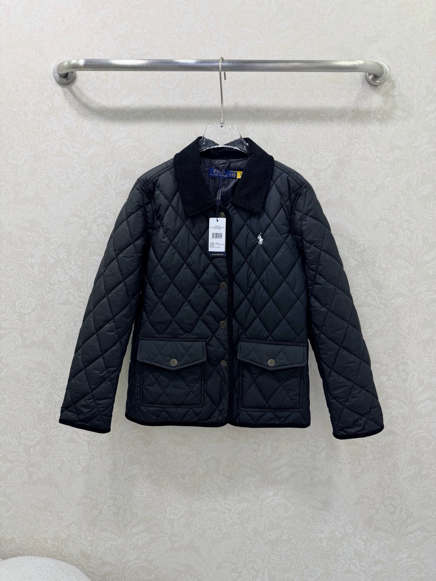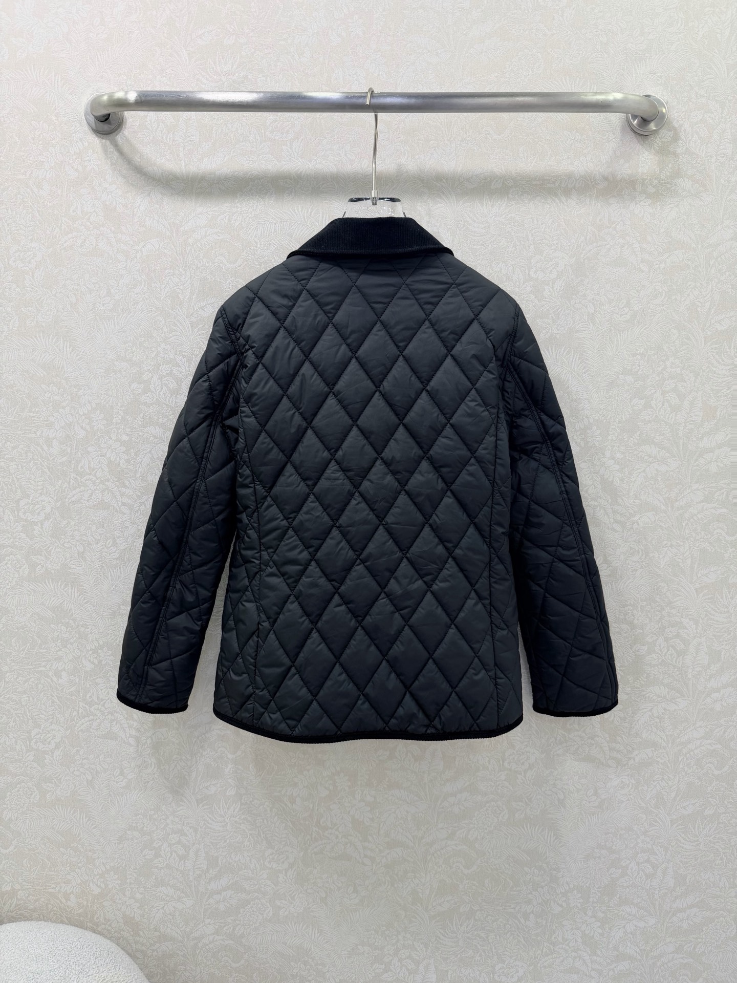 Details: New Diamond-Patterned Mid-Length Cotton Jacket, Luxurious Corduroy Collar and Cuffs, Horse Embroidery, Single-Breasted, Custom Hardware, Classic Checkered Pattern, Recycled Polyester Pockets, High-End Custom, Fine Craftsmanship