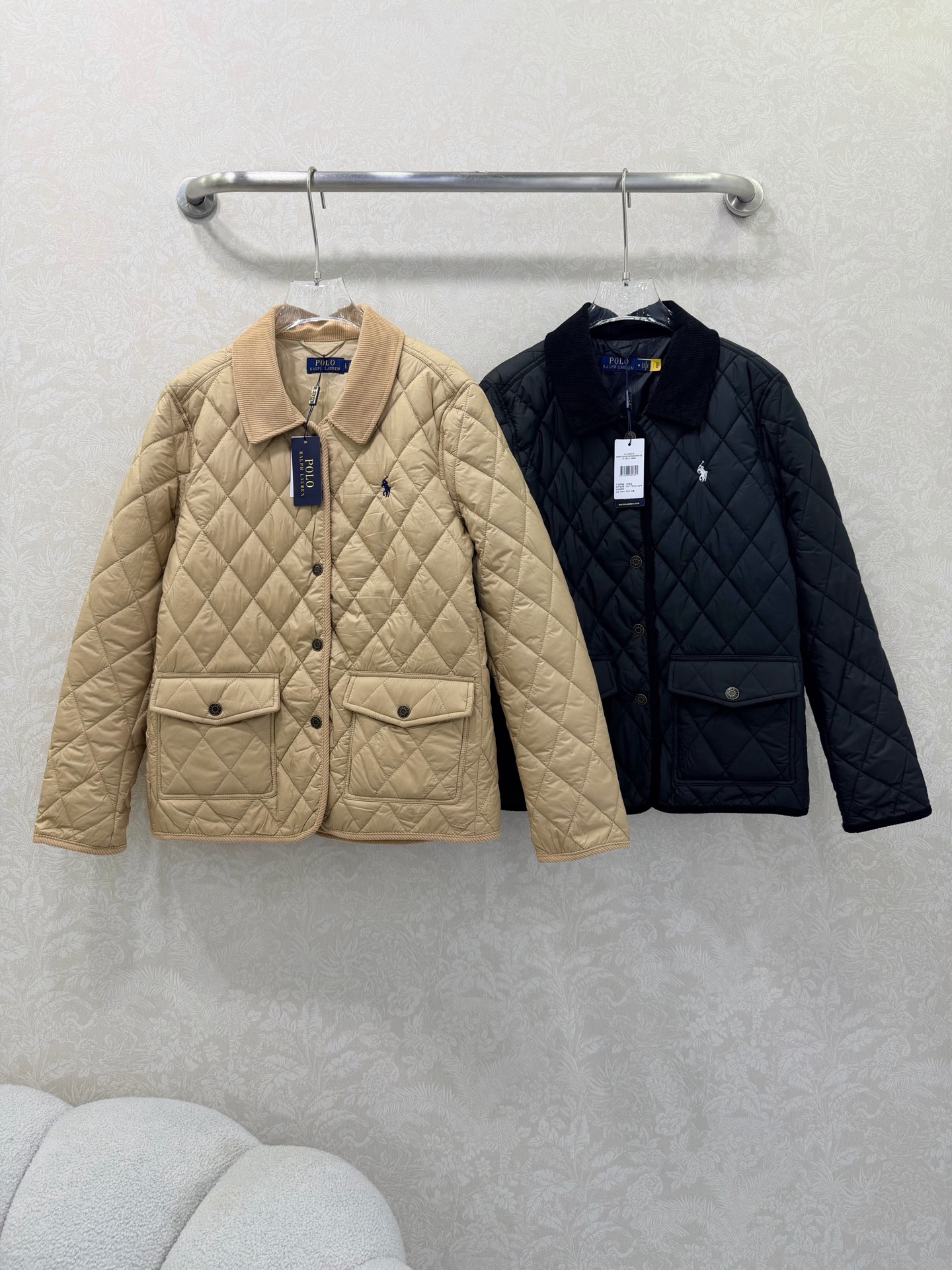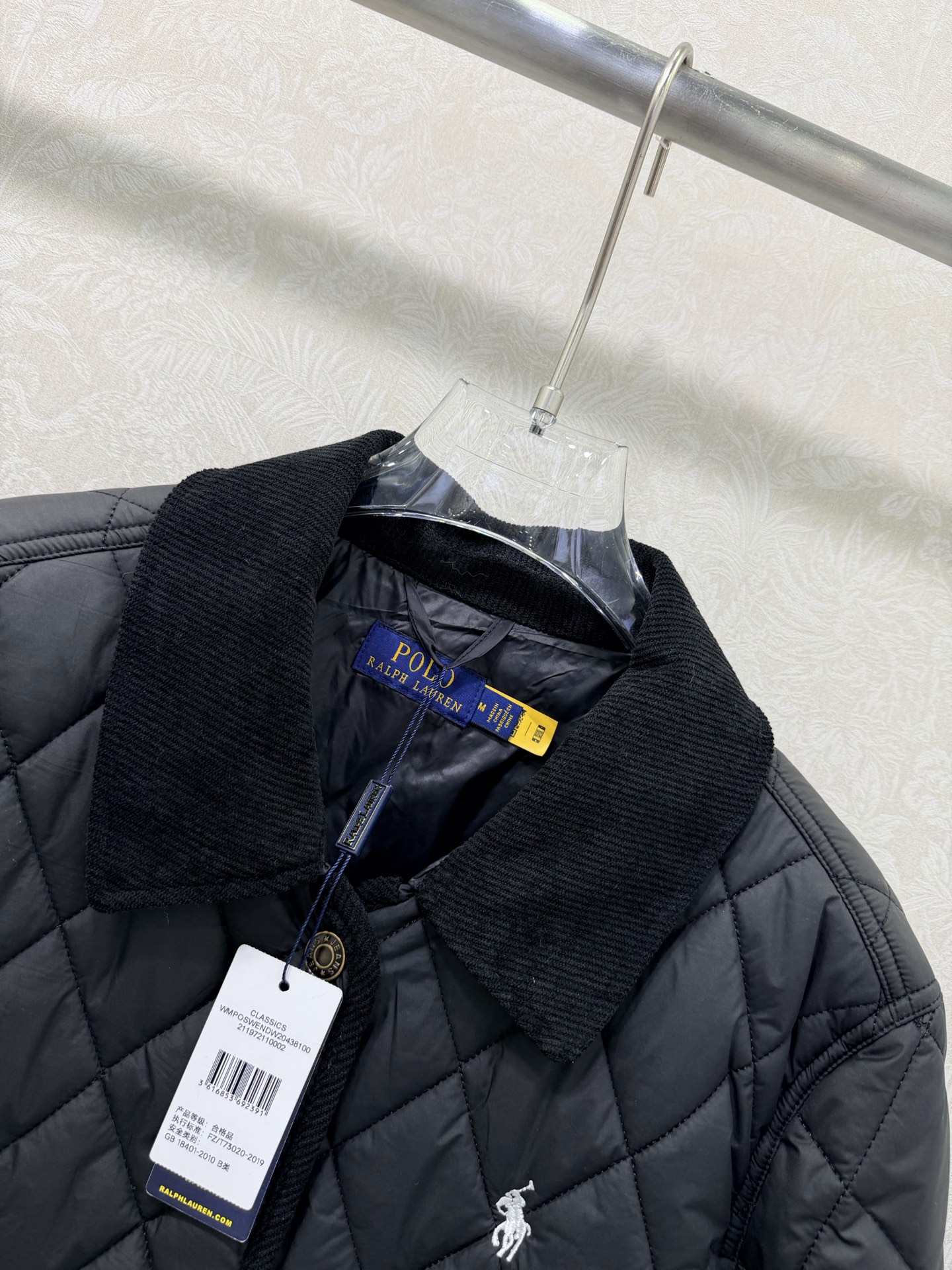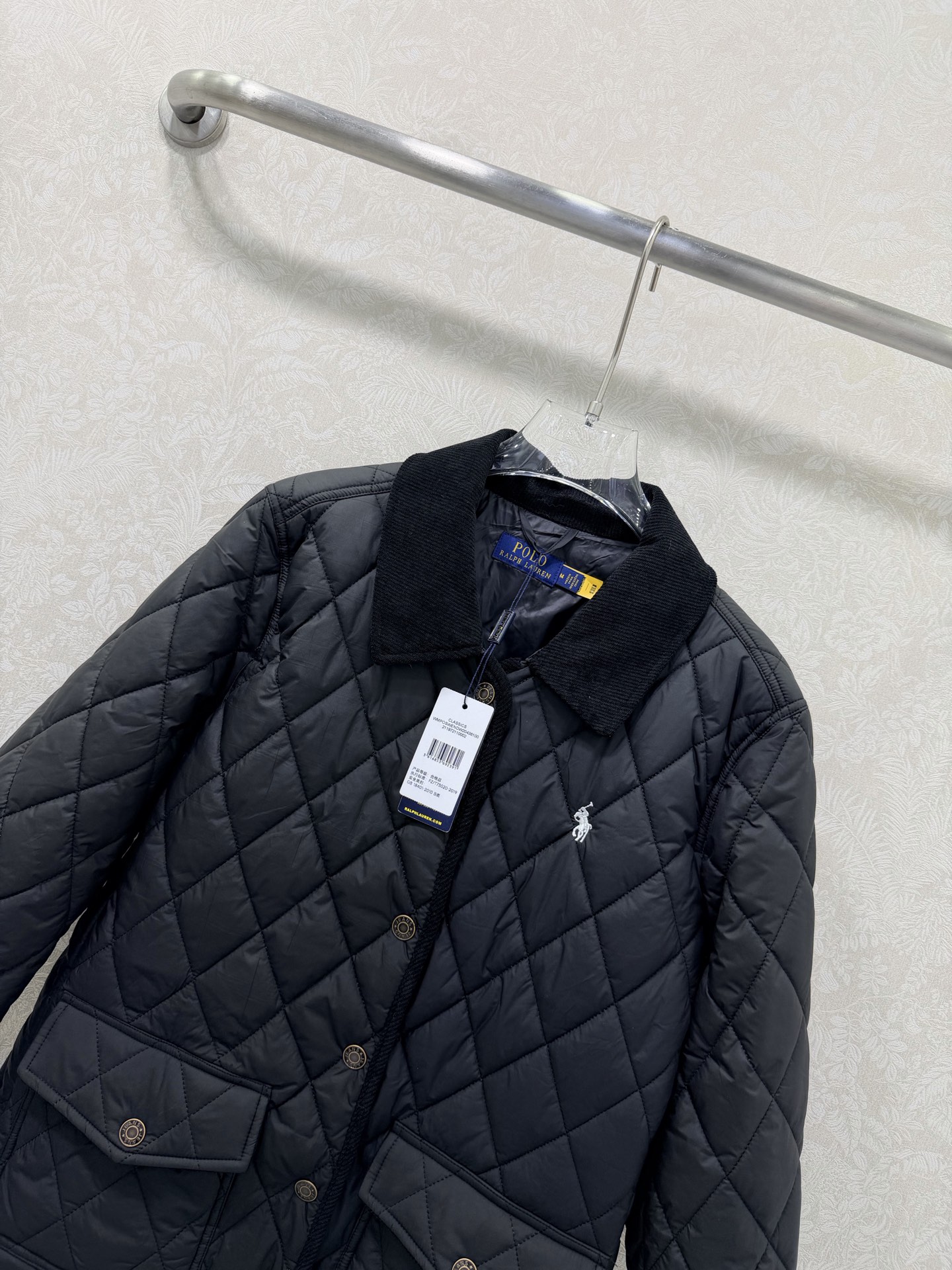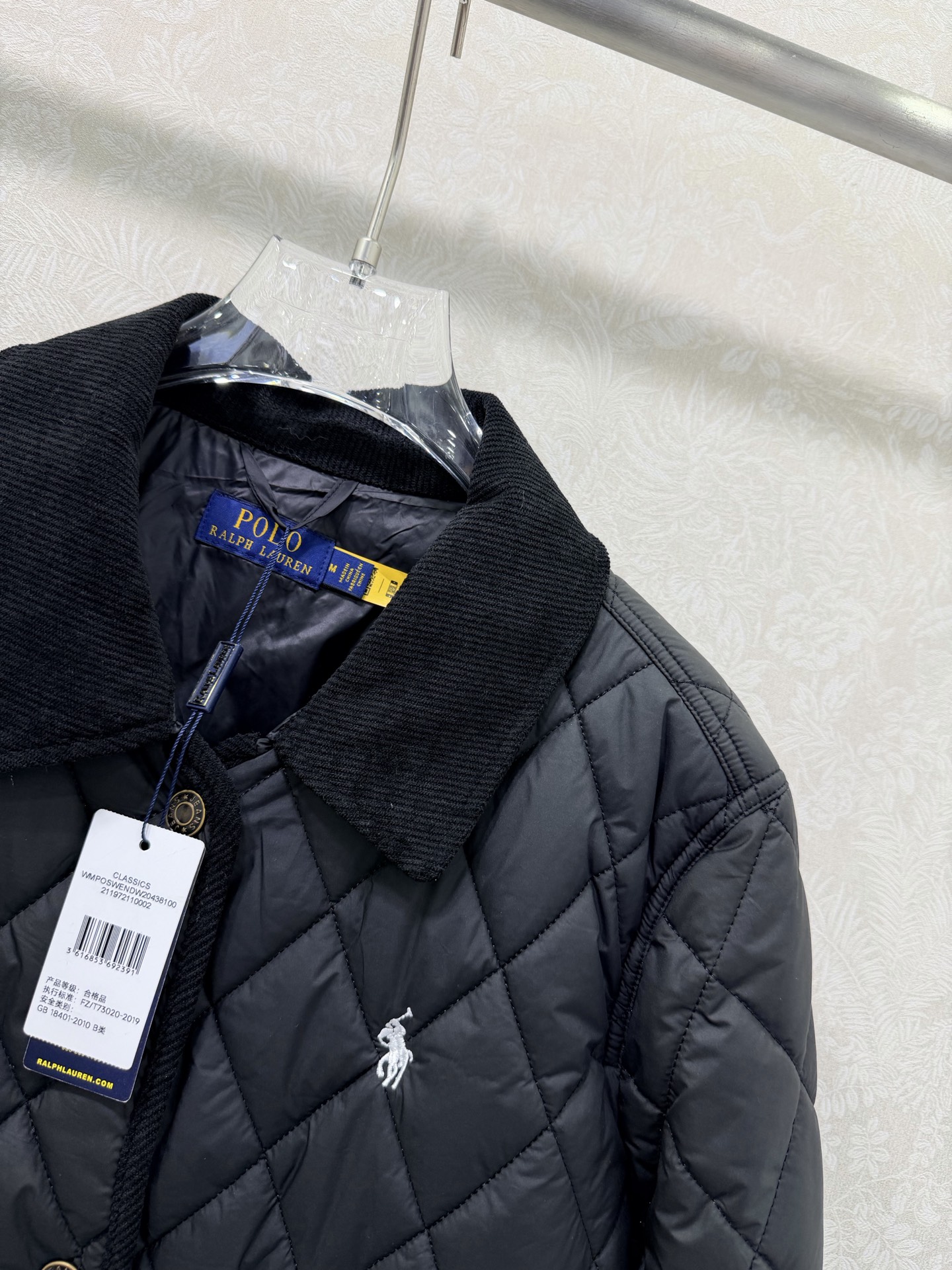 Details: New Diamond-Patterned Mid-Length Cotton Jacket, Luxurious Corduroy Collar and Cuffs, Horse Embroidery, Single-Breasted, Custom Hardware, Classic Checkered Pattern, Recycled Polyester Pockets, High-End Custom, Fine Craftsmanship