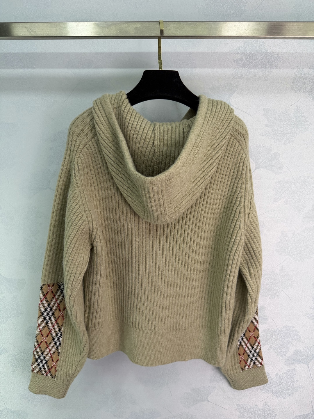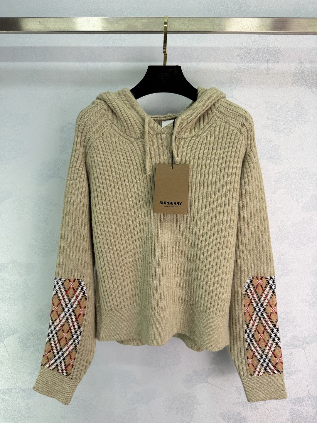 Details: Early spring new beige knit sweater, with vertical stripes and classic plaid sleeves, in British style, made of high-quality wool, with a hoodie design, perfect for casual or office wear.
