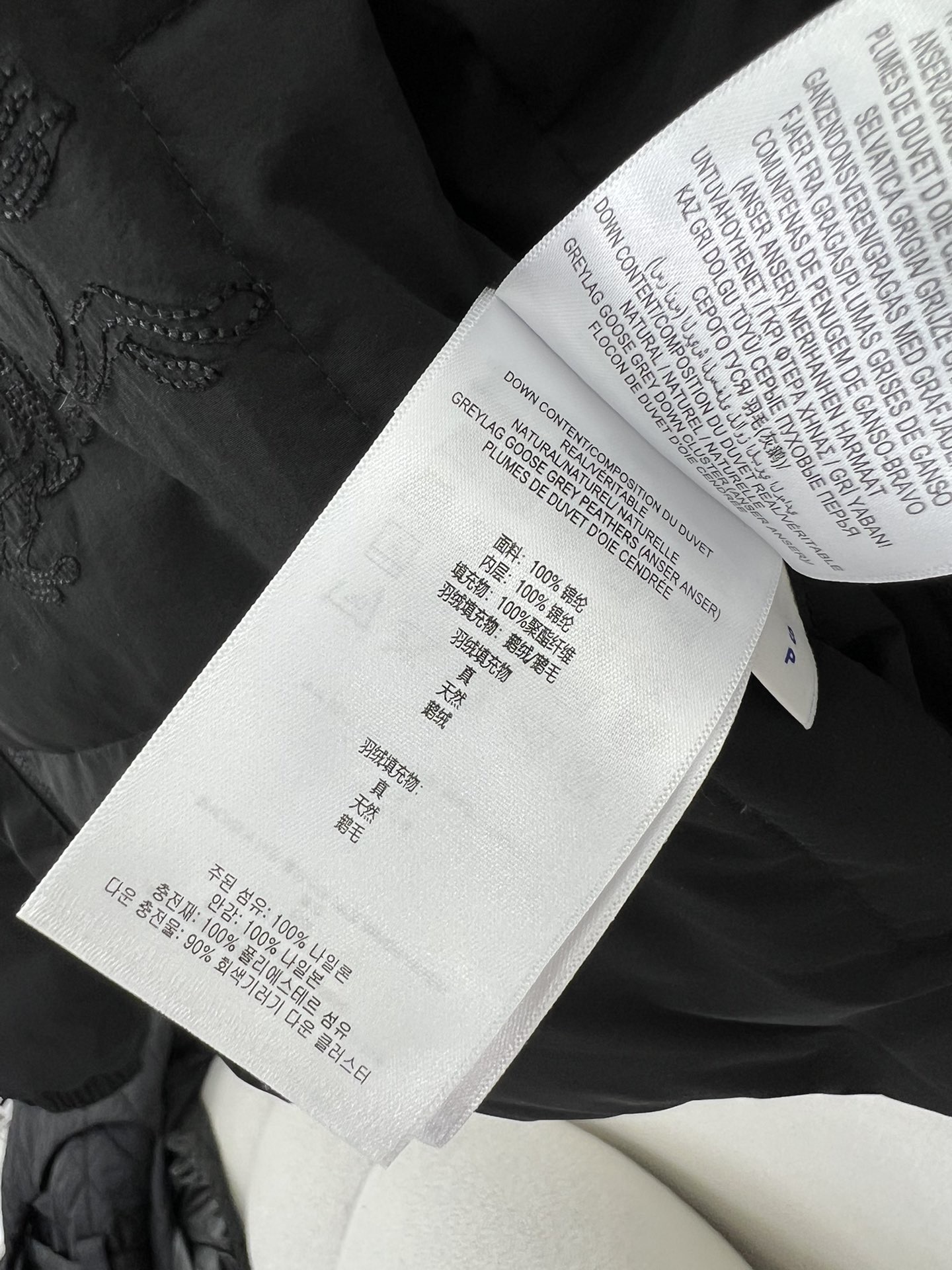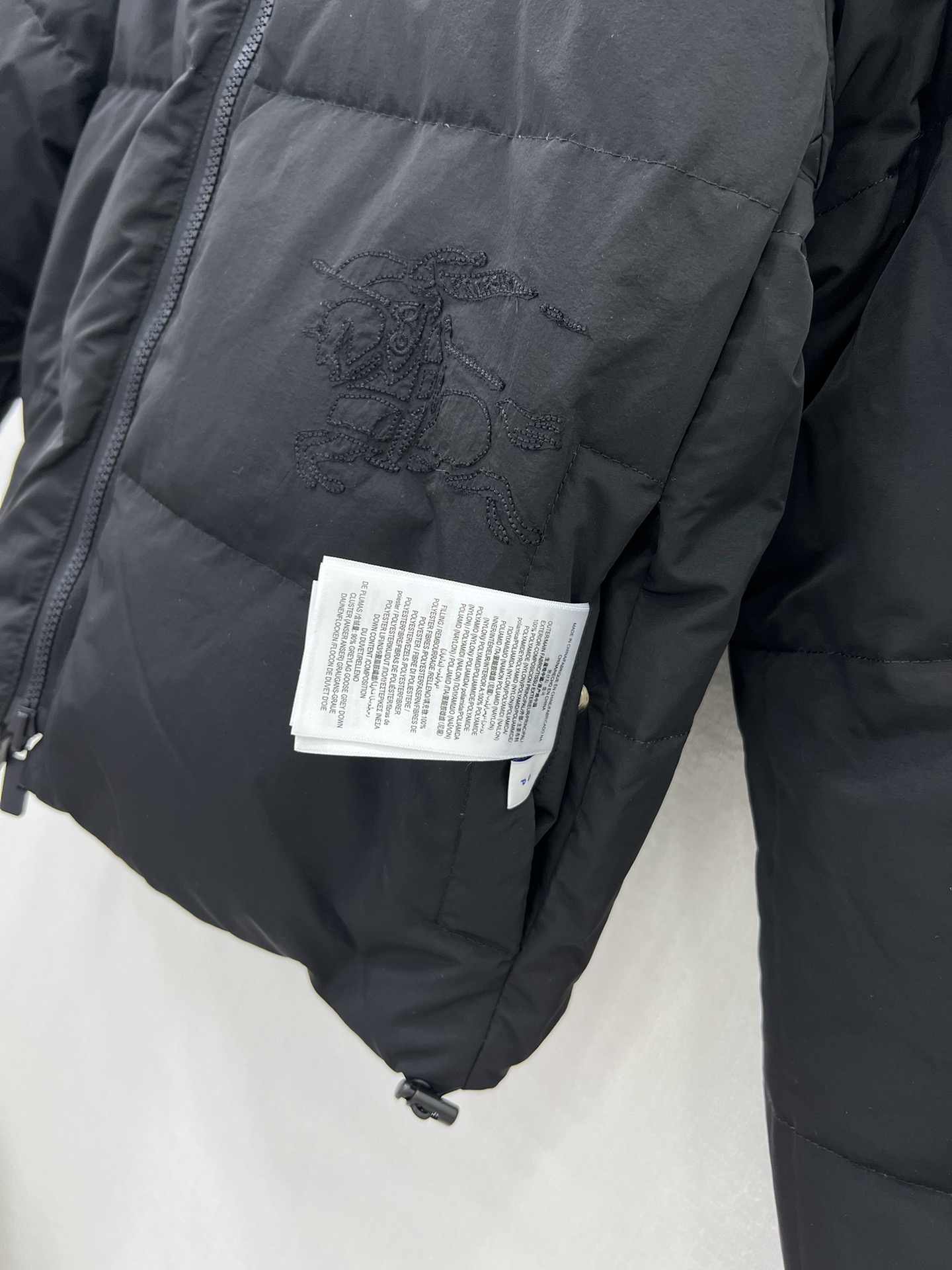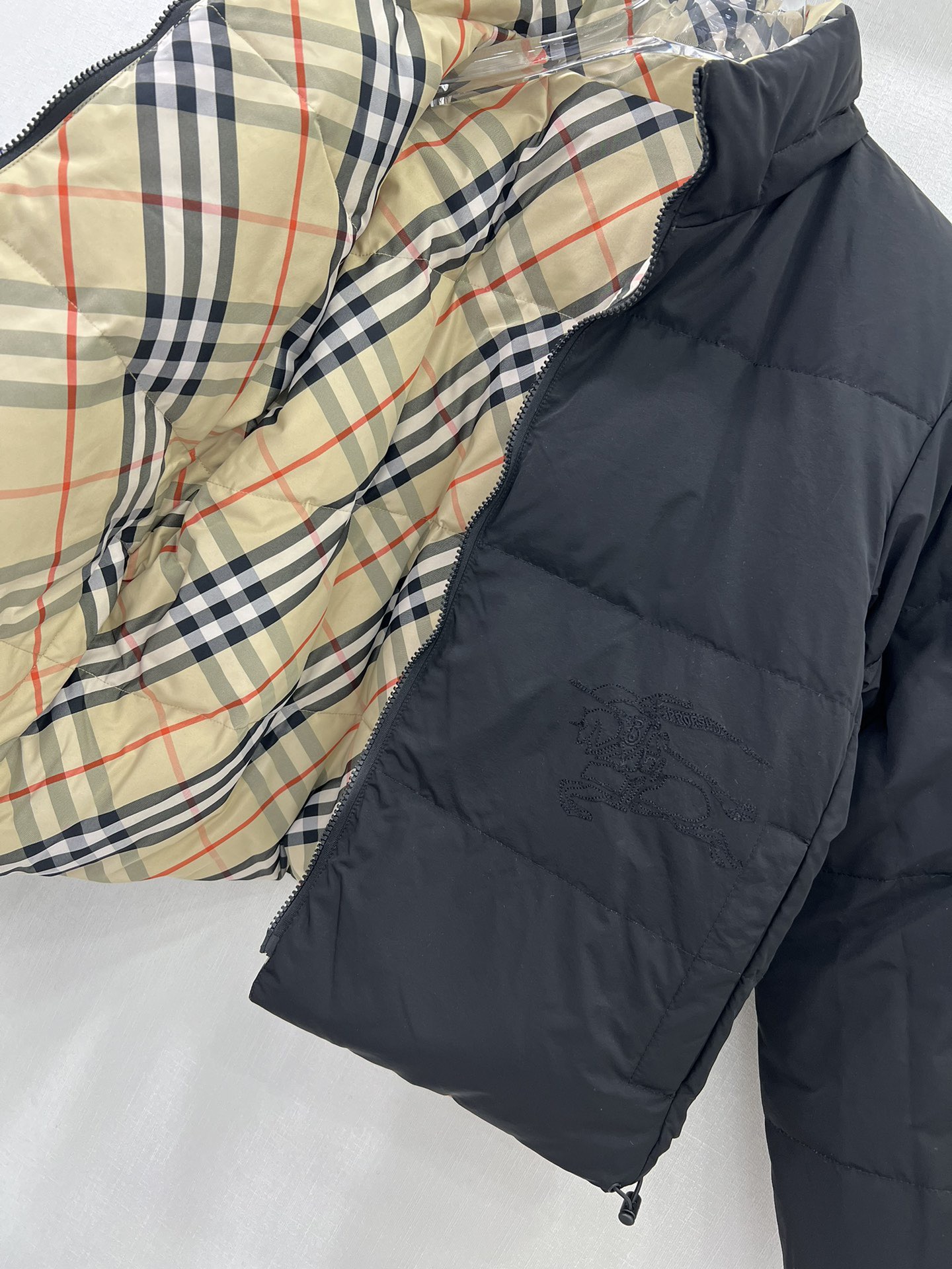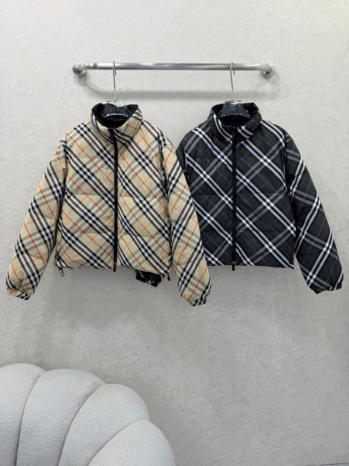 Details: Women s reversible short down jacket, vintage check on one side, logo embroidery on the other. High - end customization, fine workmanship