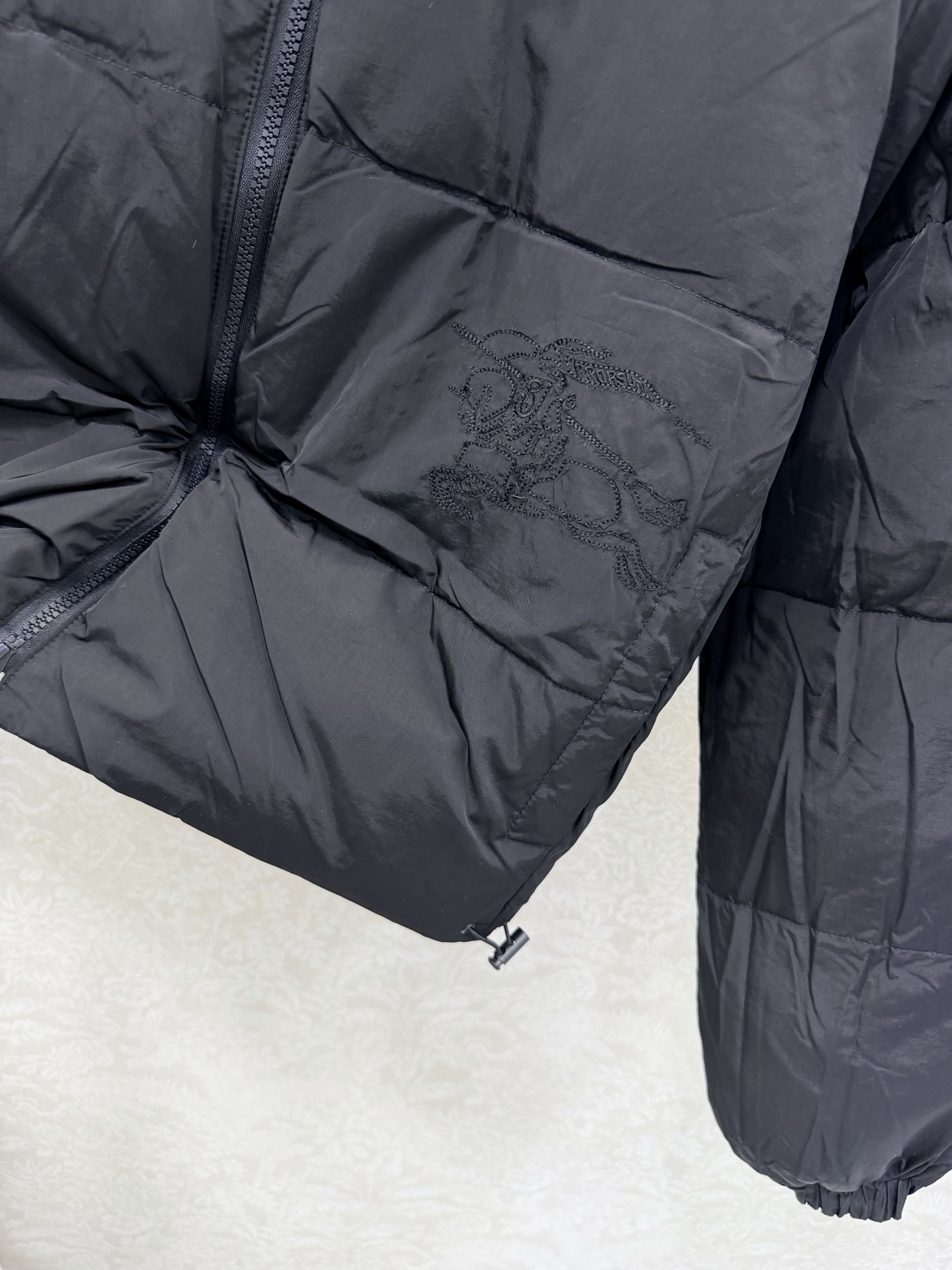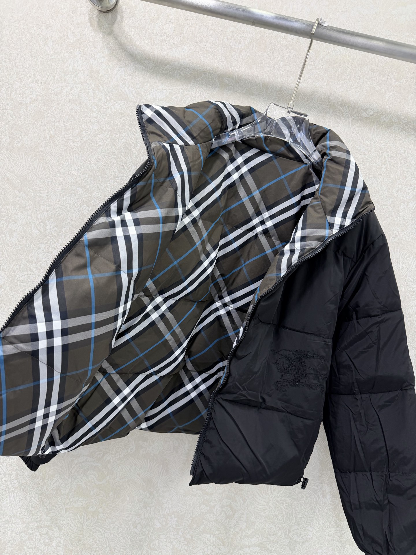 Details: Women s reversible short down jacket, vintage check on one side, logo embroidery on the other. High - end customization, fine workmanship