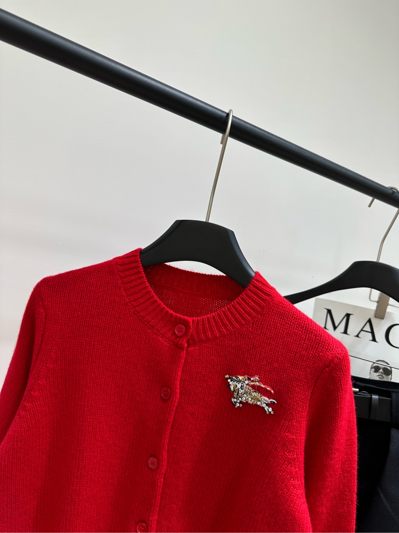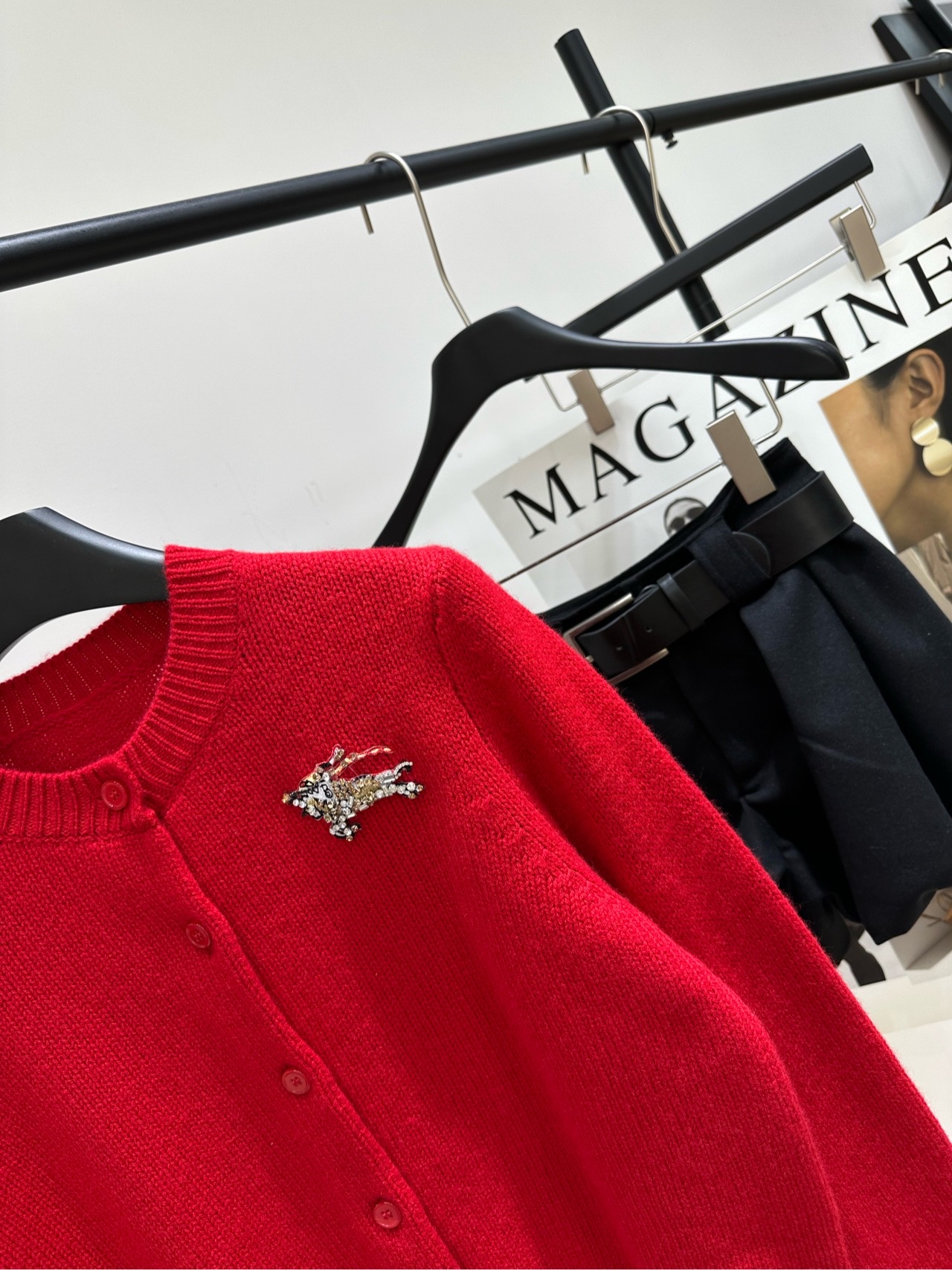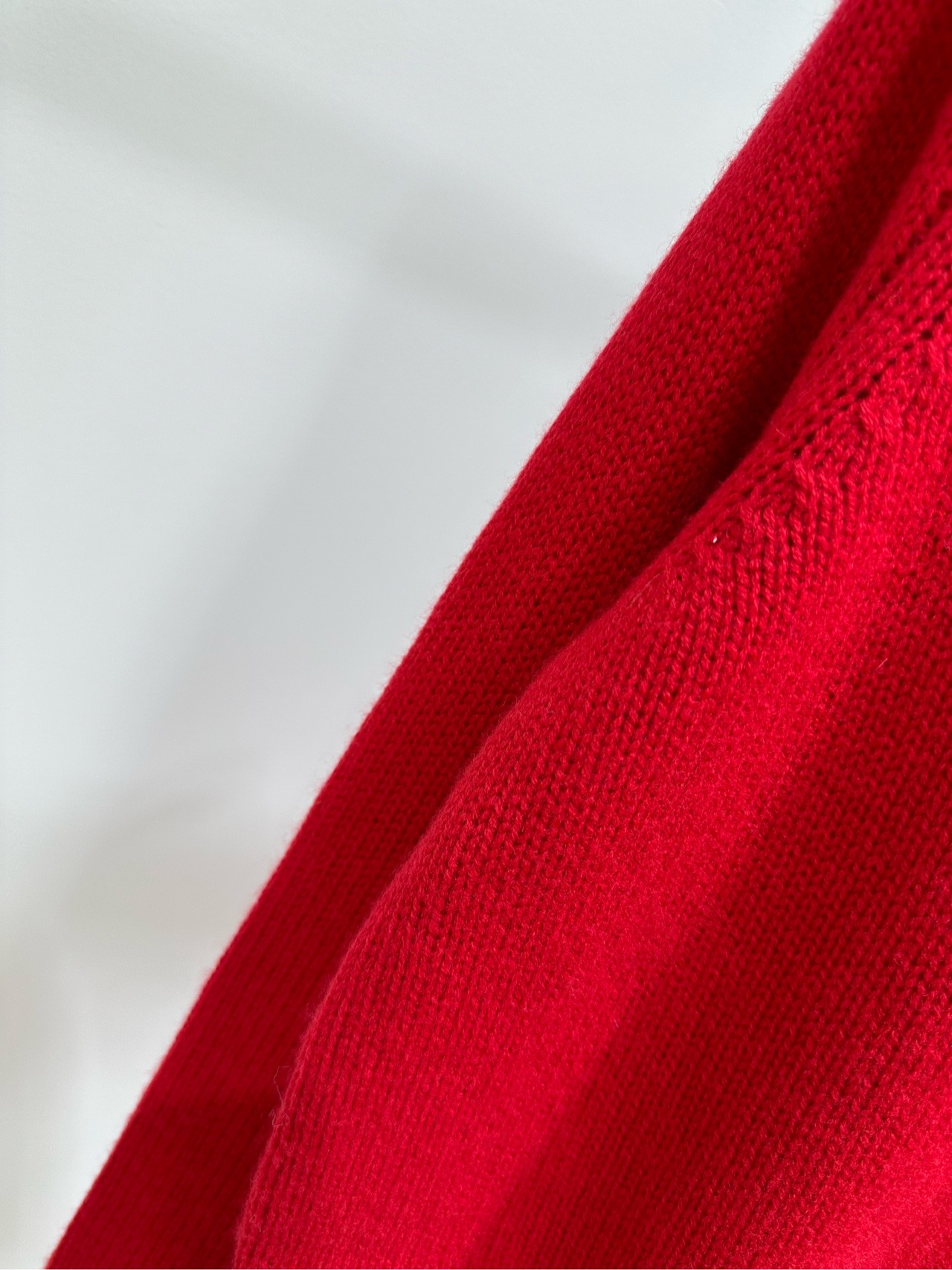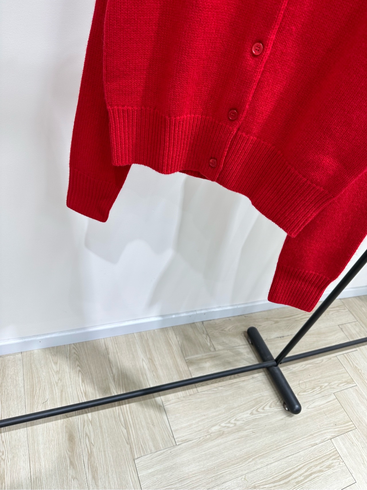 Details: Red wool - cashmere blend open cardigan with horse logo, suitable for festivals
