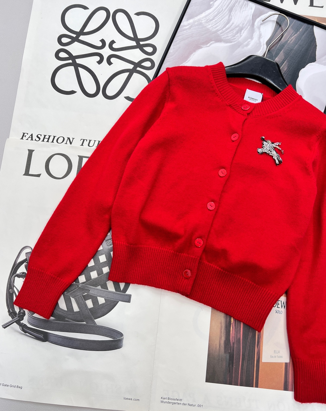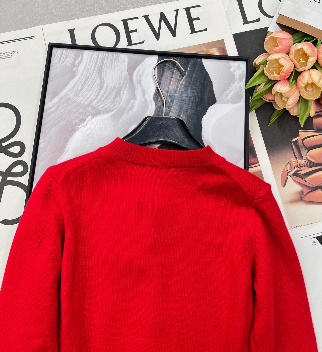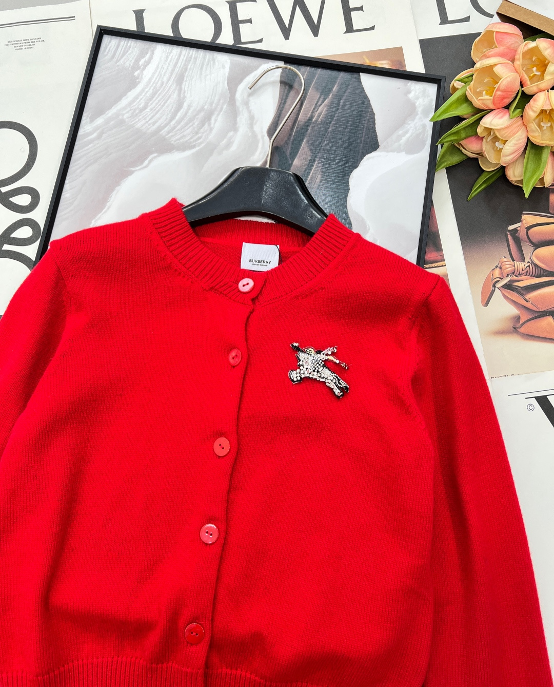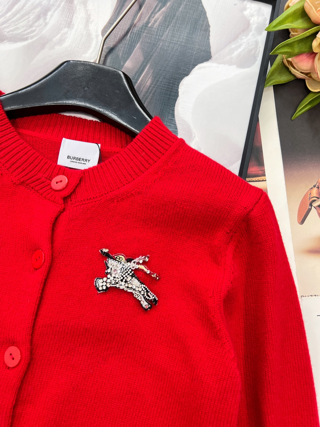 Details: Red knit cardigan with beaded horse emblem, classic and versatile, exquisite craftsmanship, luxurious feel.
