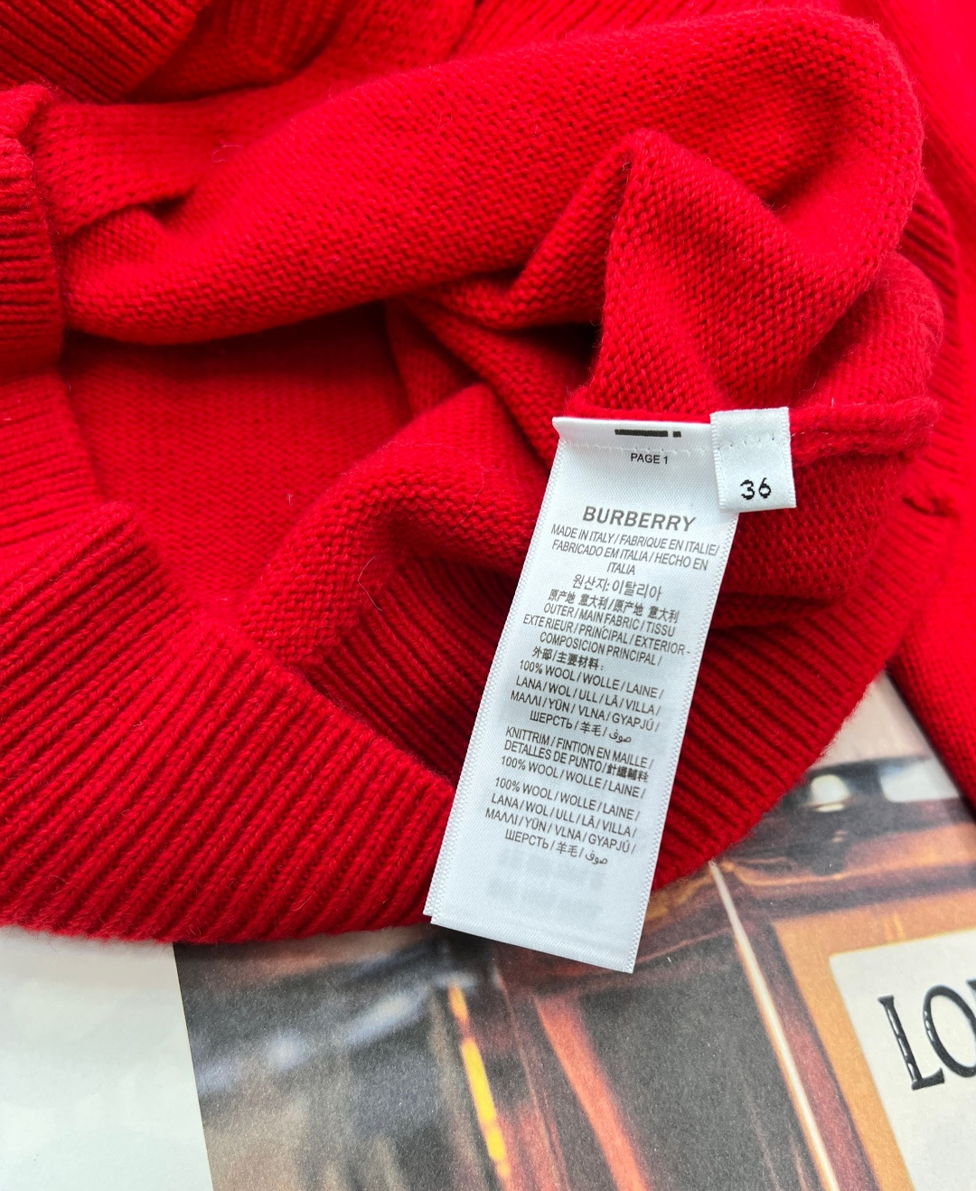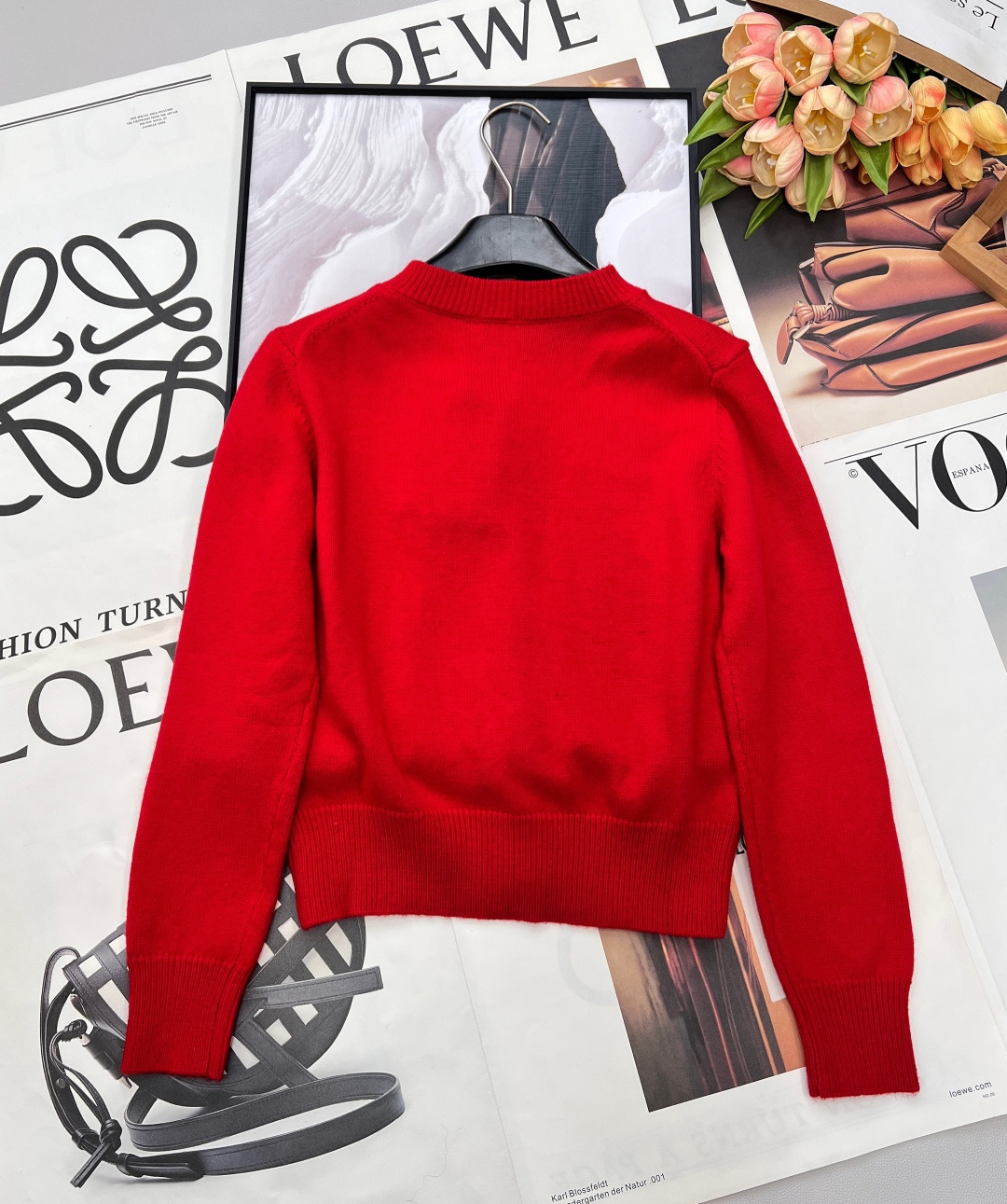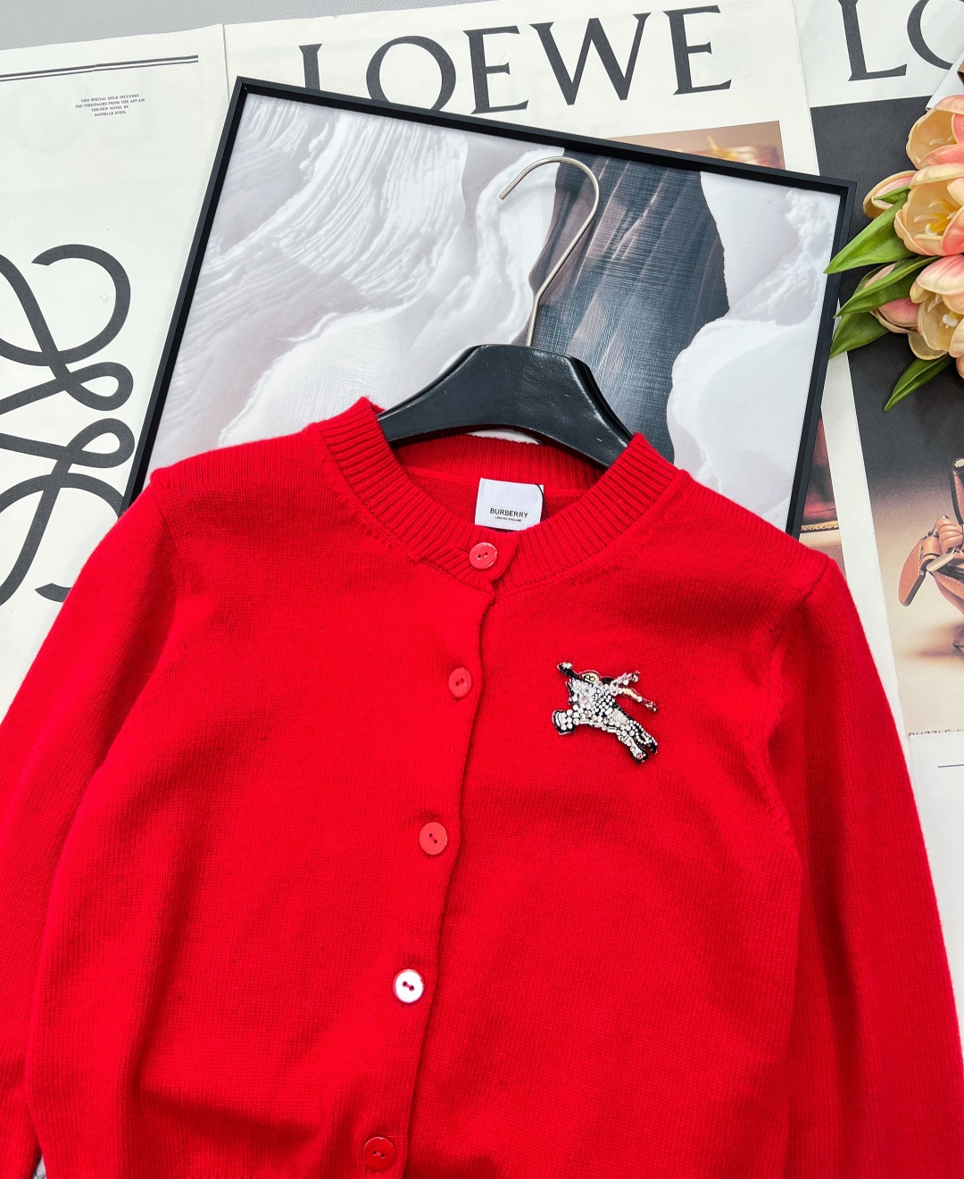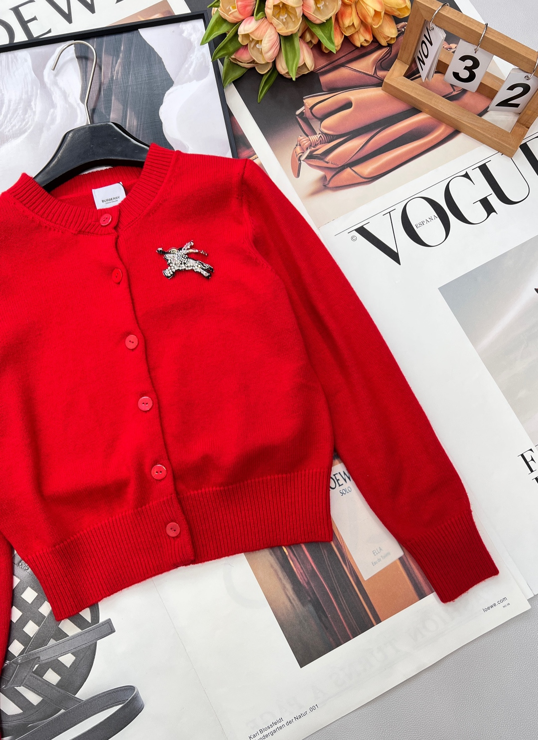 Details: Red knit cardigan with beaded horse emblem, classic and versatile, exquisite craftsmanship, luxurious feel.