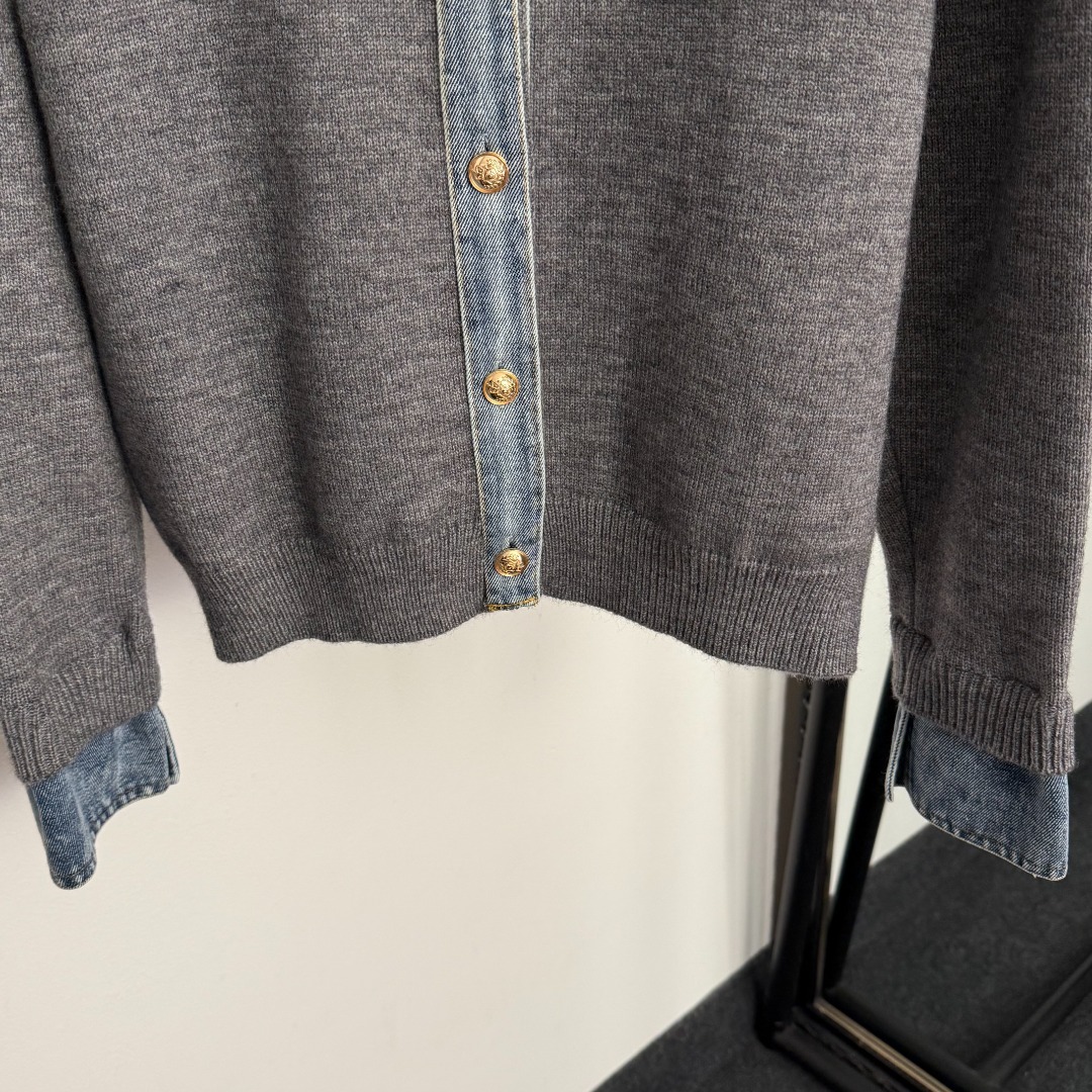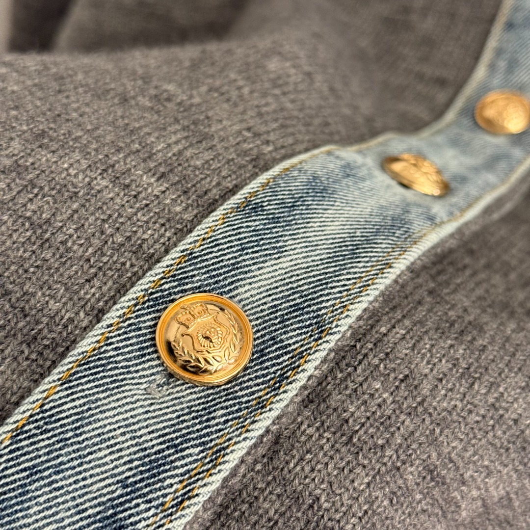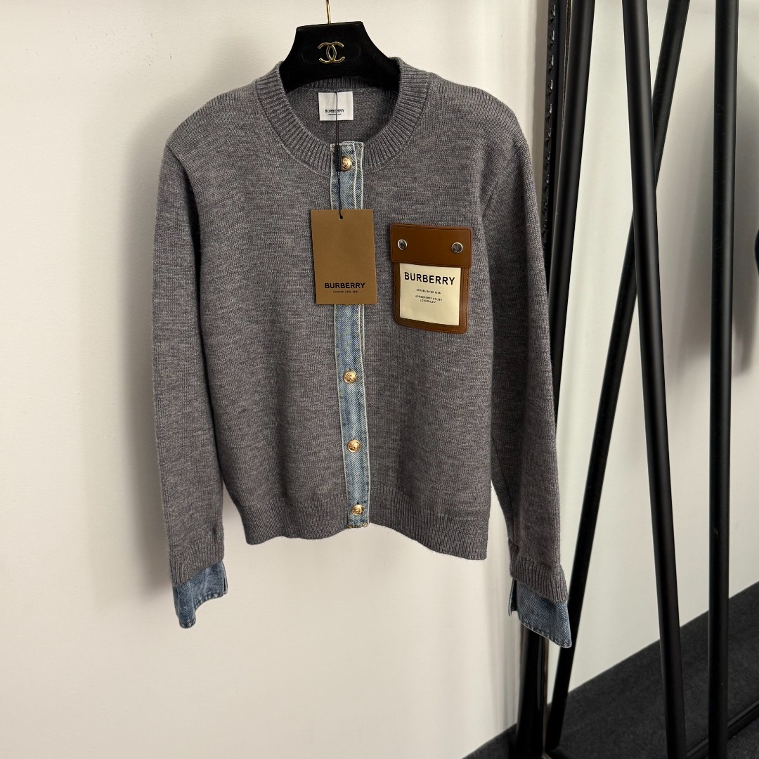 Details: New leather - patched single - pocket denim spliced long - sleeved knitted cardigan in gray, one size fits all.