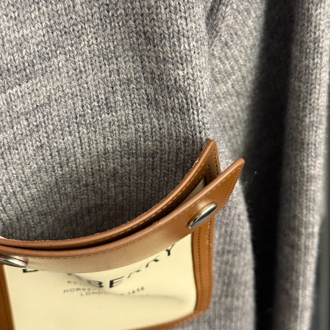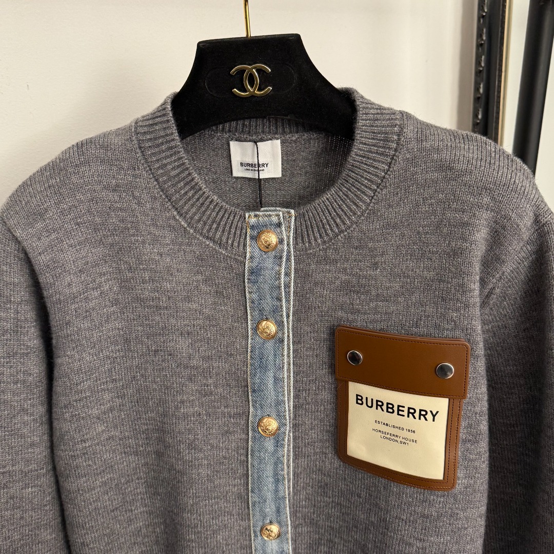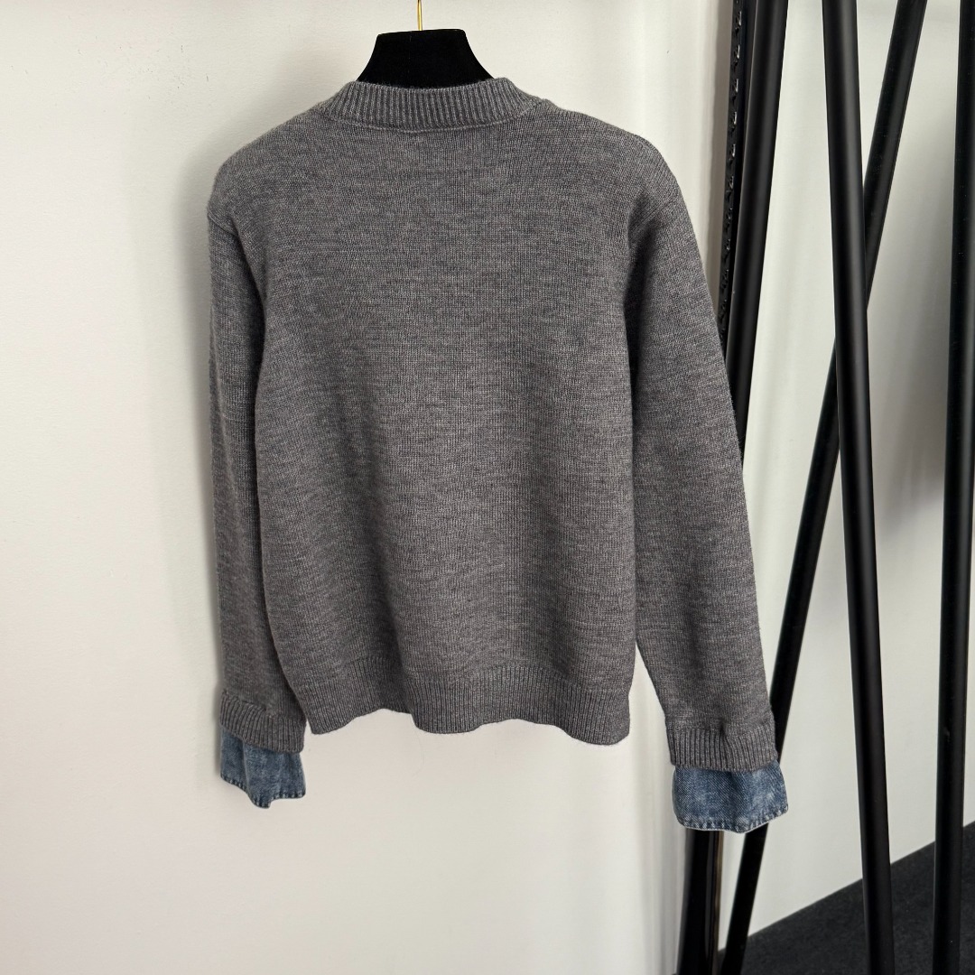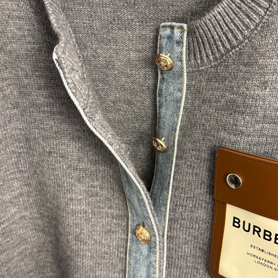 Details: New leather - patched single - pocket denim spliced long - sleeved knitted cardigan in gray, one size fits all.