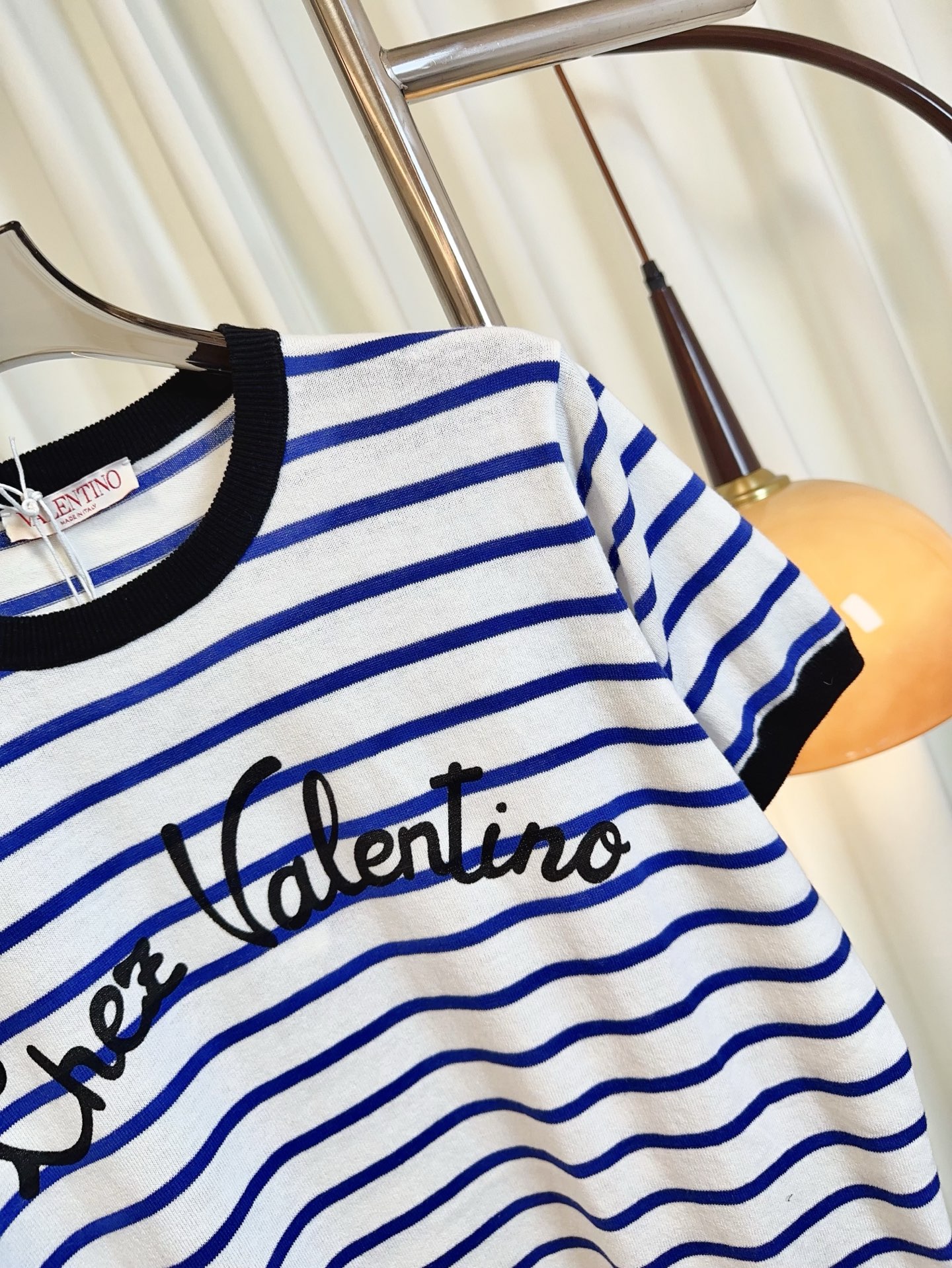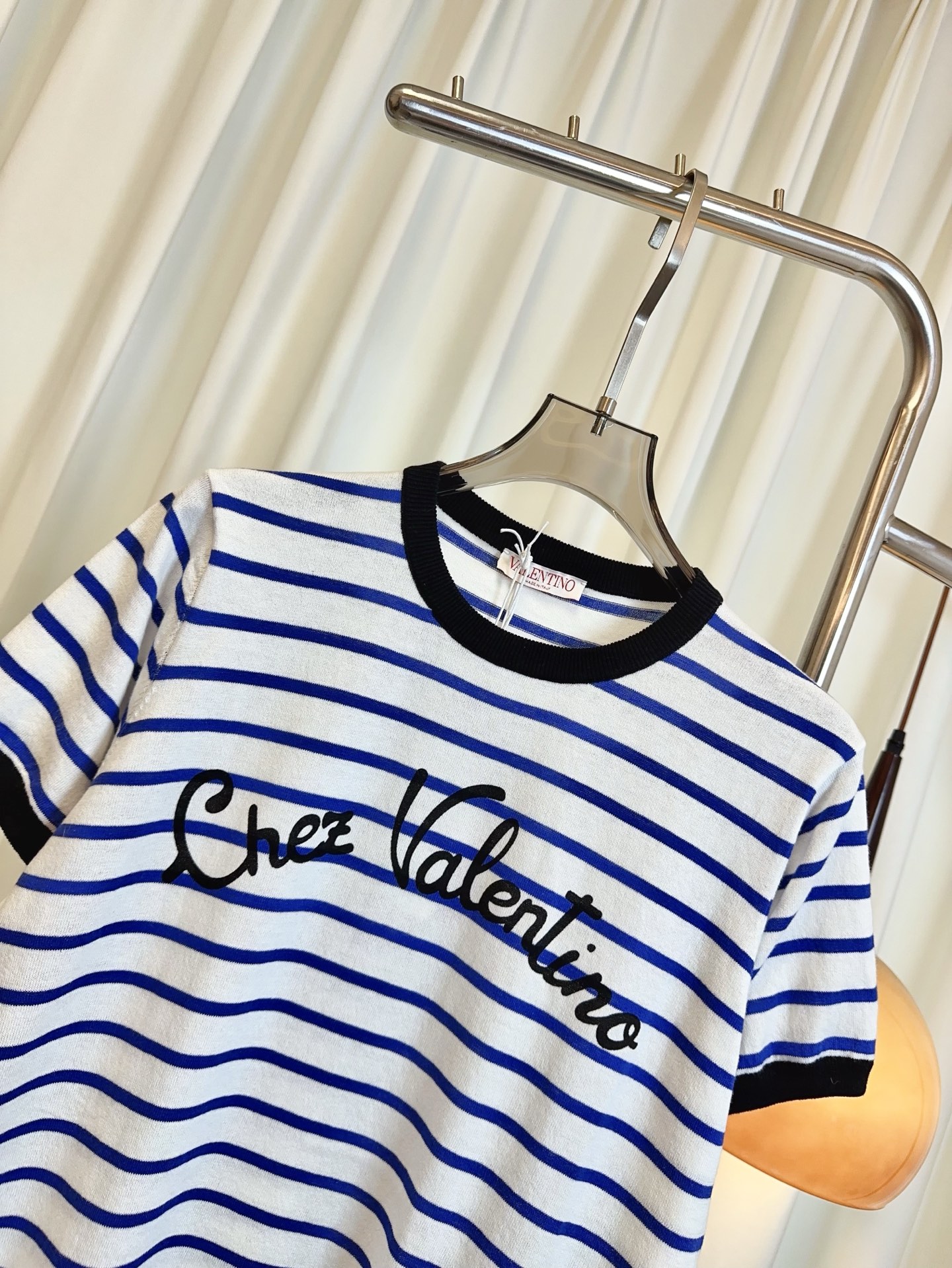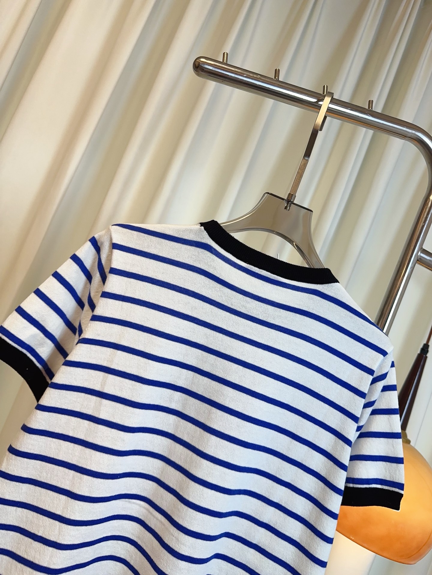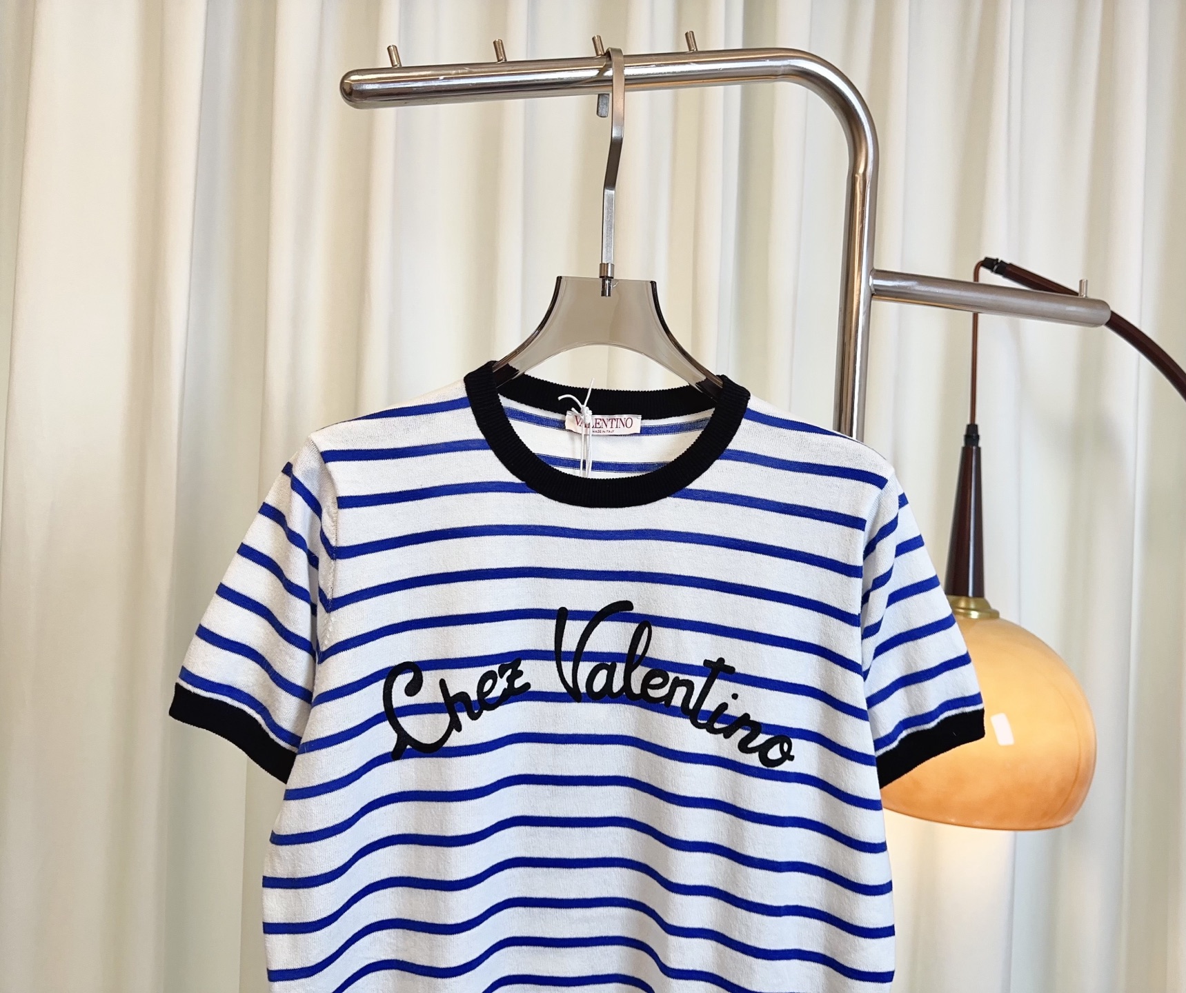 Details: Another version of the striped short-sleeve cotton blend top with a letter logo, maintaining delicacy and a youthful charm.