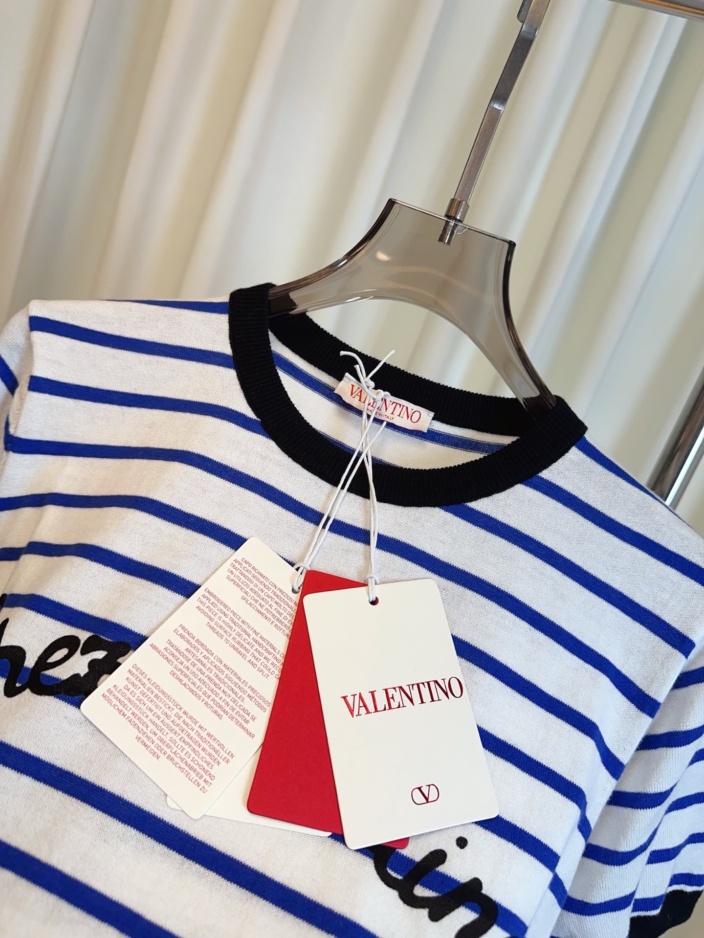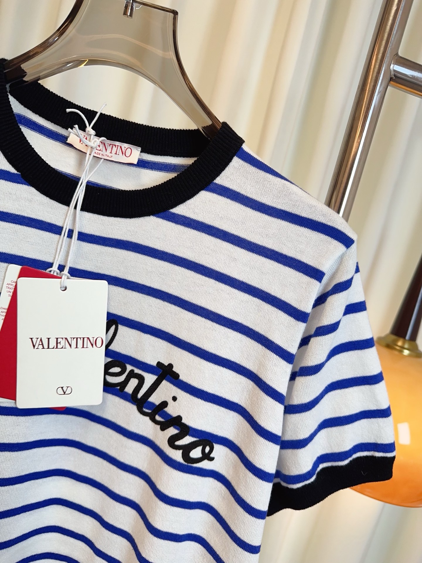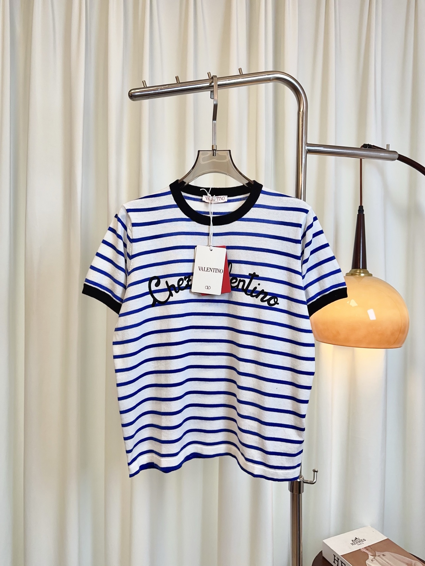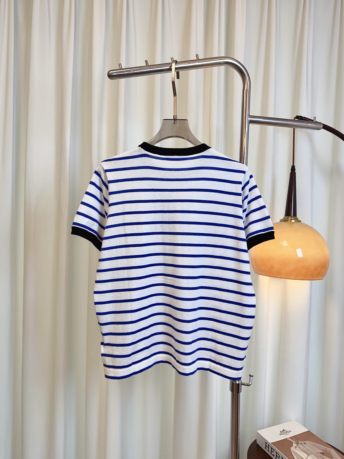 Details: Another version of the striped short-sleeve cotton blend top with a letter logo, maintaining delicacy and a youthful charm.