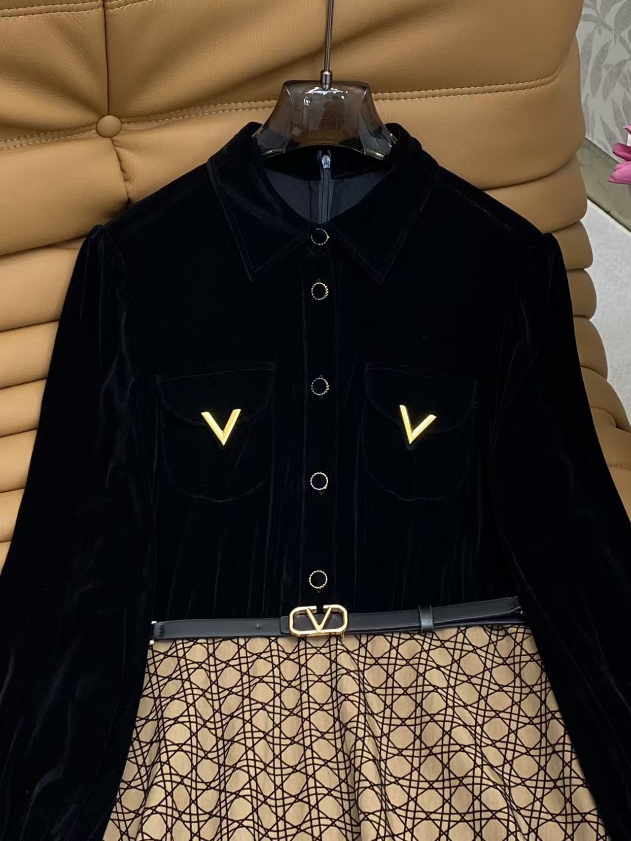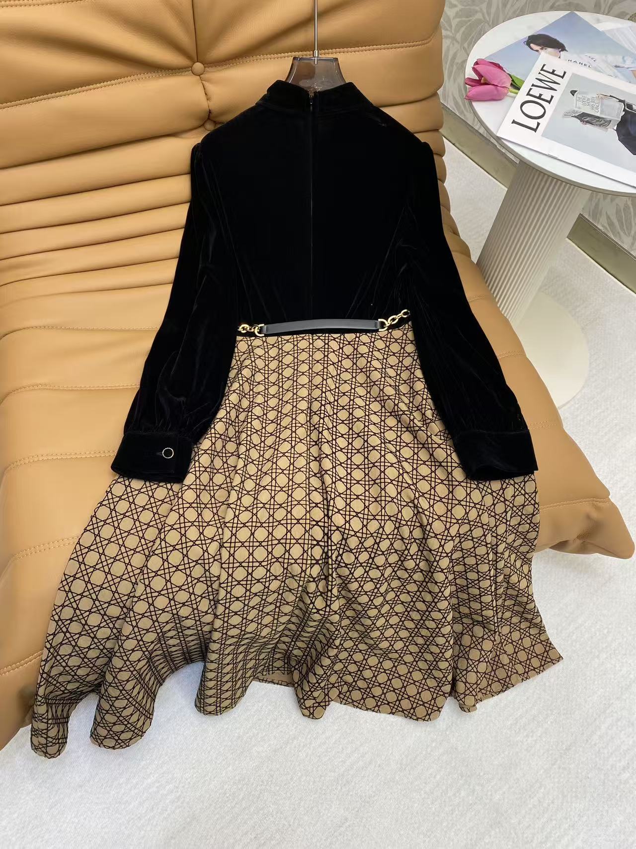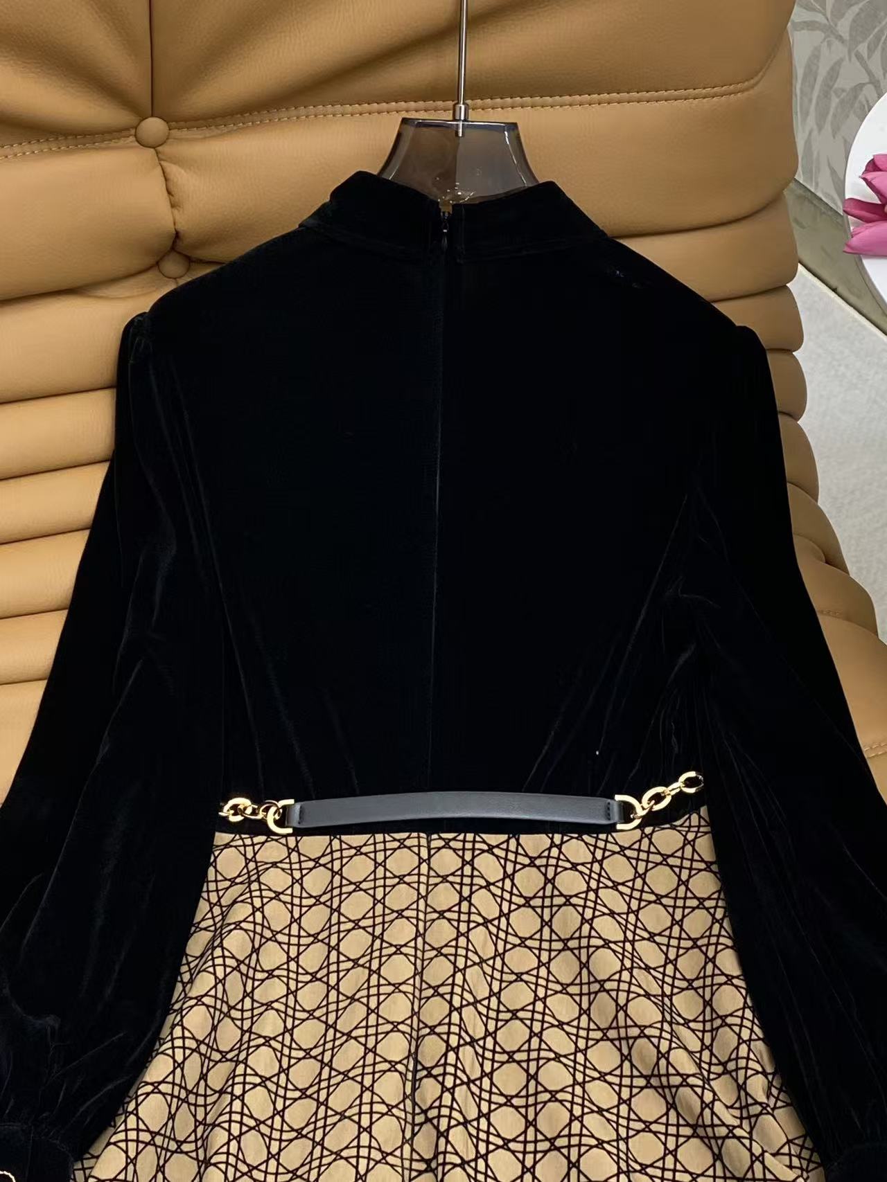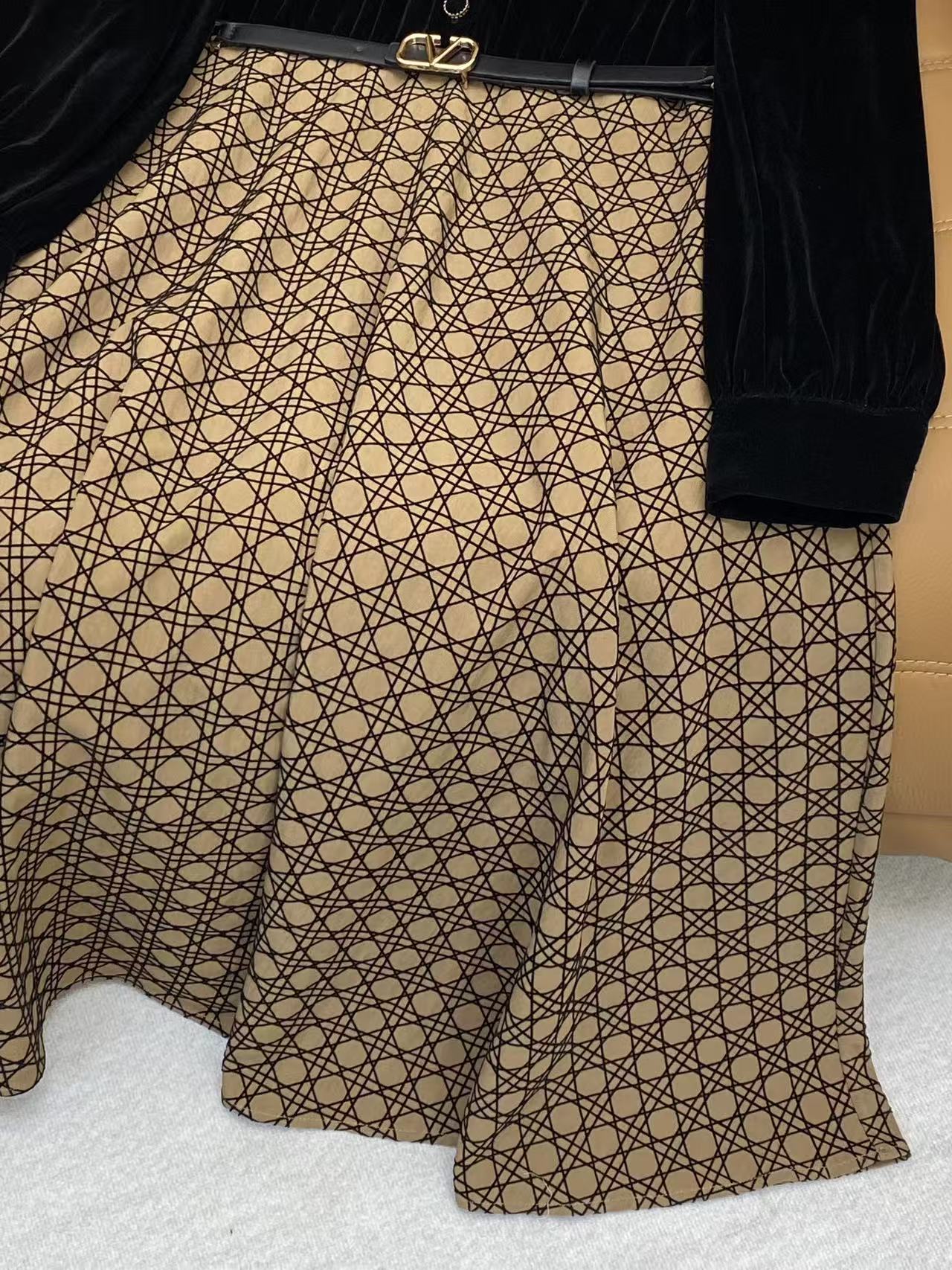 Details: Spring Velvet Dress with Geometric Print, Gold-black Tone, Metal V and Belt Buckle. High-end Customization, Fine Workmanship