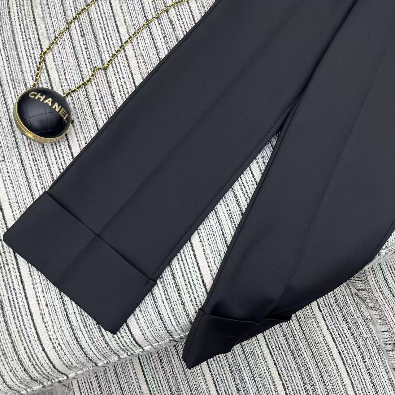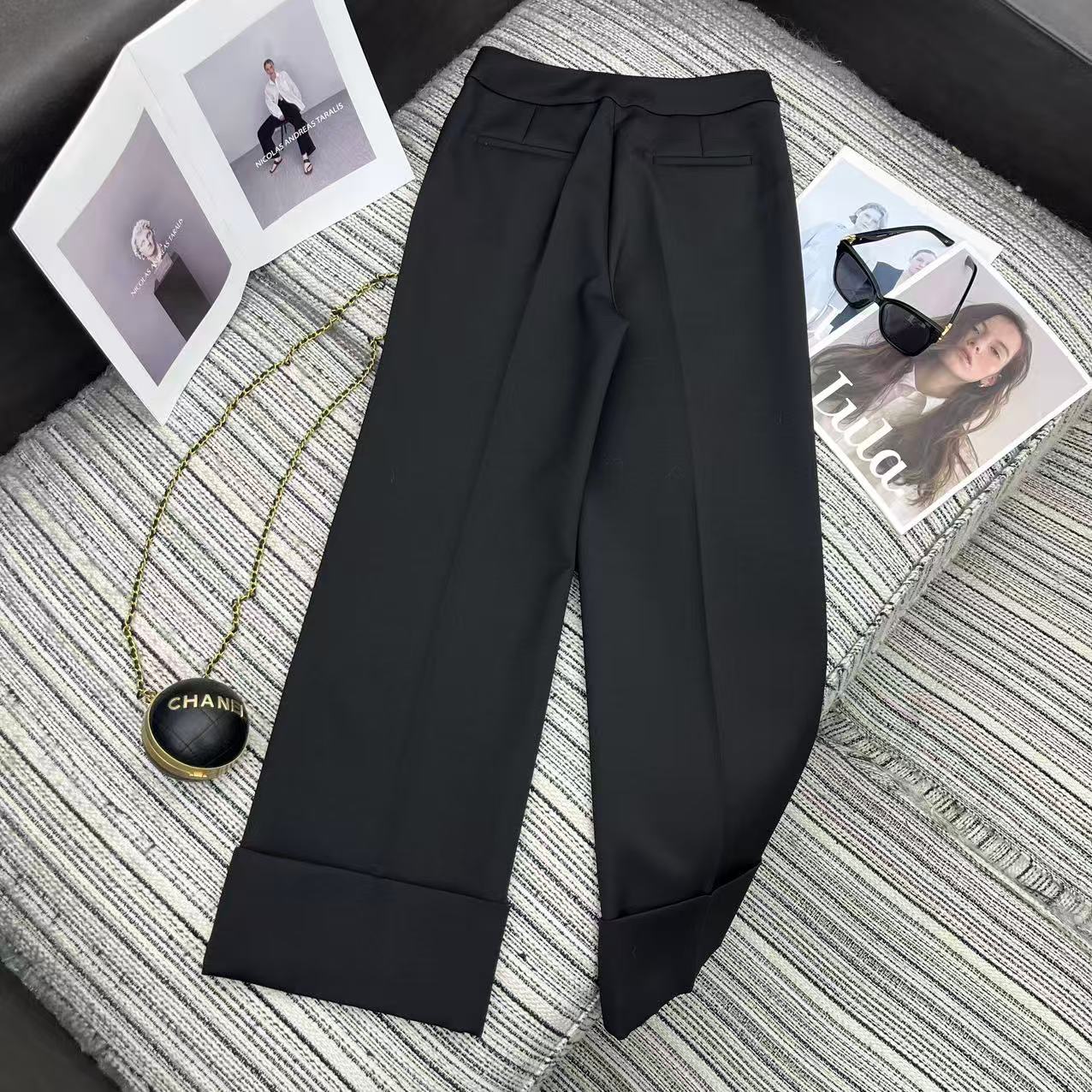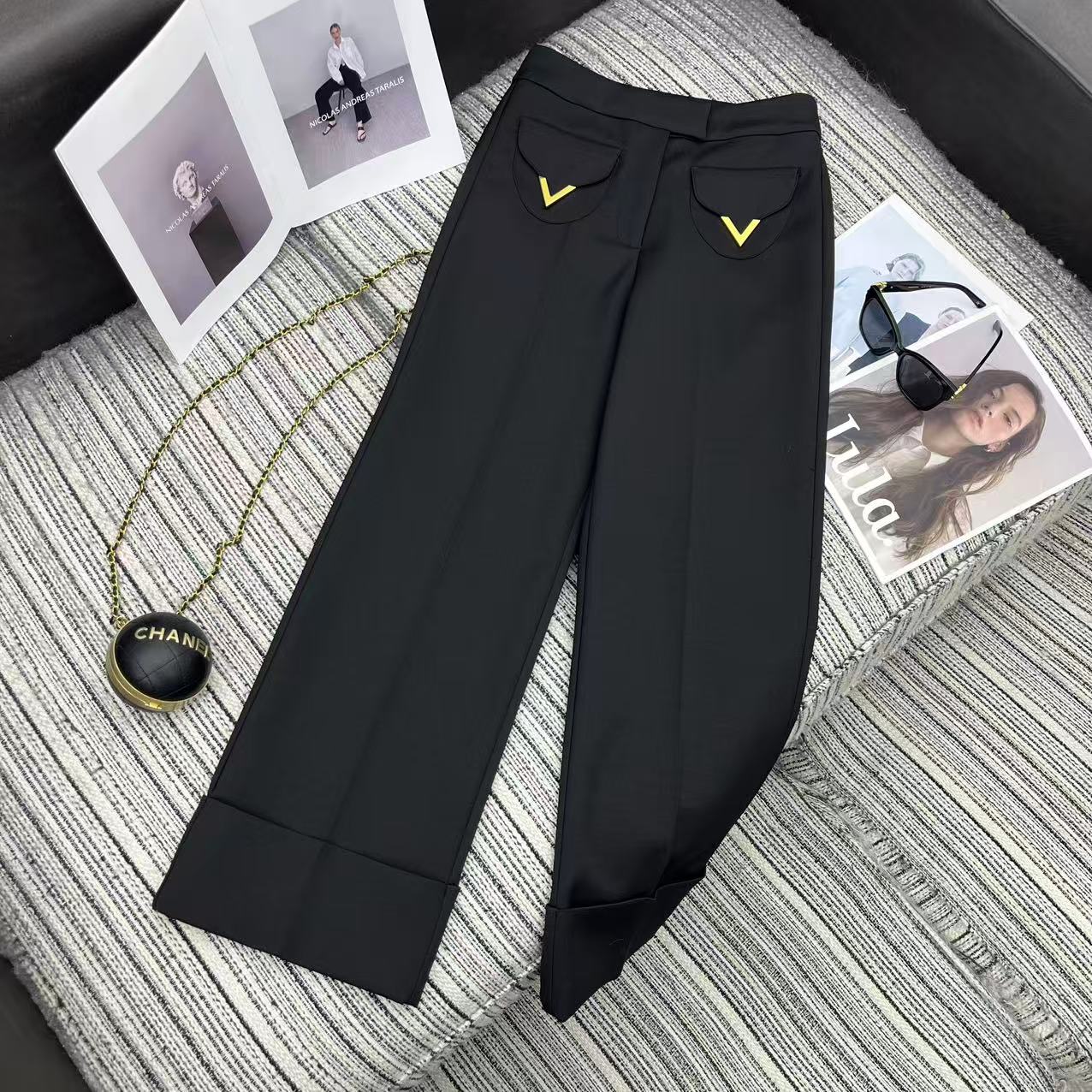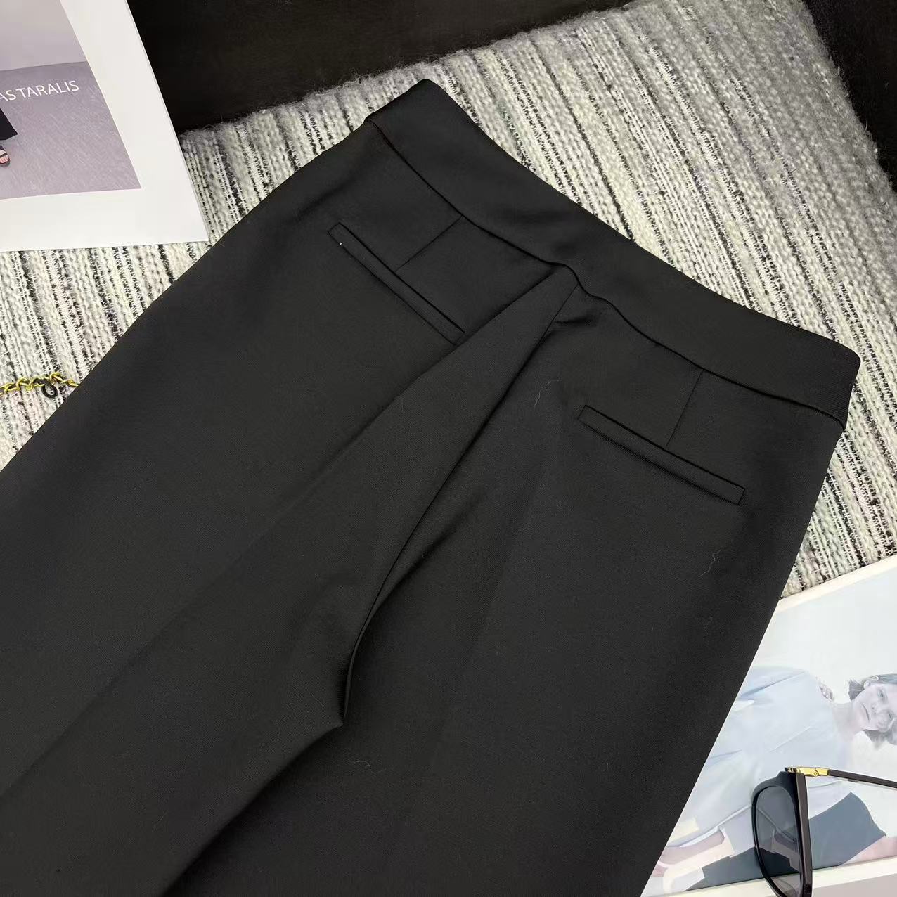 Details: Early spring series straight-leg suit pants, hem folded, metal V-button pockets, two colors available