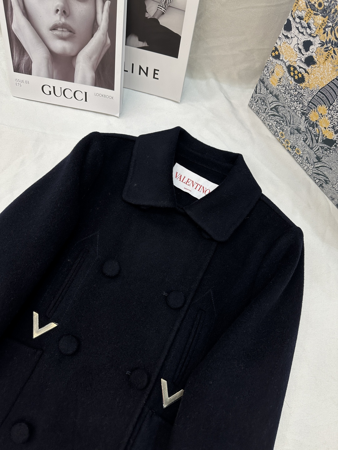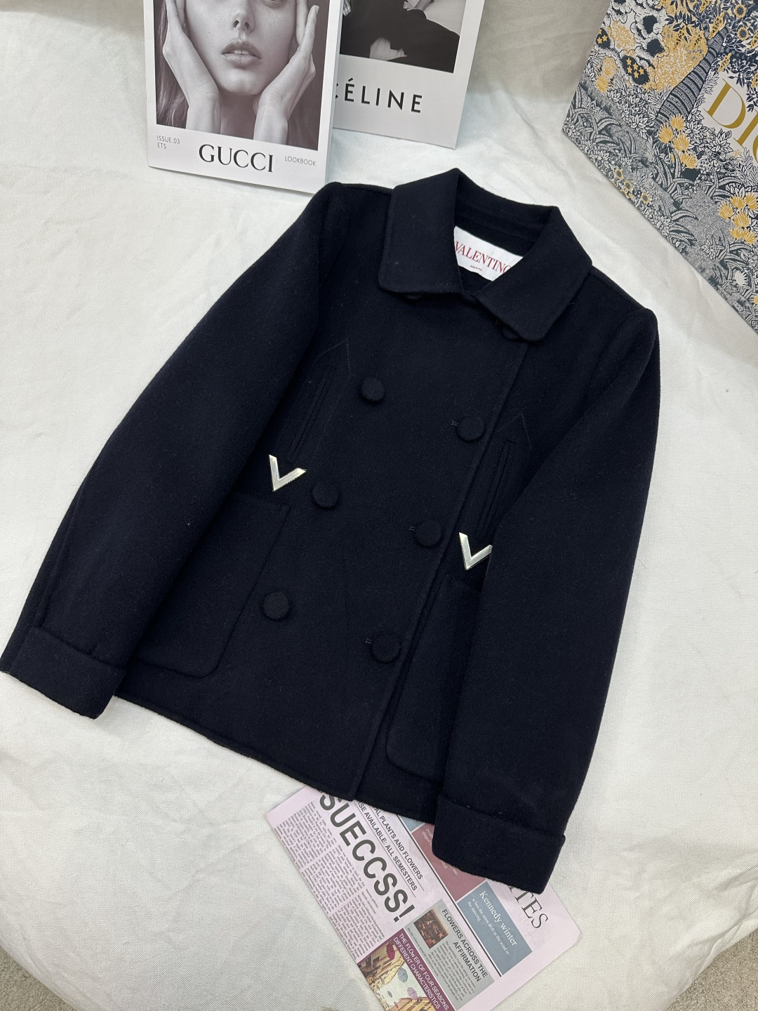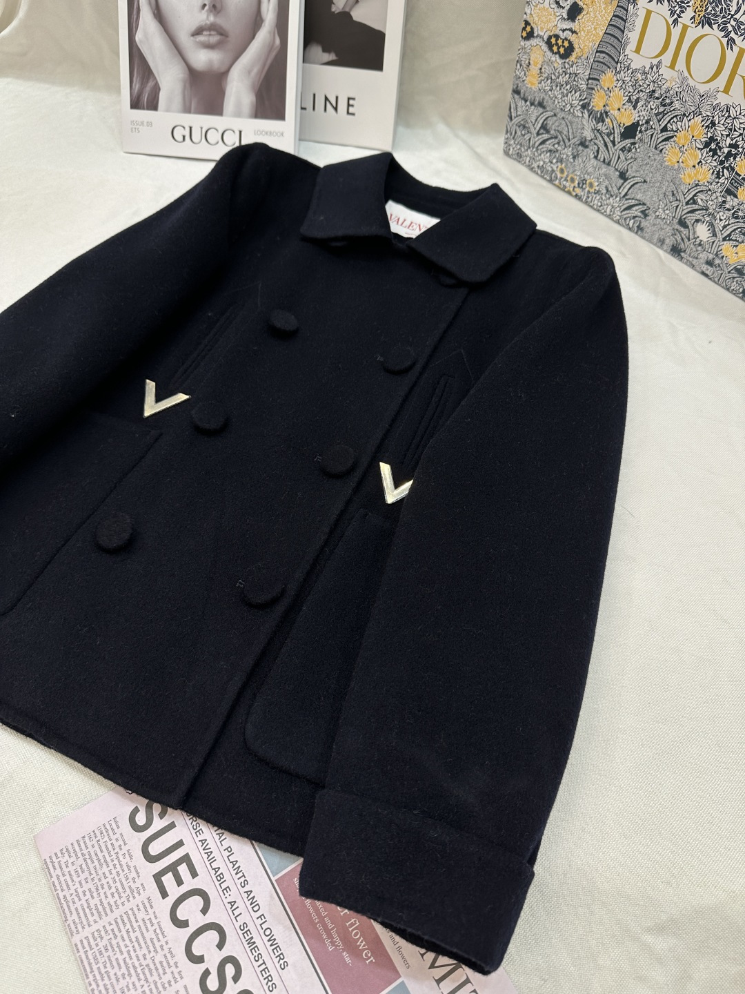 Details: Autumn and winter double-sided cashmere short coat with golden V buckle, 10% cashmere, 90% wool, sizes SML, colors black, white, camel.