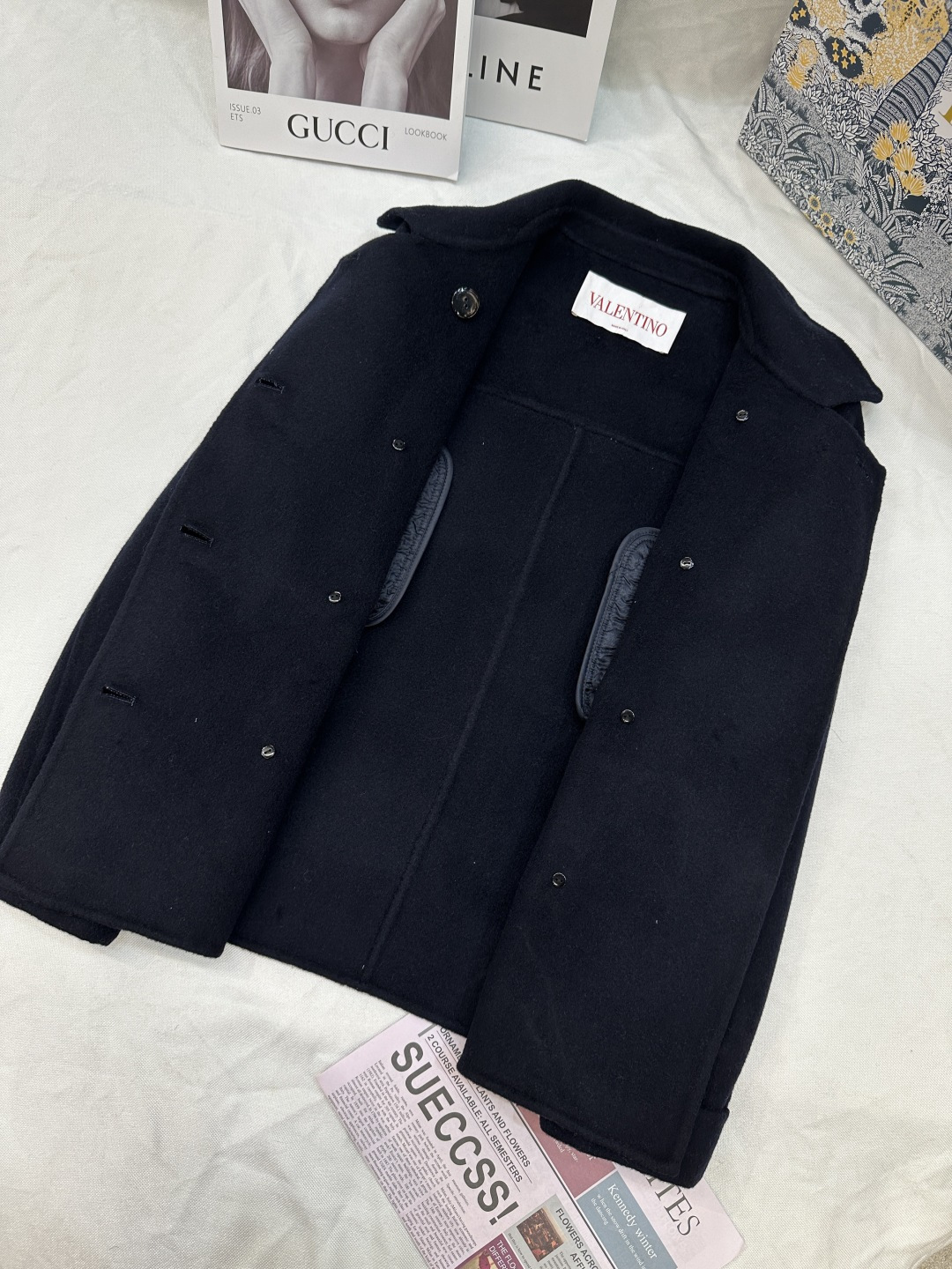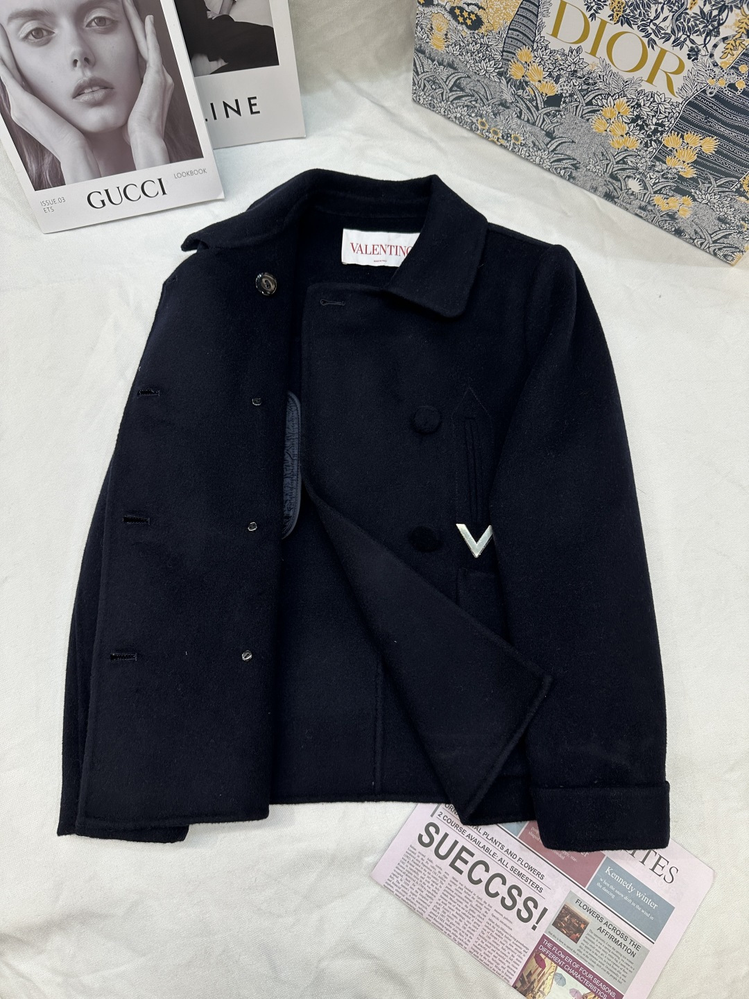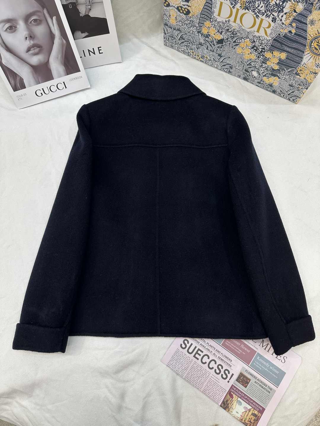 Details: Autumn and winter double-sided cashmere short coat with golden V buckle, 10% cashmere, 90% wool, sizes SML, colors black, white, camel.