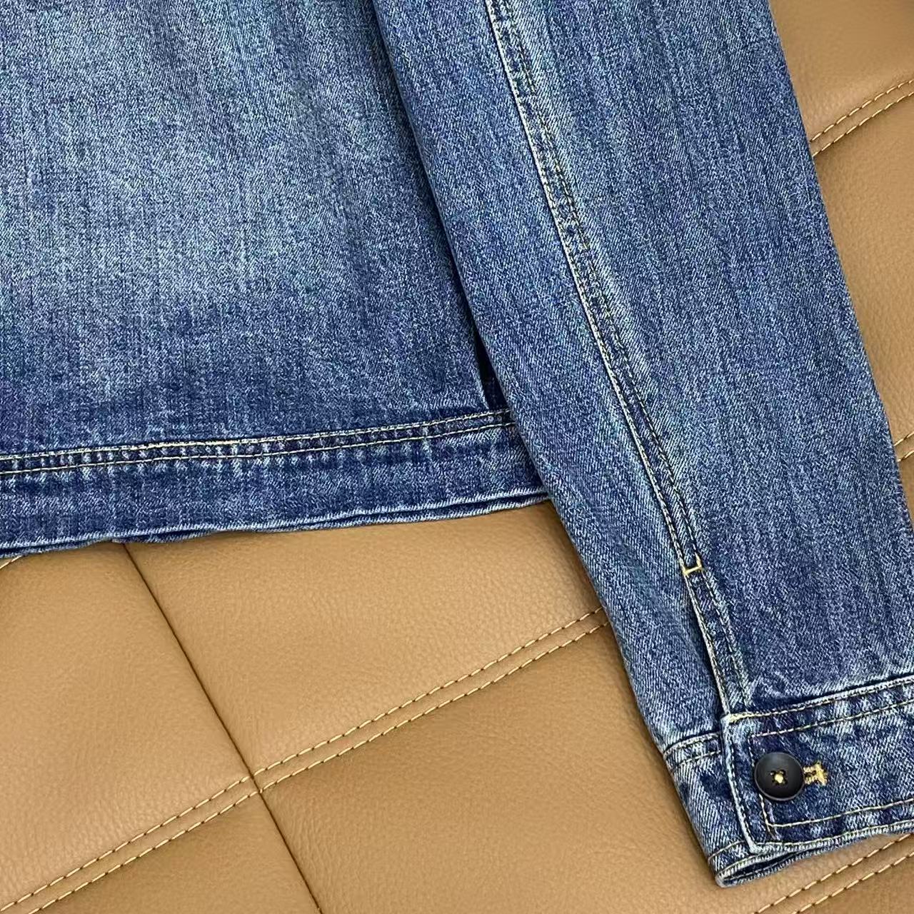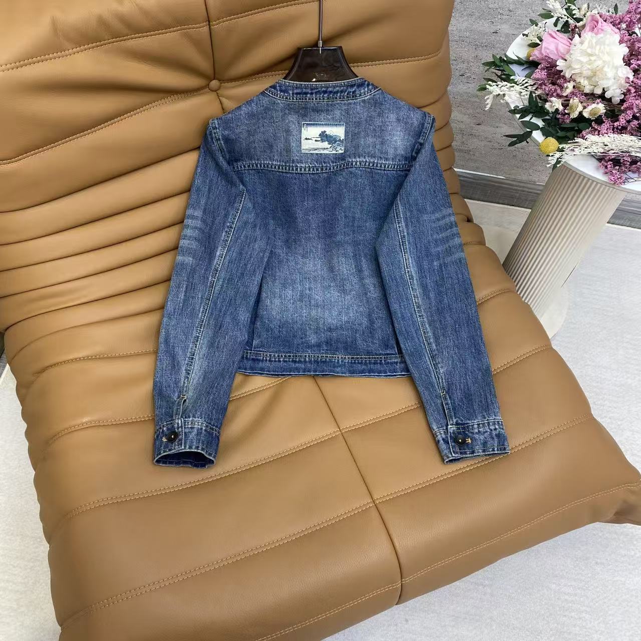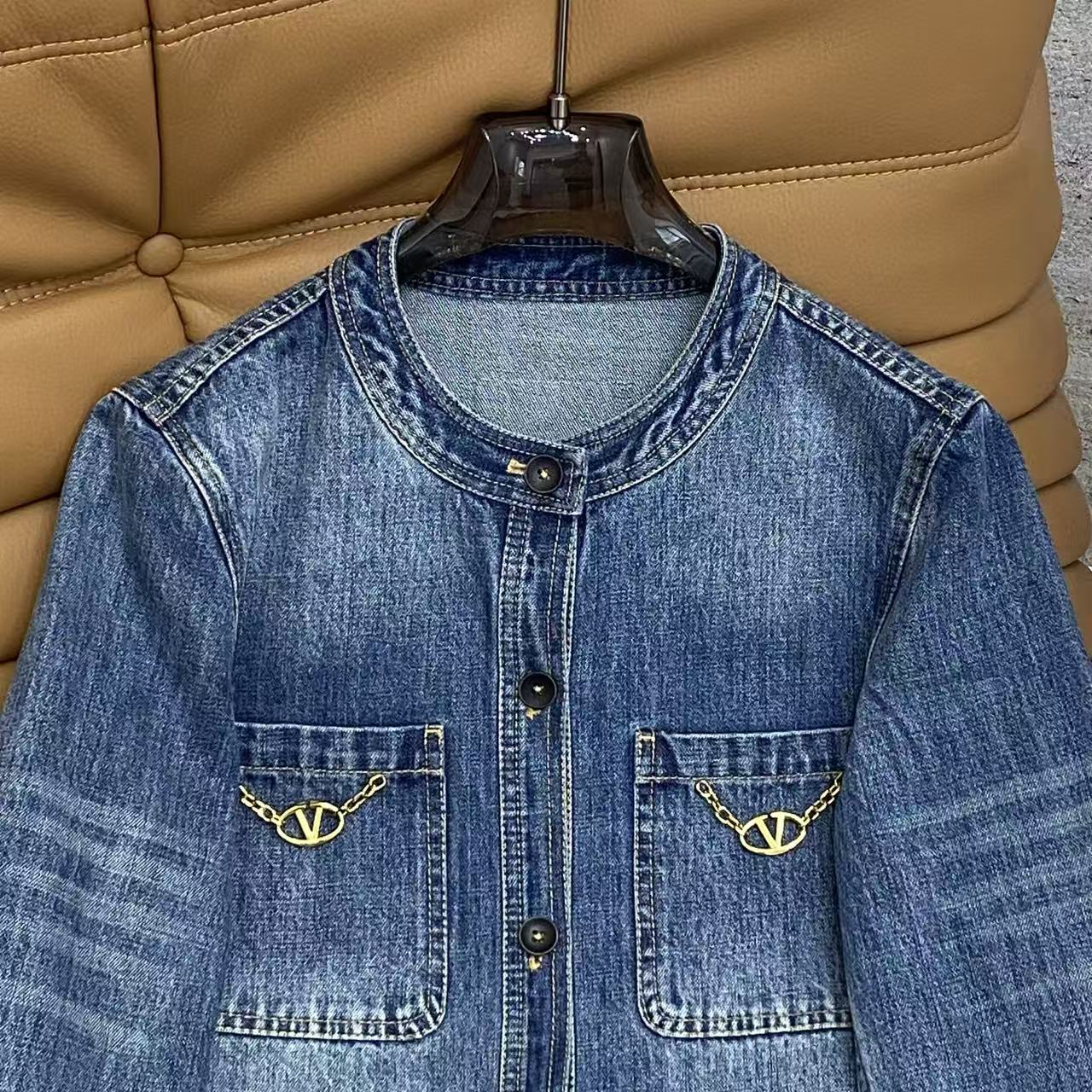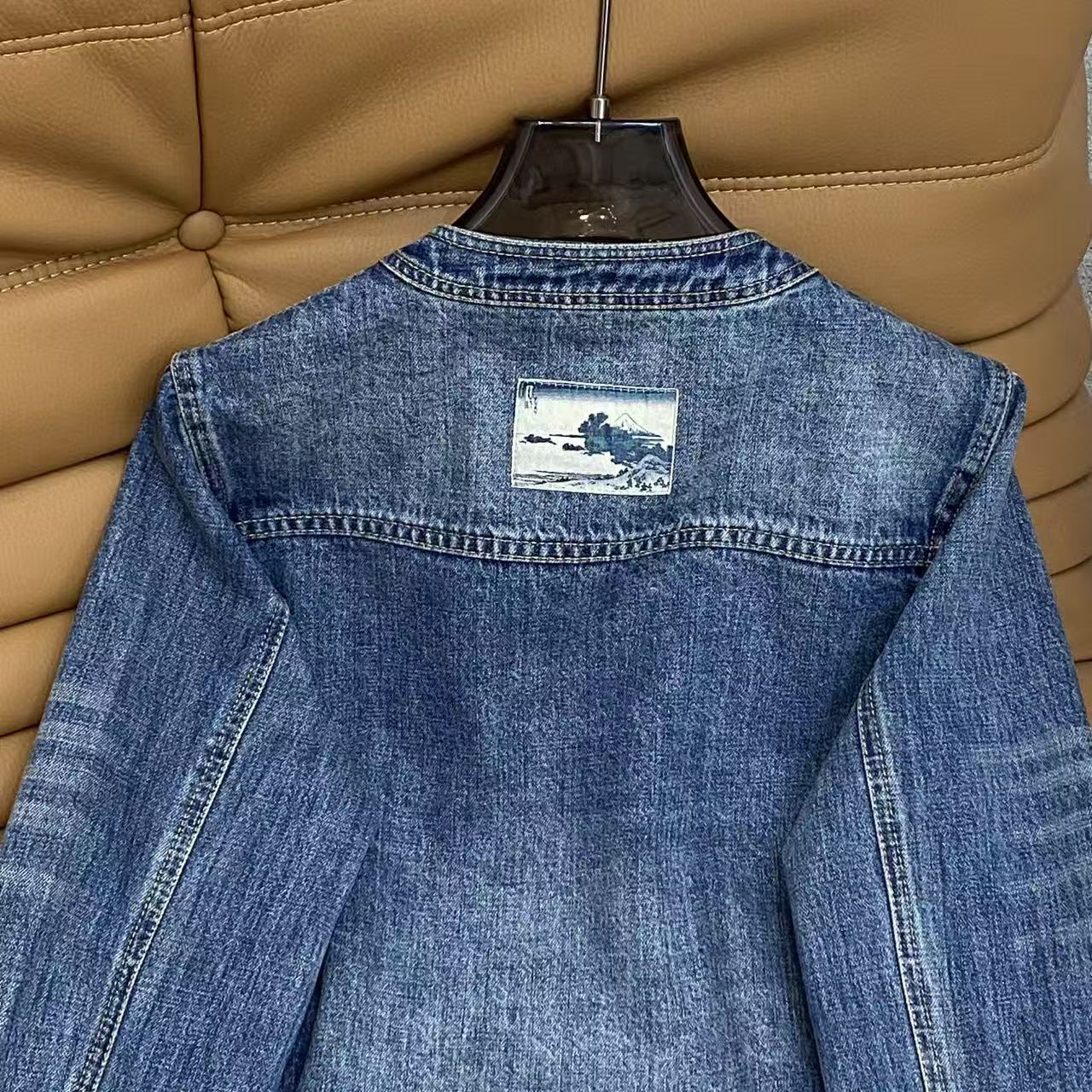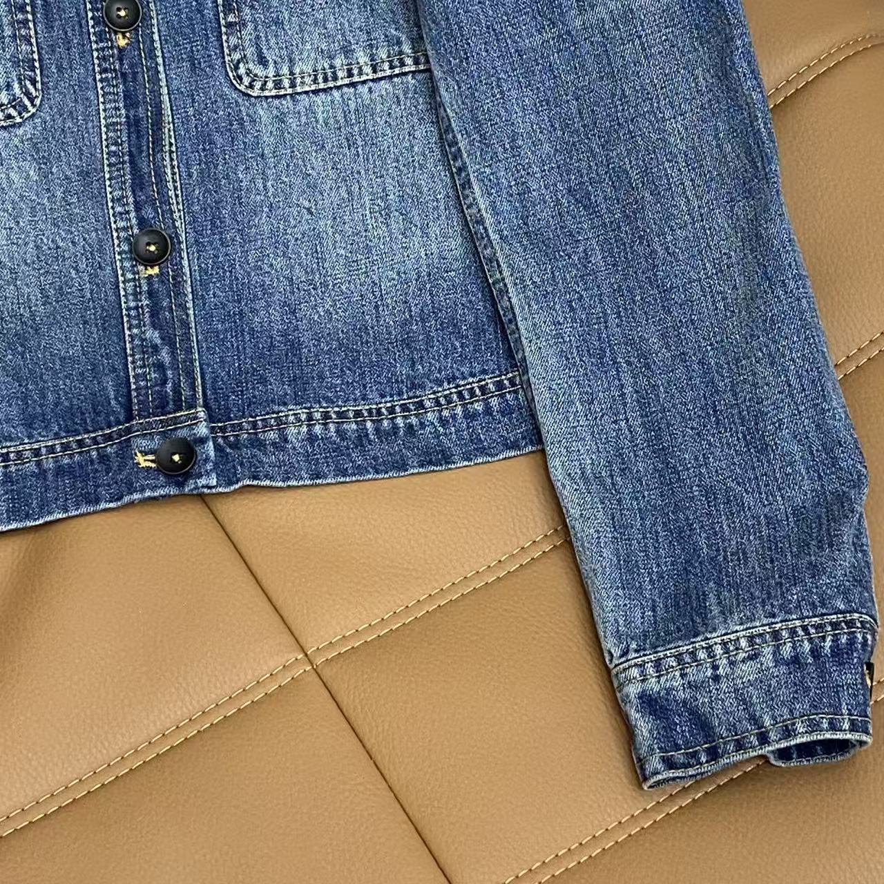 Details: Vintage denim jacket with round neck, metal pocket accents, loose fit for casual and refined looks, in denim blue.