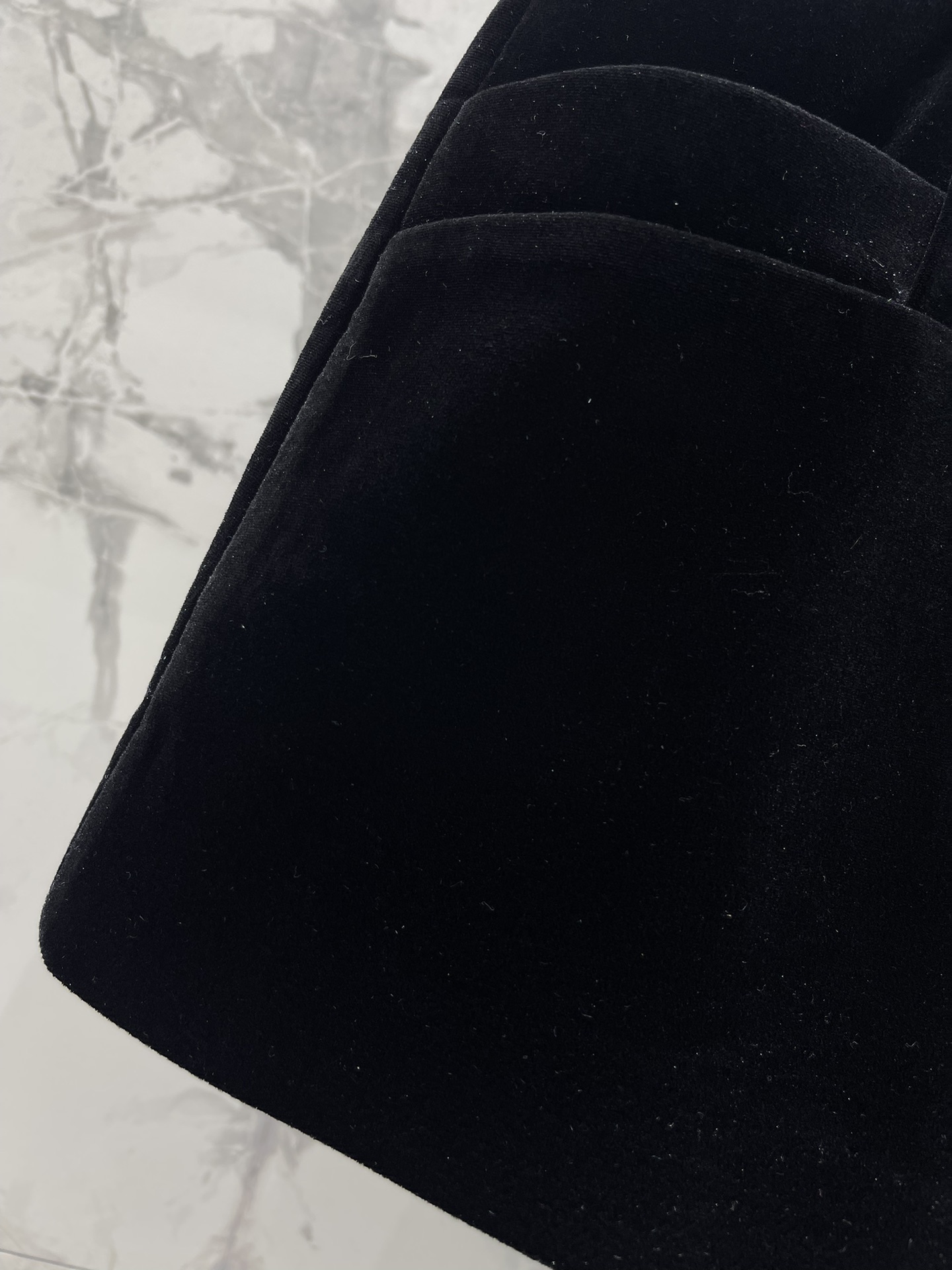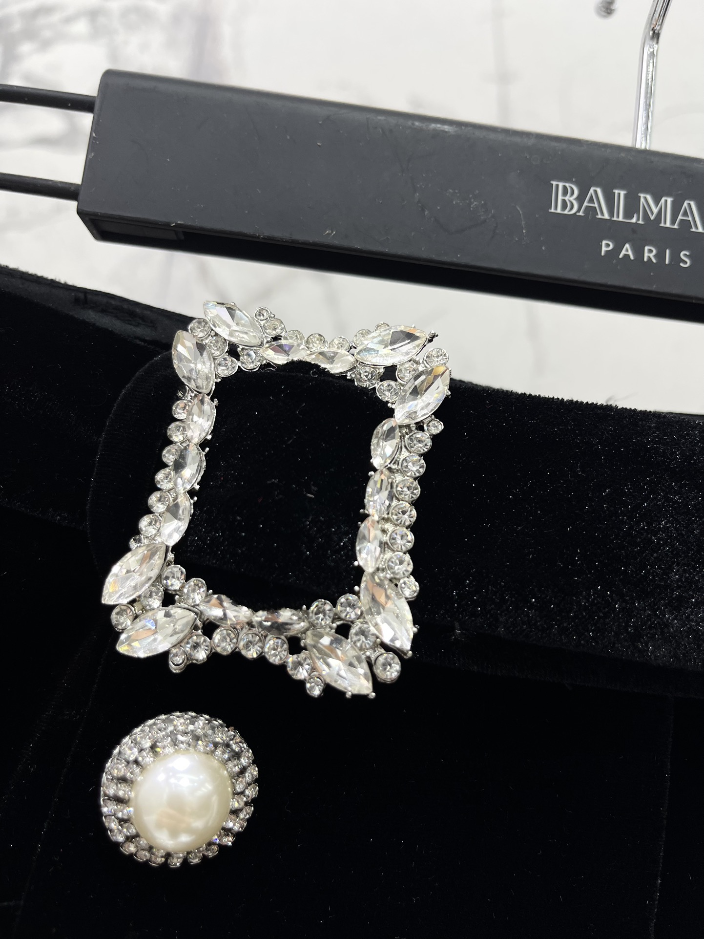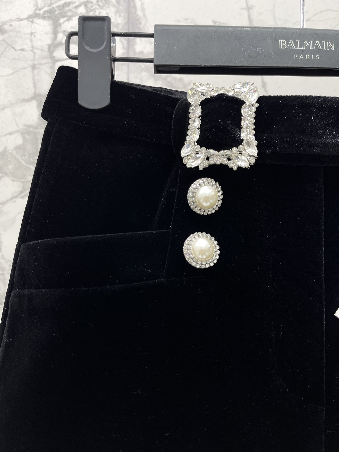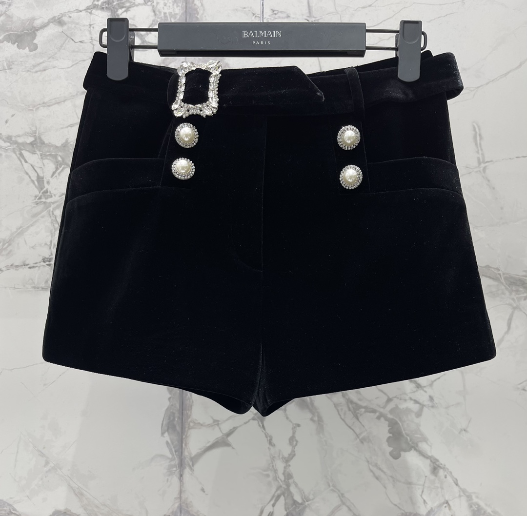 Details: High-waisted black velvet shorts with metal pearl buttons, flattering for all body types. High-end custom, fine workmanship