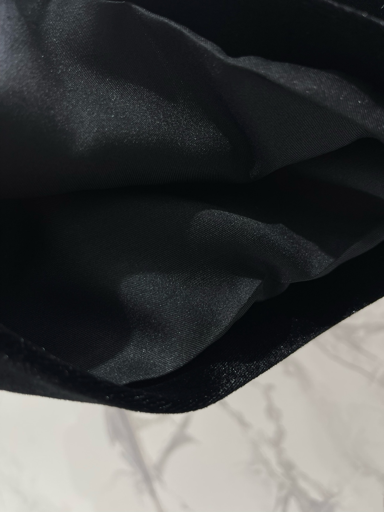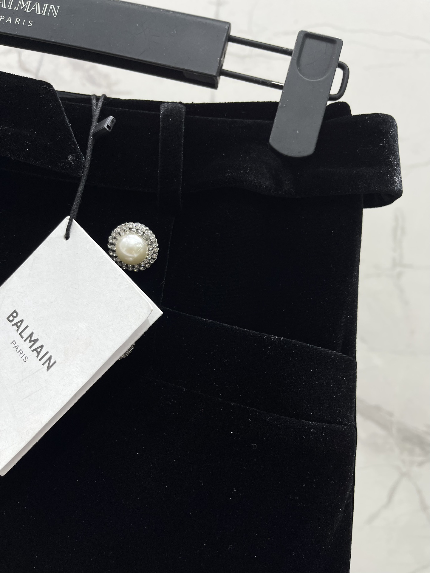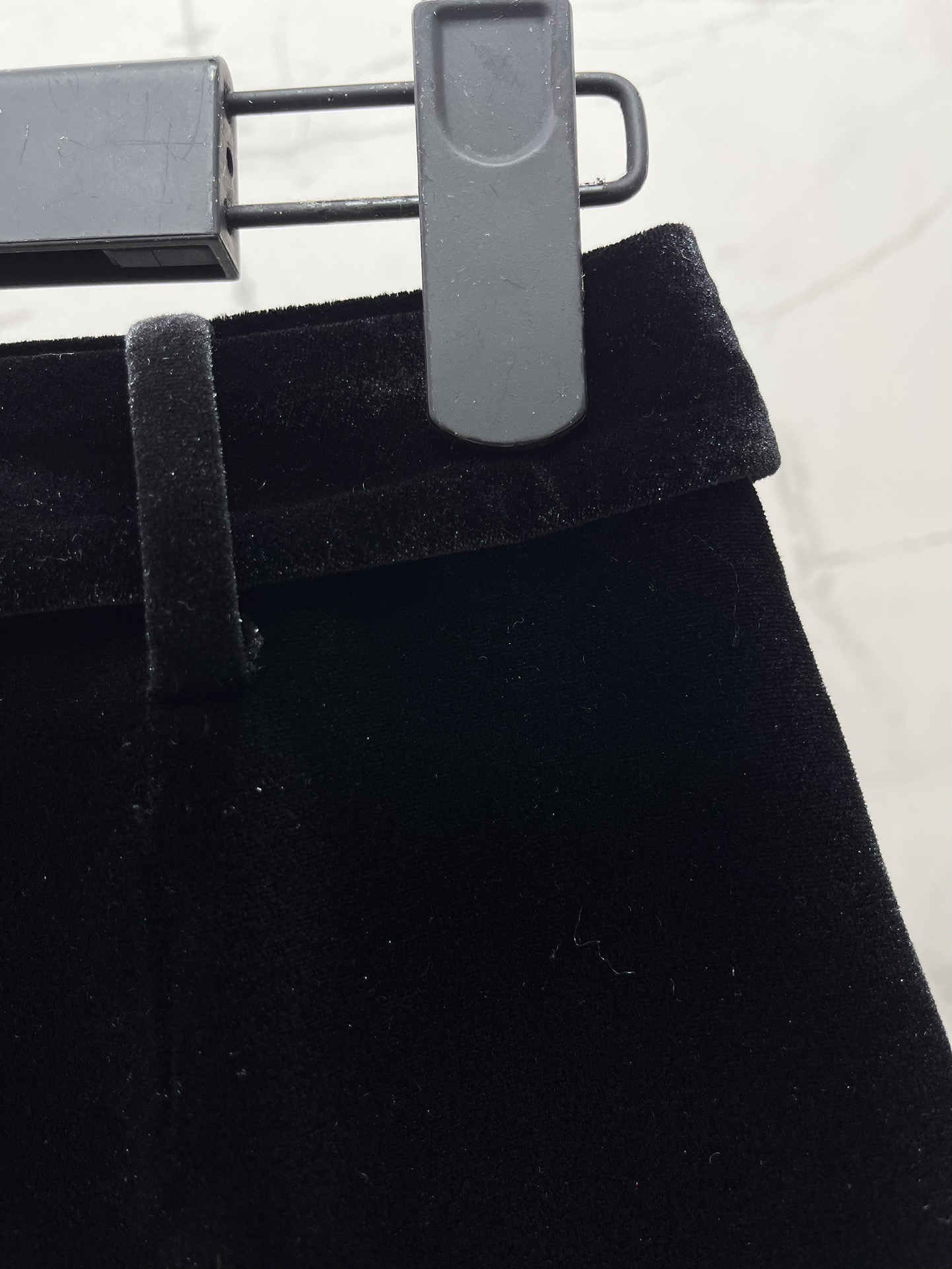 Details: High-waisted black velvet shorts with metal pearl buttons, flattering for all body types. High-end custom, fine workmanship