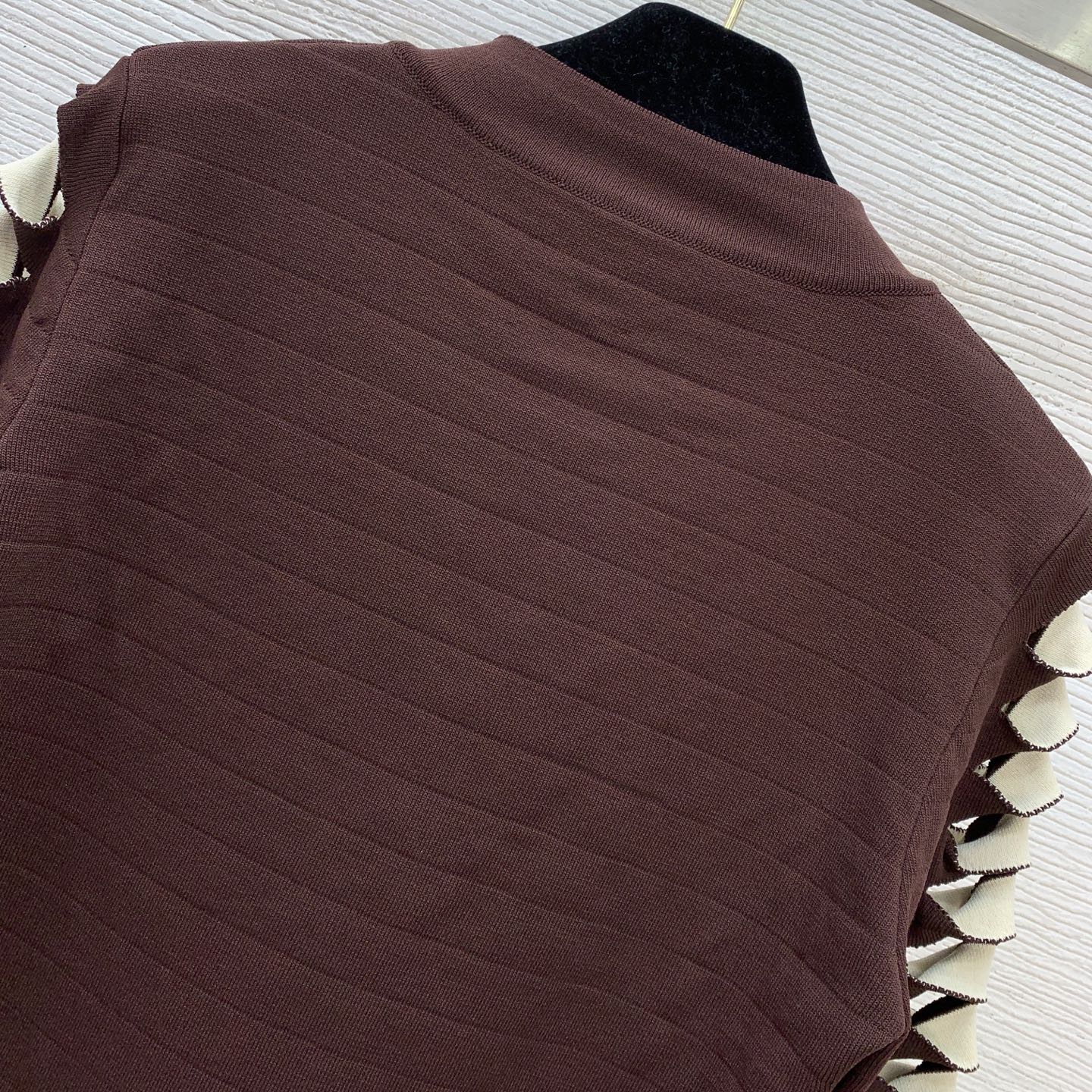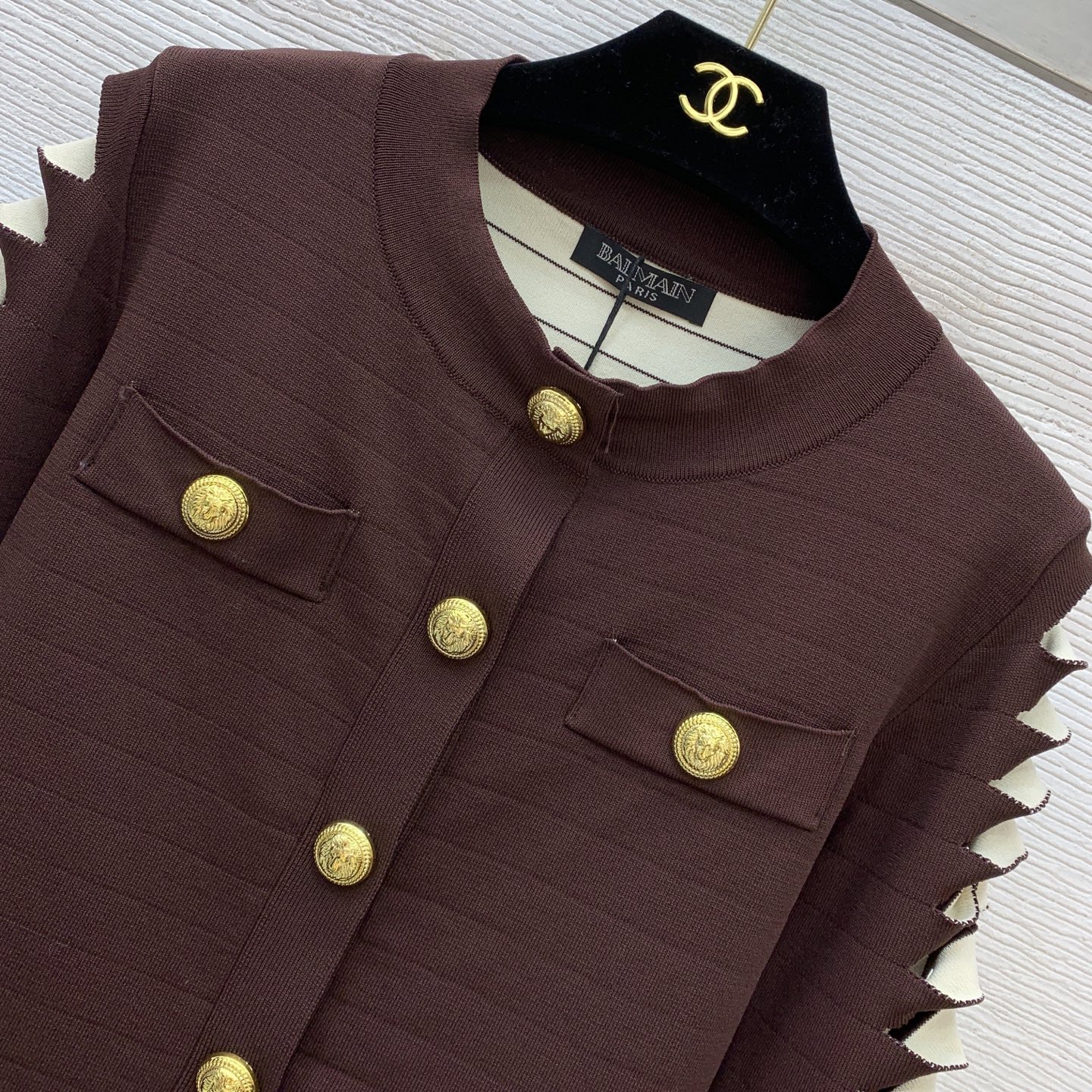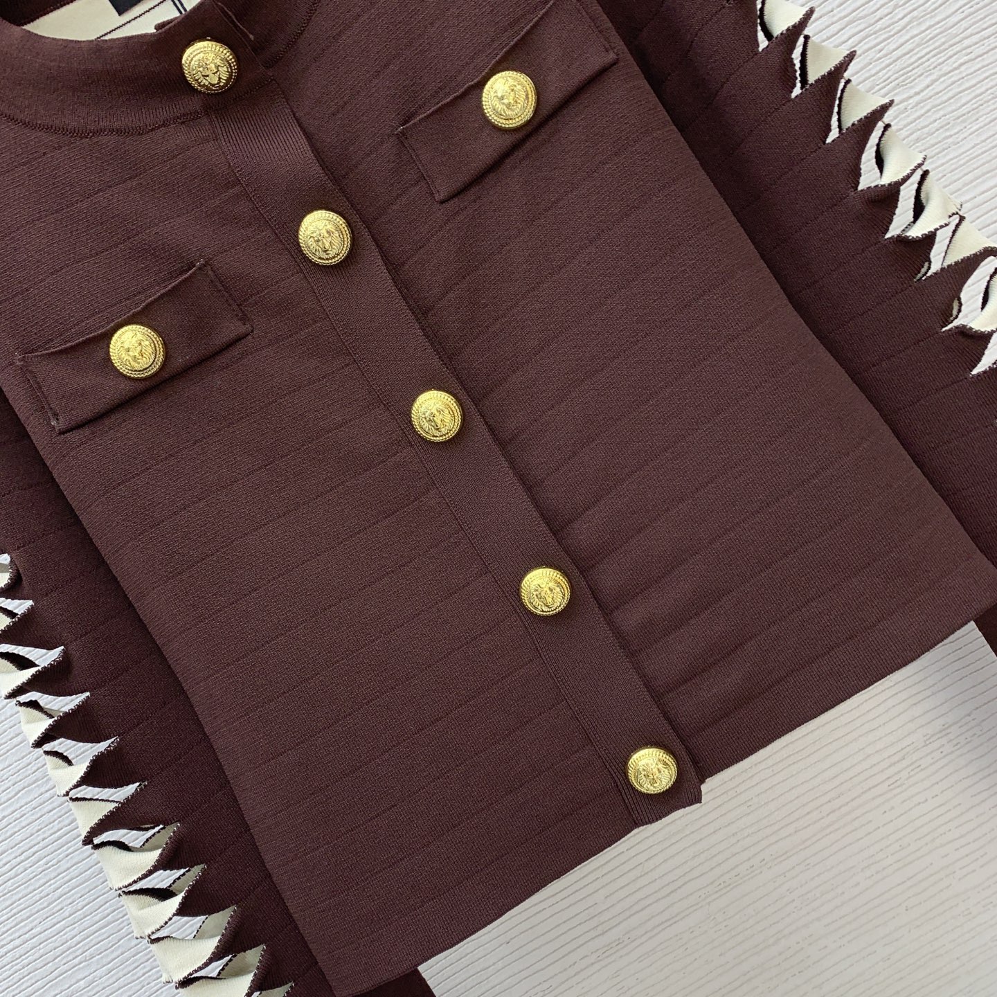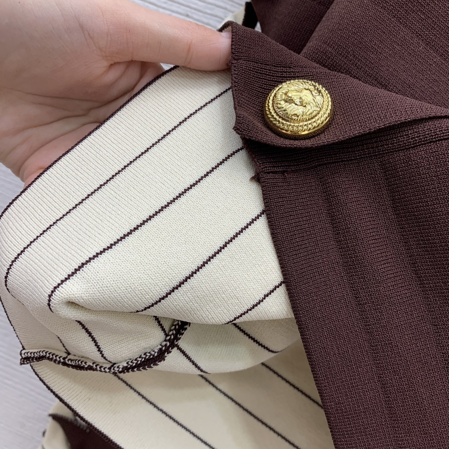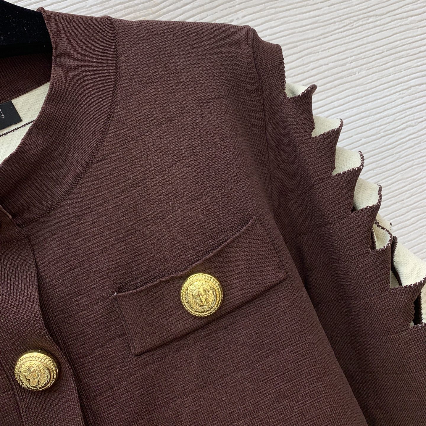 Details: Classic short knitted cardigan with lion-head buttons, in brown and black, M size