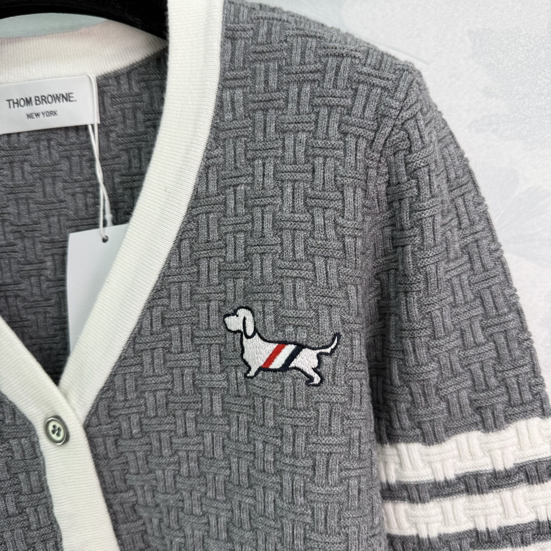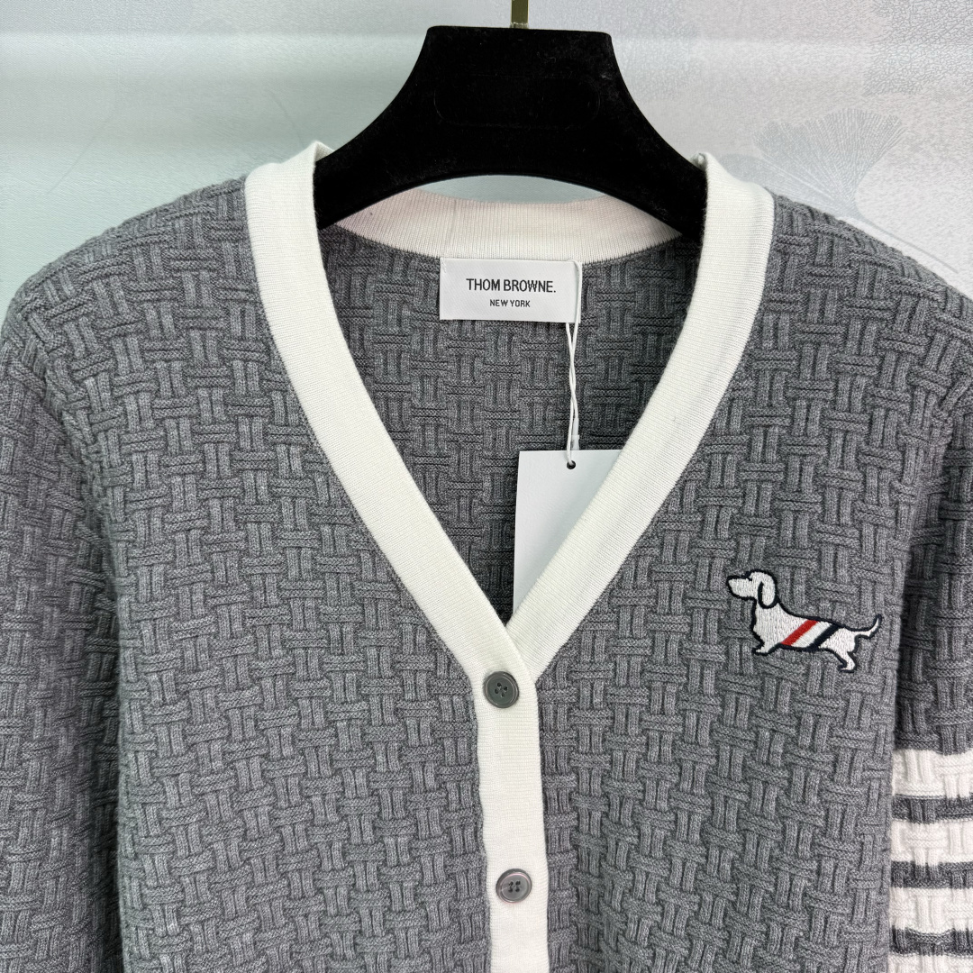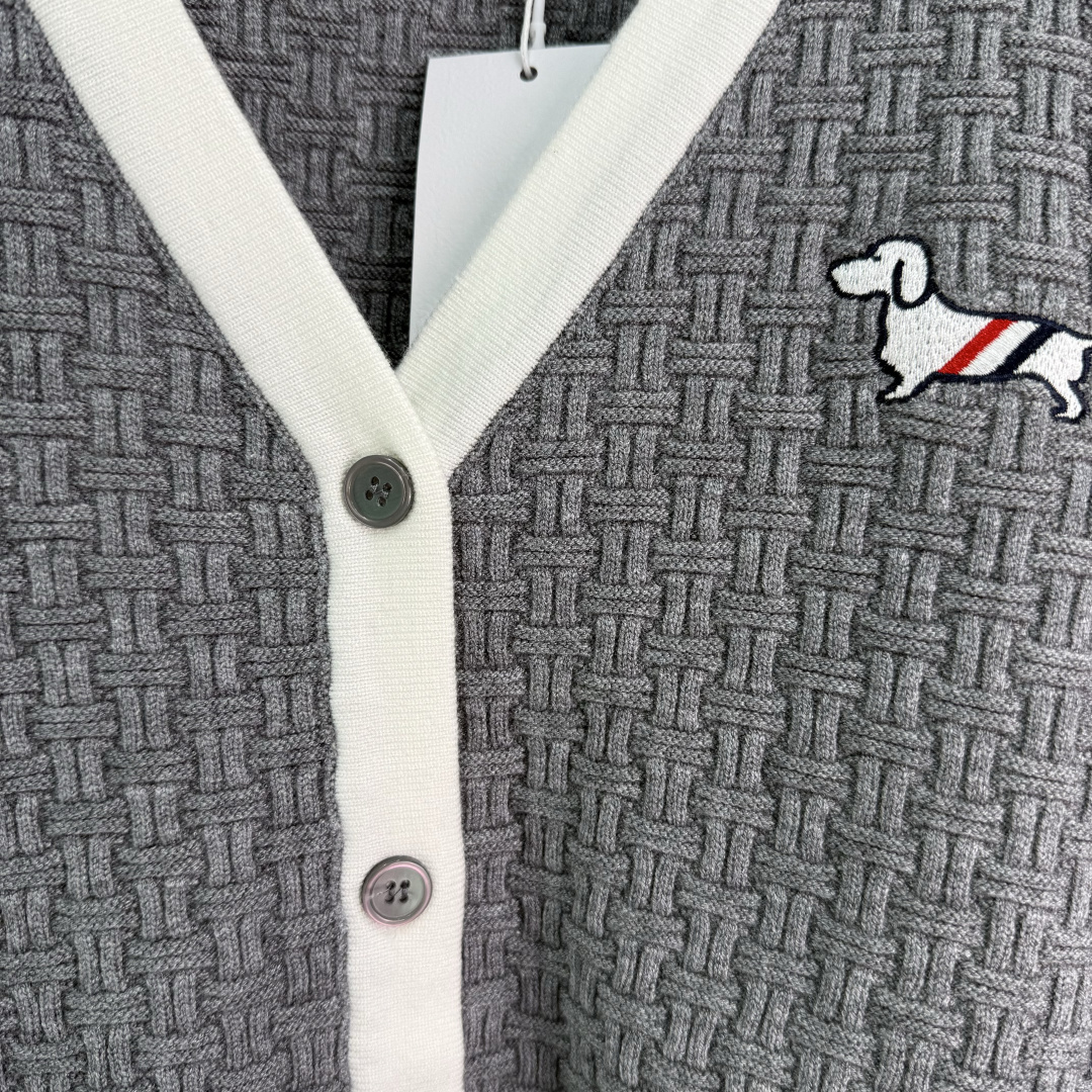 Details: Early autumn dog-embroidered knitted cardigan, classic striped cuffs, V-neck with white trim, slim fit.